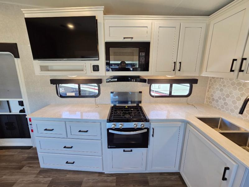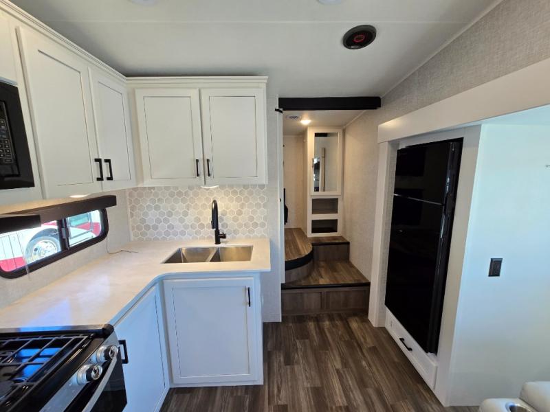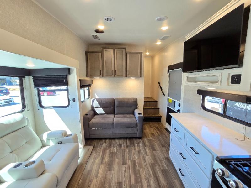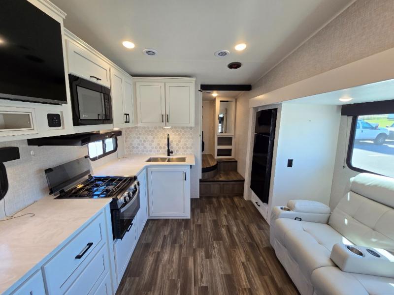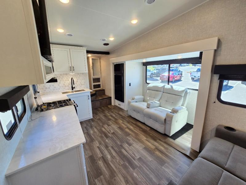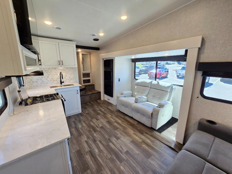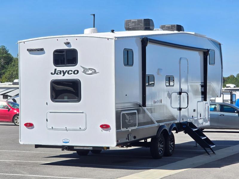 With any Eagle SLE fifth wheel by Jayco, you will enjoy a lighter tow weight, high-end finishes, and the same quality construction you've come to expect from Jayco! There is an Alpha Ply TPO roof membrane, a fully enclosed and heated underbelly, plus Stronghold VBL walls for added durability. There is also a rear 2" towing receiver outside, along with metal slam latch baggage doors, MORryde Step Above entry steps, and a Winegard Air 360 antenna with router prep if you want to stay connected as you camp. Once inside you'll enjoy the handcrafted and glazed door/drawer fronts, blackout pleated shades throughout, and residential vinyl flooring throughout with no carpet for an easier clean. The on-demand water heater, 30K BTU furnace, and 15K BTU "Whisper Quiet" A/C will ensure your comfort year around, and the optional Overland 1 Solar Package can be added if you need off-grid capabilities!
