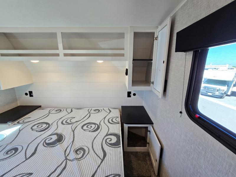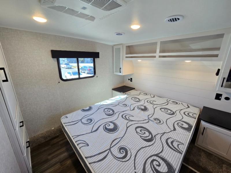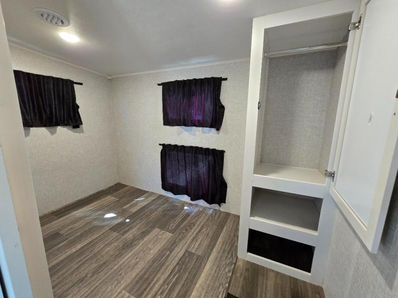 If you enjoy camping with a larger group, this fifth wheel is perfect for you! The rear bunkhouse includes double-size bunks, bunk storage and a wardrobe to keep this space tidy. You'll have the front private bedroom all to yourselves with a queen bed, and if you have any other guests, they can sleep on the tri-fold sofa and U-shaped dinette in the main living area. This space is also shared with the full kitchen, complete with a microwave and range, 12V refrigerator, and plenty of overhead cabinets for storage. After dinner, head outdoors to enjoy the 19' power awning with LED lights as you relax in your camp chairs!