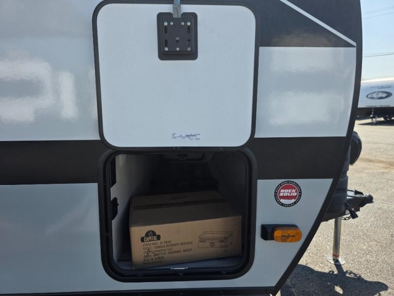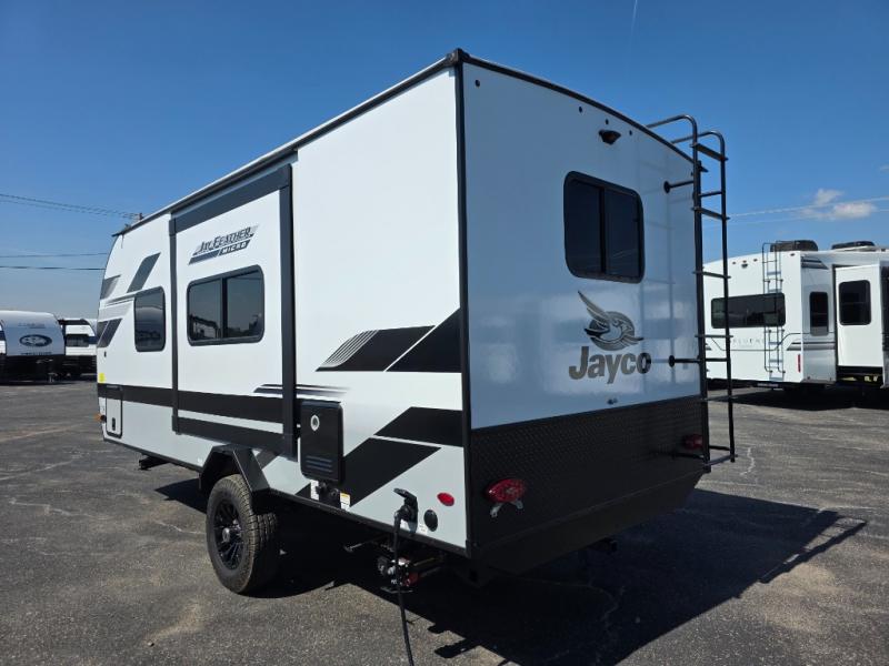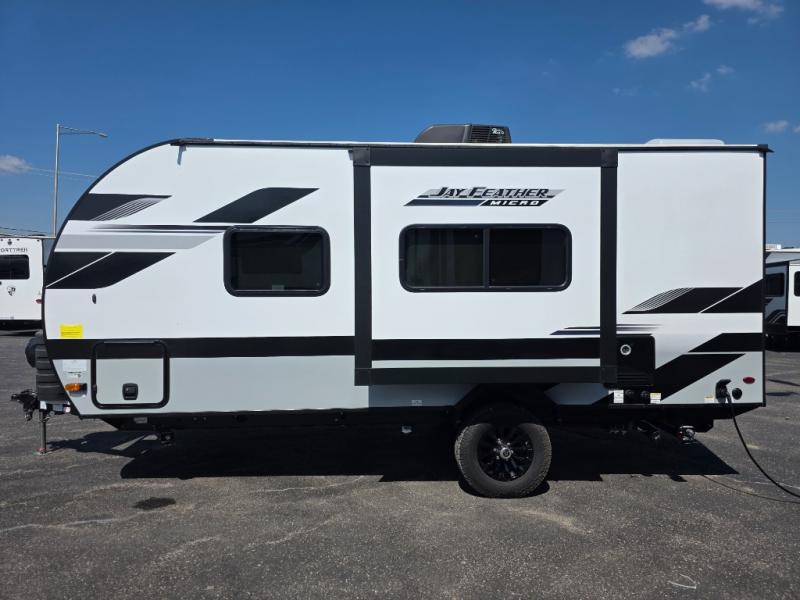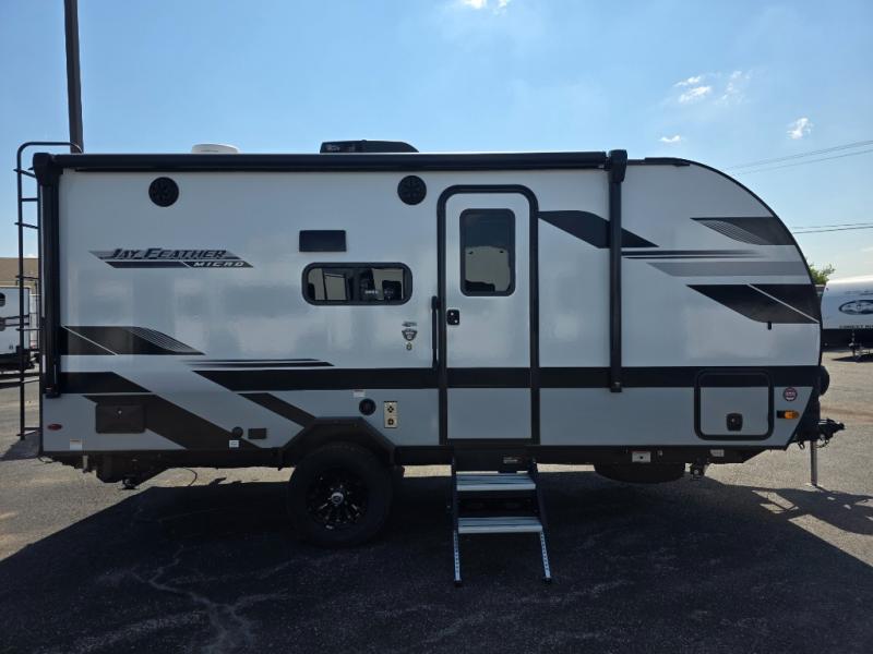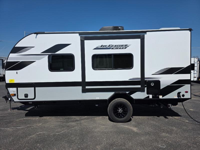 Jayco's Jay Feather Micro travel trailer is ready for adventure at the drop of a hat! The Climate Shield weather protection will let you camp well into the colder months and the Stronghold VBL with double-sized Azdel is ultra durable. The Jay Pro Package includes radial tires with self-adjusting brakes, a rear-mounted roof ladder, and the Overlander 1 Solar Package with a 200W solar panel. Additional exterior features include marine grade exterior speakers, a swing-out entry door assist handle, a power tongue jack, and more! Inside, you will love the 4-inch high-density dinette cushions with vinyl backing for easy cleaning, along with the handcrafted hardwood door/drawer fronts, residential style kitchen countertops, and decorative roller shades with a reflective barrier for better insulation.