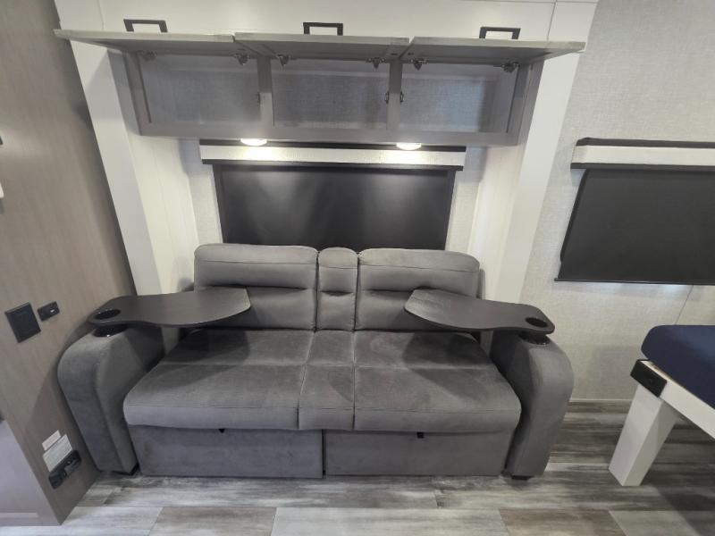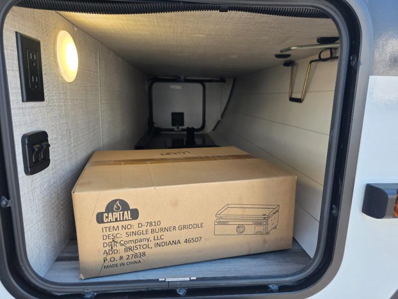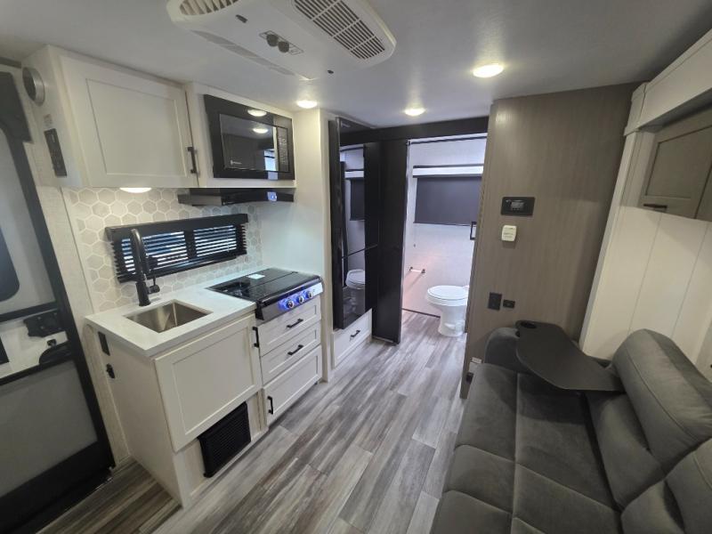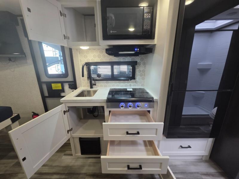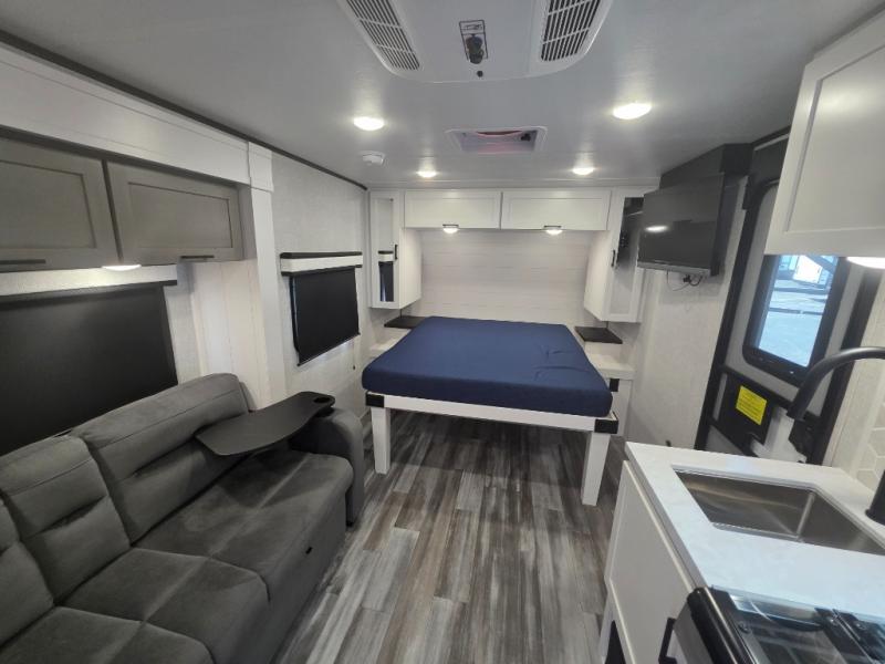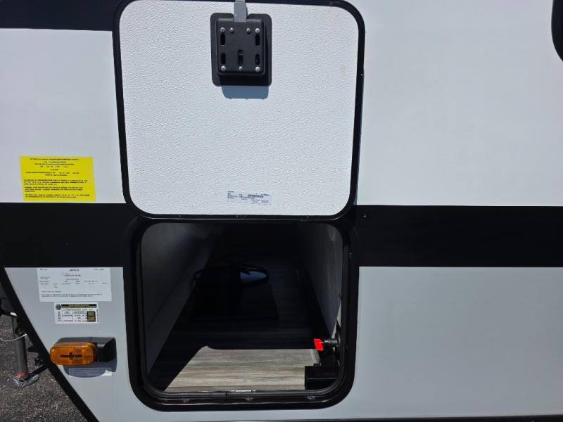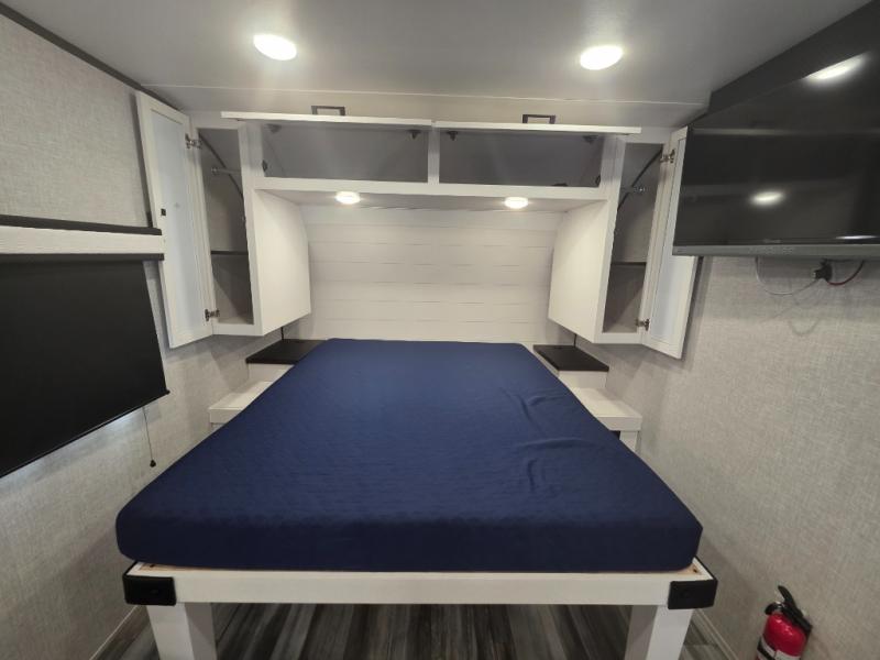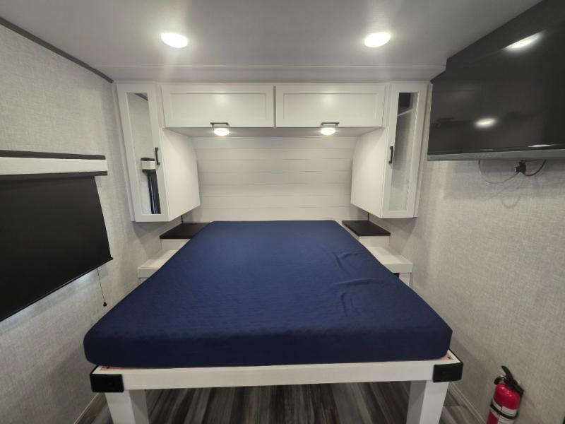 This cozy travel trailer is the perfect couple's trailer with space for an overnight guest on the jack-knife sofa with swivel tables. You'll sleep soundly each night on the front 60" x 75" queen bed, and there are dual wardrobes and nightstands to keep your space tidy. Whip up some eggs on the three burner cooktop, or use the microwave oven for instant oatmeal, plus there is an outside griddle for the JayPort system so you can make breakfast outside. You will also find plenty of storage space throughout, including a large kitchen pantry, overhead cabinets, and exterior storage!