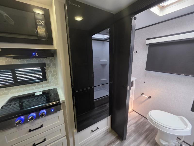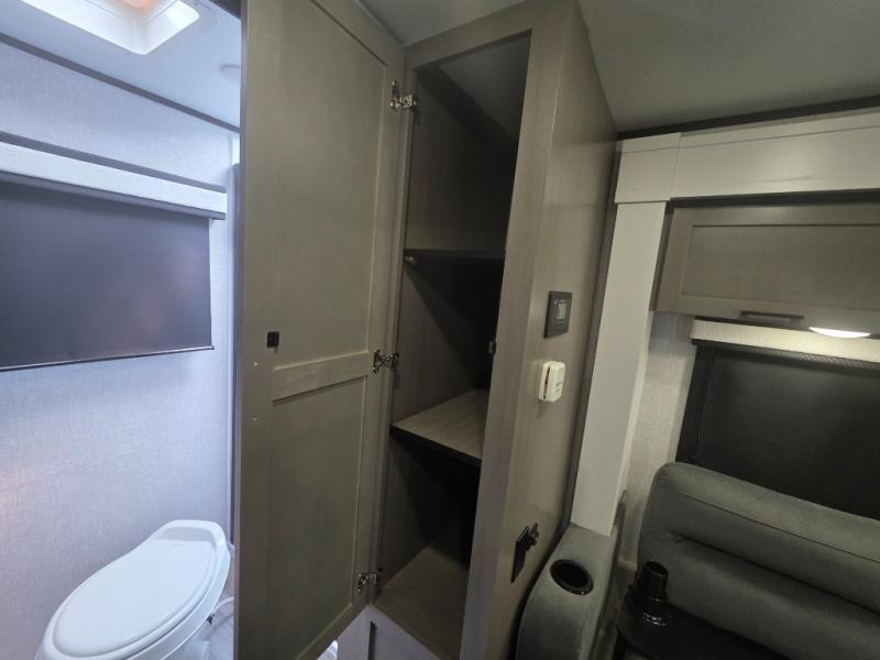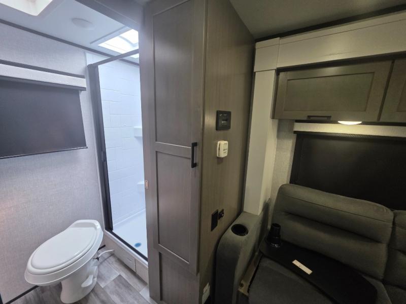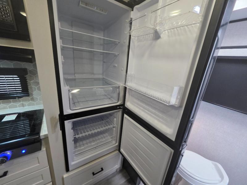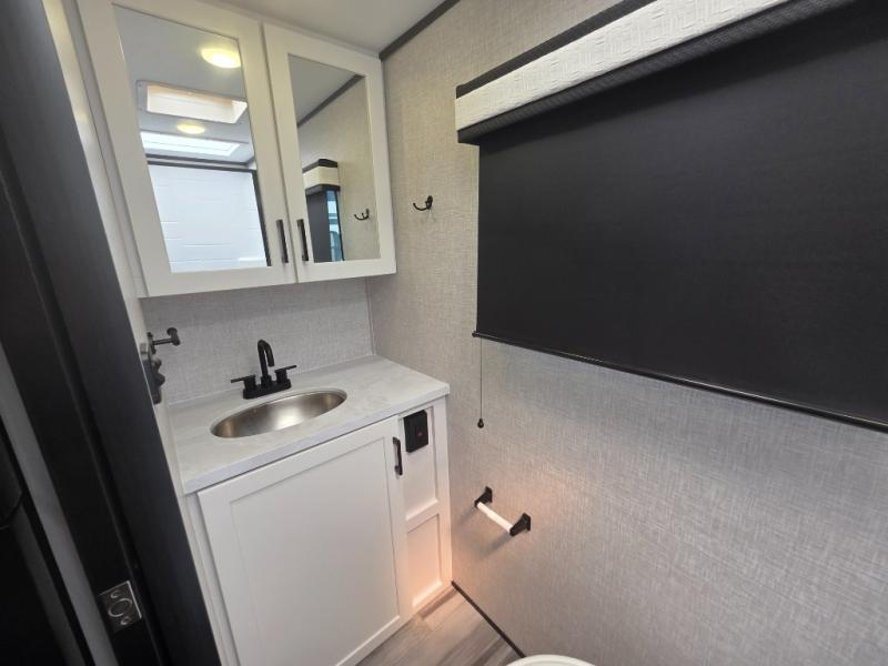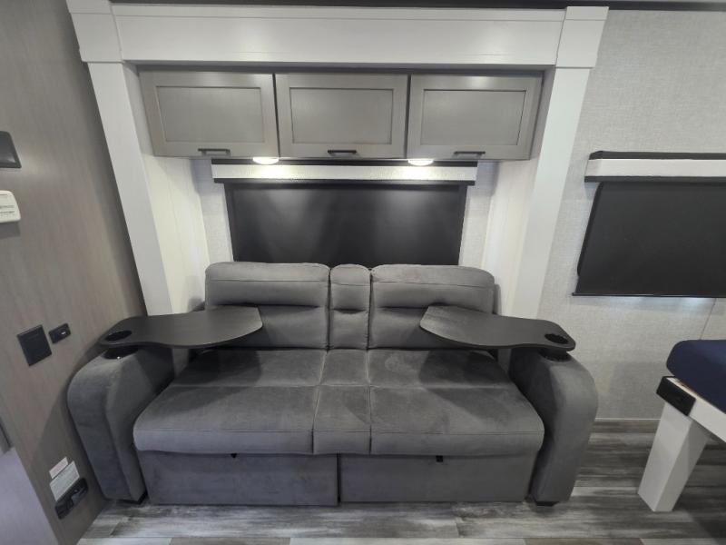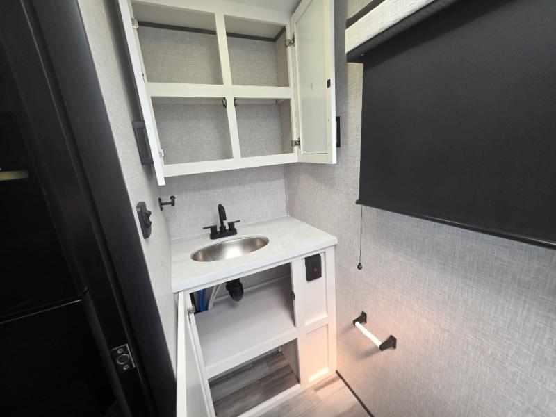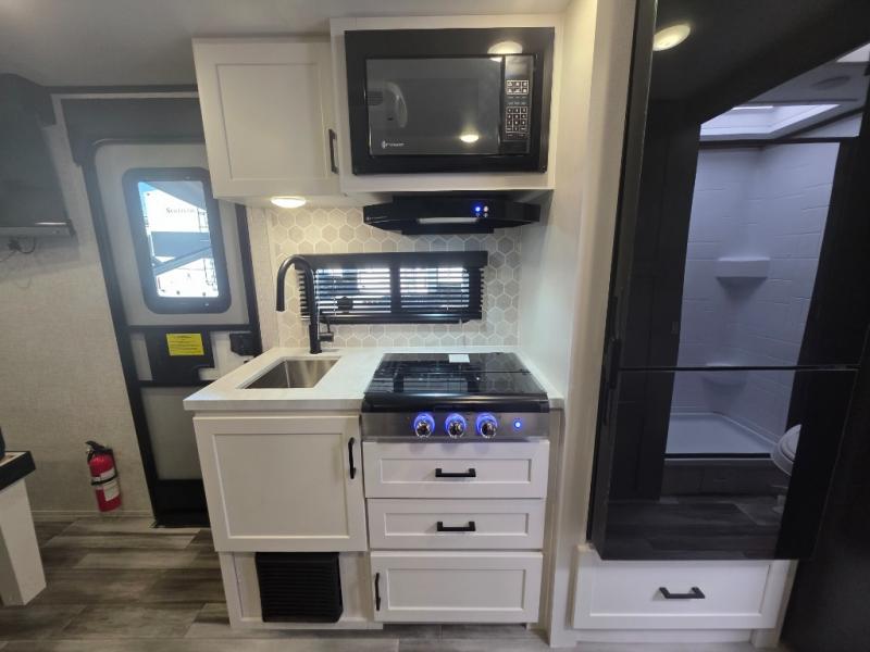 This cozy travel trailer is the perfect couple's trailer with space for an overnight guest on the jack-knife sofa with swivel tables. You'll sleep soundly each night on the front 60" x 75" queen bed, and there are dual wardrobes and nightstands to keep your space tidy. Whip up some eggs on the three burner cooktop, or use the microwave oven for instant oatmeal, plus there is an outside griddle for the JayPort system so you can make breakfast outside. You will also find plenty of storage space throughout, including a large kitchen pantry, overhead cabinets, and exterior storage!