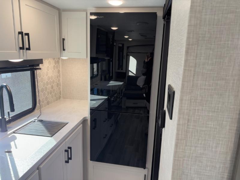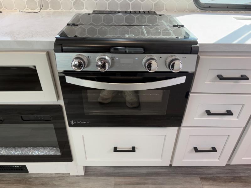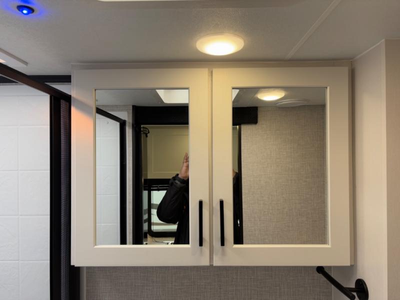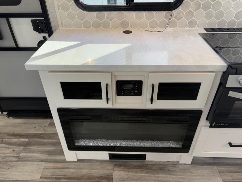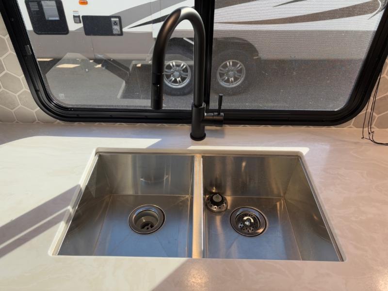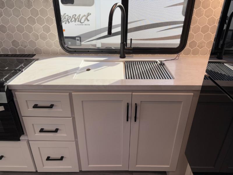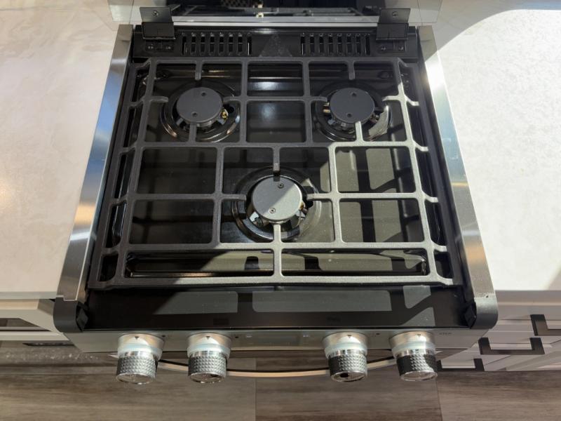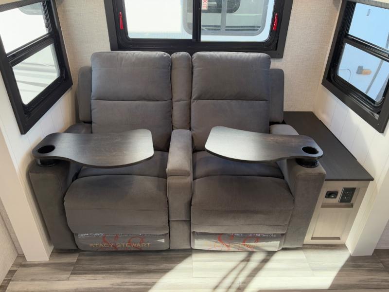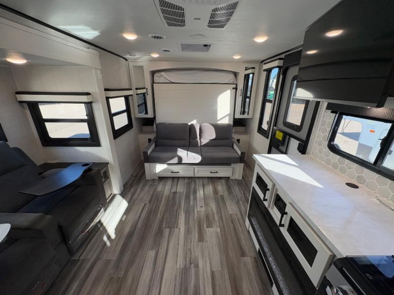 This travel trailer offers a lot of possibilities! During the day, relax in the spacious front living area with a jackknife sofa plus a pair of theater seats, both positioned for a great view of the entertainment center. A fully equipped kitchen with stainless steel double bowl sink, microwave, and three-burner range makes meals easy, and the theater seats have swing-out trays for you to dine. At night, pull down the 60" x 75" Murphy bed for a great night's sleep! wardrobes on either side of the bed provide plenty of storage for your clothing. The rear corner bath is convenient and private, and offers a linen closet plus a medicine cabinet for additional storage capability. Outside you will be sheltered from the sun beneath the 15' awning, and there is an LP Quick Connect if you want to hook up your personal grill.