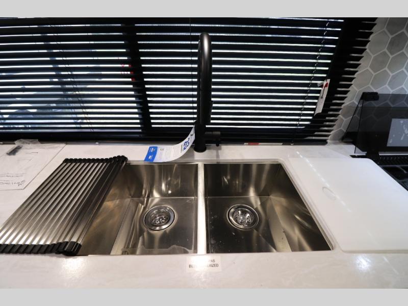 The 2025 Jayco Jay Feather 23RK’s sleek, aerodynamic design features durable fiberglass exterior walls with Jayco’s signature Stronghold VBL™ vacuum-bonded lamination for added strength and durability. It sports a modern color scheme, with striking graphics and protective diamond plating on the front for rock resistance. You’ll appreciate the frameless tinted windows, which provide a stylish look and added privacy. The dual axle design ensures a smooth, stable towing experience, even on rugged terrain. The power tongue jack and stabilizer jacks make setup a breeze, getting you from road to relaxation in no time.