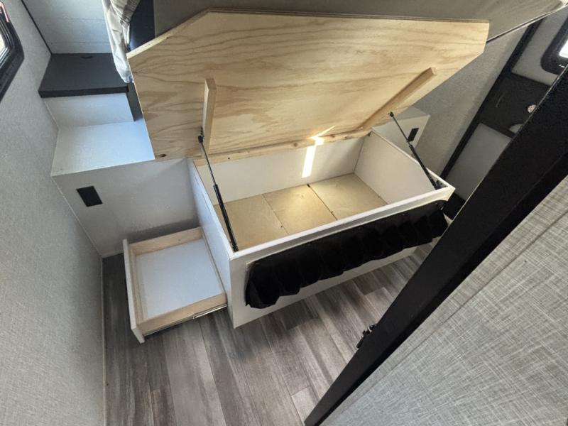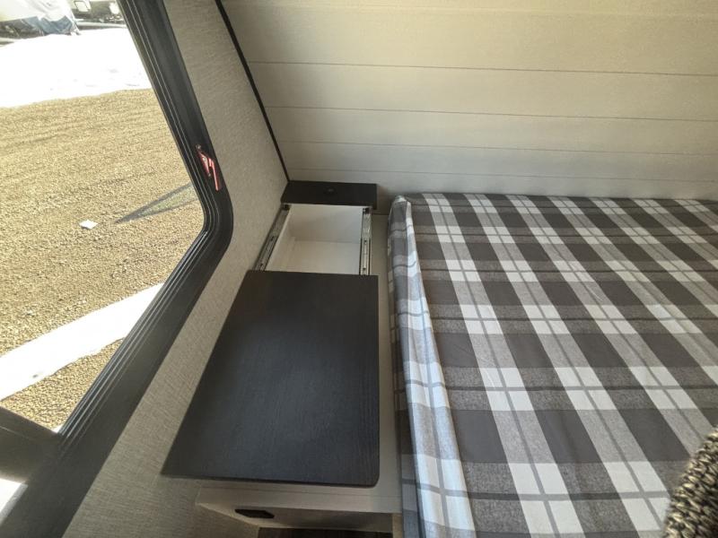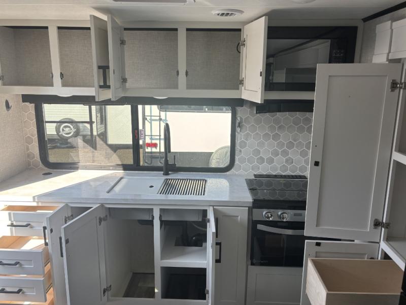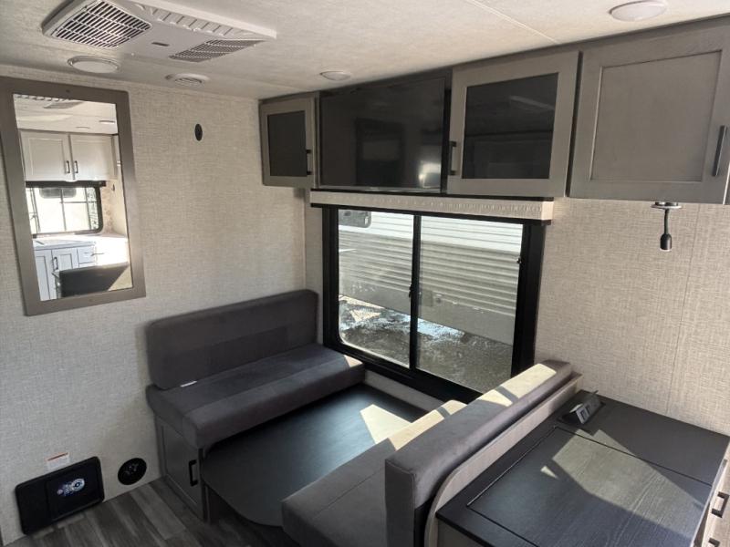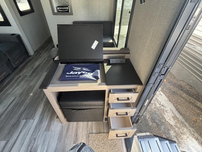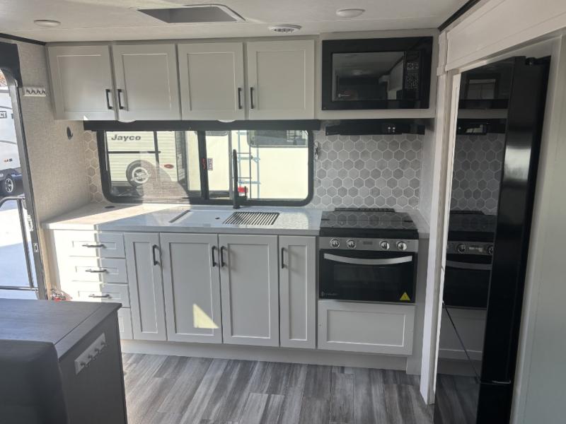 With any Jay Feather travel trailer by Jayco, you will enjoy lightweight towing, convenient exterior amenities, and at-home comforts inside! The Overlander 1 Solar Package included within the Jay Sport Package comes with a 200W solar panel and a 30-amp digital controller so you can enjoy some off-grid camping. There is also a modern graphics package with a dual-colored sidewall, LCI Solid Step fold-down aluminum tread steps on the main entry door, and Climate Shield 0 -100° F tested weather insulation package that will allow you to camp in all sorts of climates. The Customer Value Package will make time outdoors easier than ever with a power tongue jack and a Rock Solid stabilizer system. More exterior features include a Keyed-Alike locking system, marine grade exterior speakers, a Magnum Truss roof system, and the list goes on! And we haven't even touched on the interior comforts, like the residential style seamless countertops and vinyl flooring throughout, decorative backsplash, handcrafted hardwood door/drawer fronts, and multiple USB charging ports to keep you going!