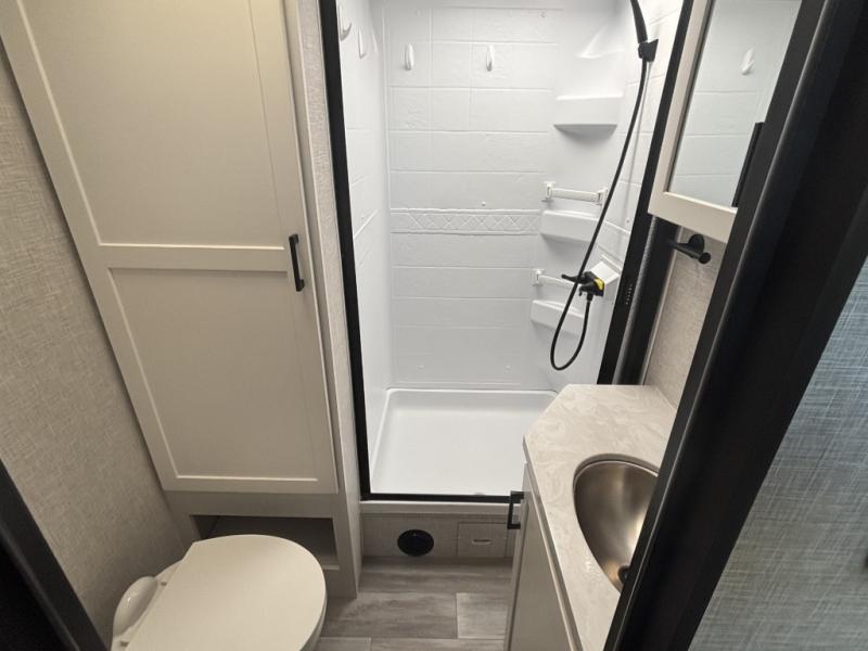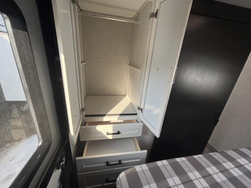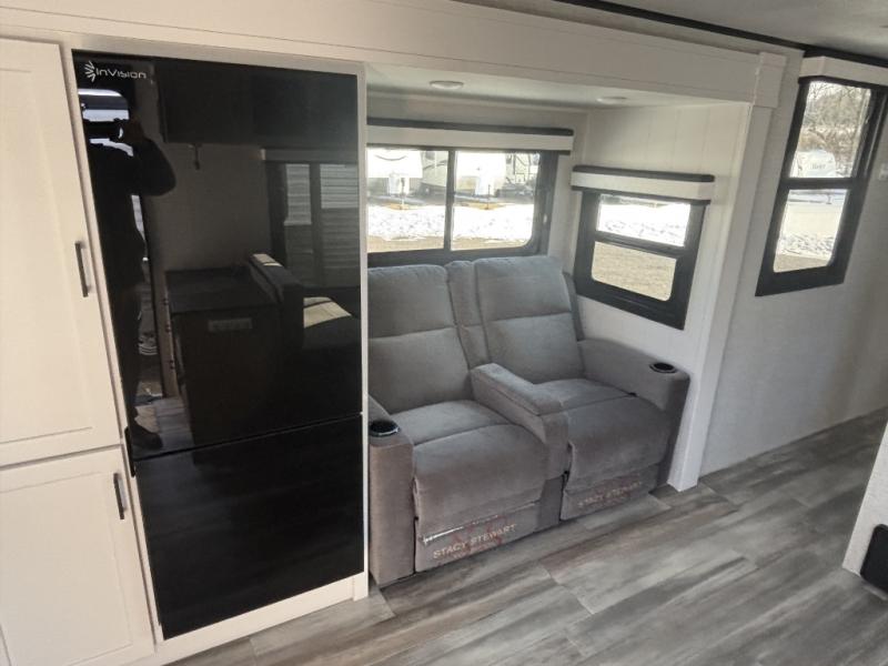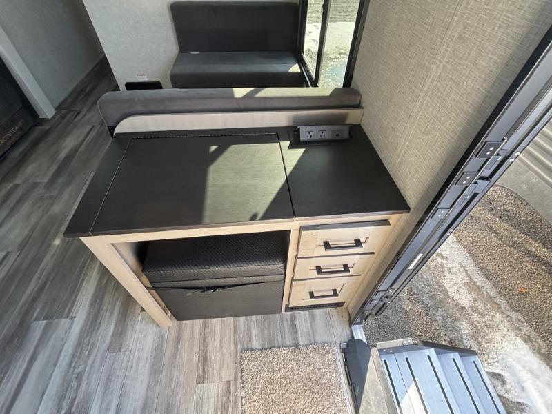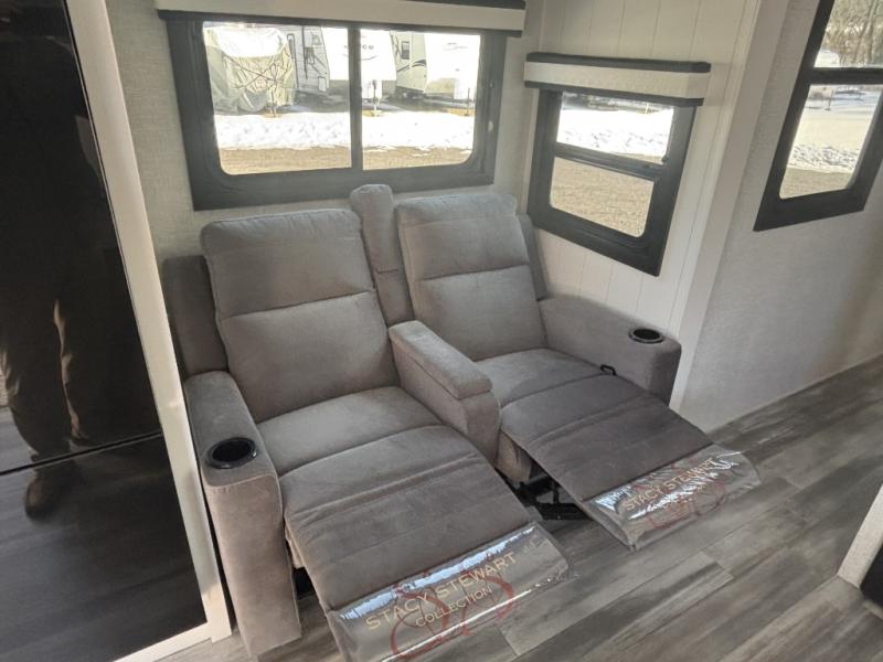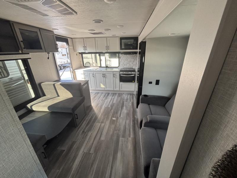 The chef of your group will love this rear kitchen trailer with generous counter space to prep meals! Your crew can dine at the booth dinette or under the 20' power awning with LED lights, and when you're ready to relax, the theater seat with table trays will provide comfort. There is also a storage/desk cabinet with a pull-out ottoman that will allow you to utilize this space however you need it! The spacious full bath will let you clean up each day, and the front private bedroom is sure to make you feel at home. Here, you'll find a queen bed, three wardrobes, plus one of the dual entry doors for added convenience!