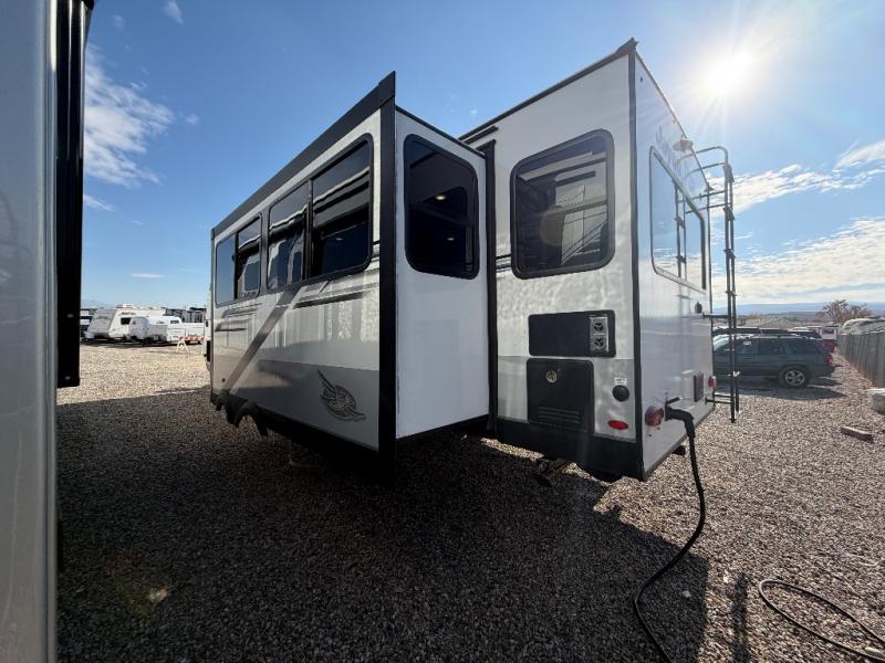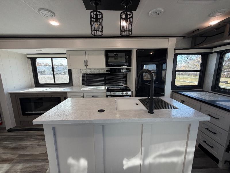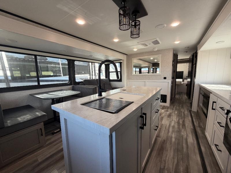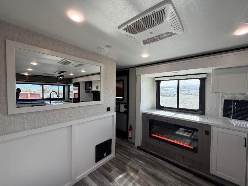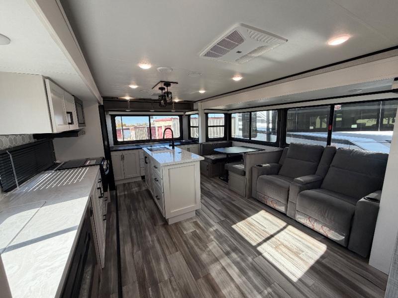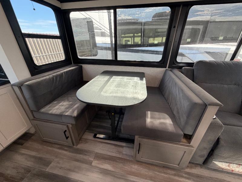 Perfect for weekend trips or extended stays, this travel trailer is the one! You will find a rear desk with an ottoman plus overhead storage if you plan to work while you're away from home. The dual opposing slides in the combined kitchen and living area will create an open floorplan, and the kitchen island will provide the chef of your group with more counter space. There is a tri-fold sofa and booth dinette that double as seating and sleeping space, and the full bath onboard will keep everyone clean. Don't overlook the front private bedroom with a queen bed and plenty of storage space for your belongings!