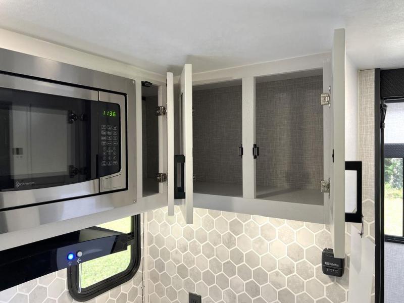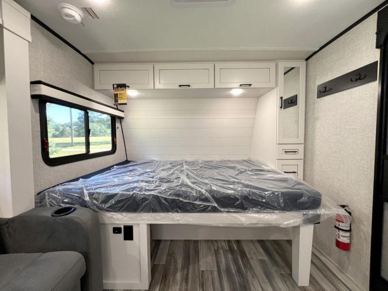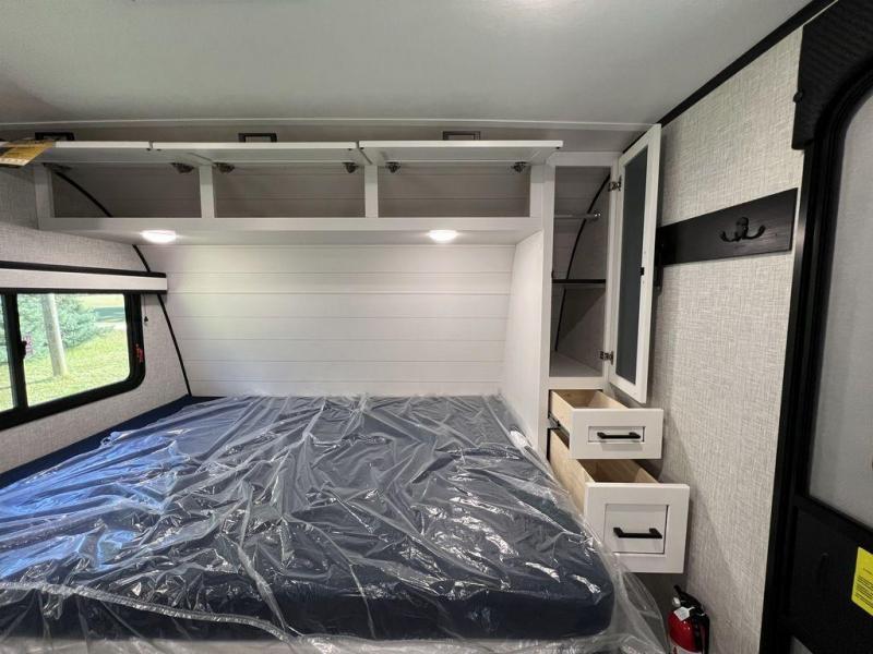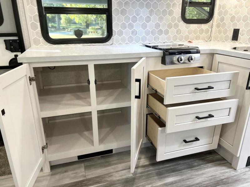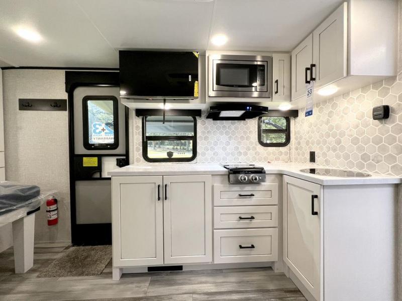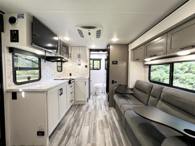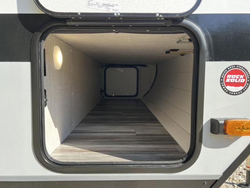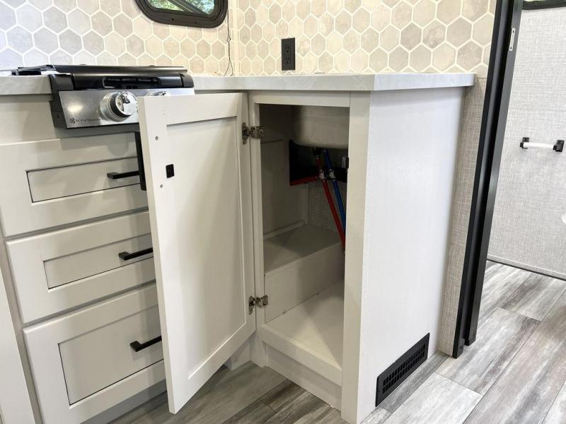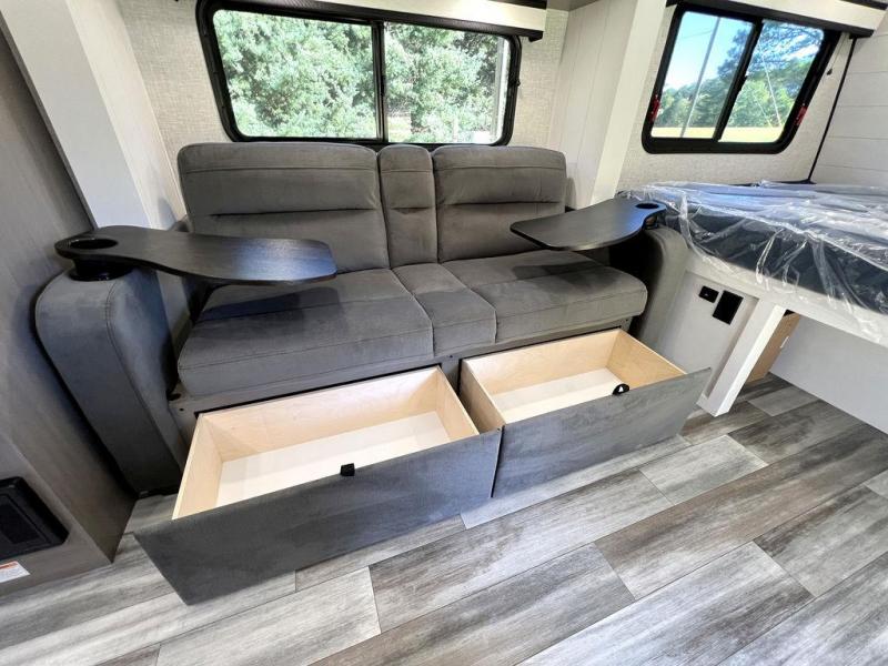 This travel trailer will feel just like home with its front queen bed, full rear bath, and fully-equipped kitchen! There is a jack-knife sofa slide out where you can relax each day, and there are swivel tables so you can enjoy meals here too. The LED Smart TV will let you stay in and watch movies if the weather isn't cooperating, or you can grab the fishing gear from the outside storage and weather the storm! You'll also find plenty of interior storage in the multiple overhead cabinets and the bath medicine cabinet!
