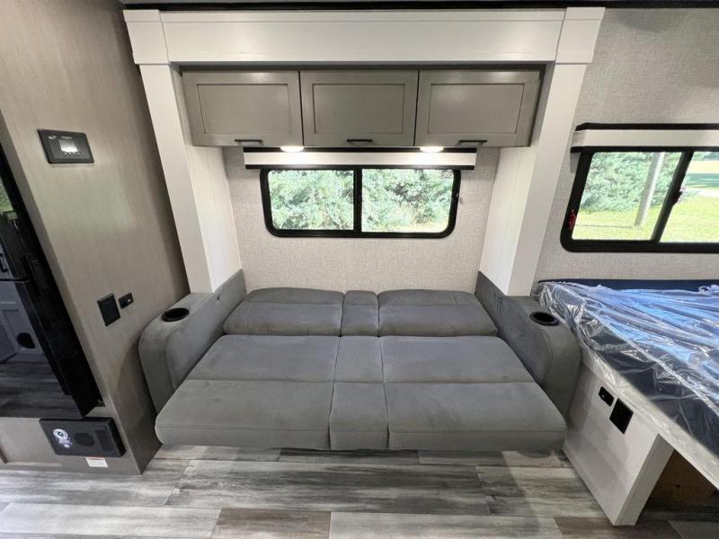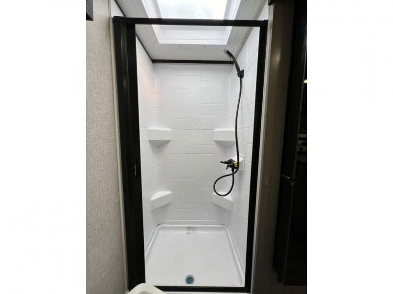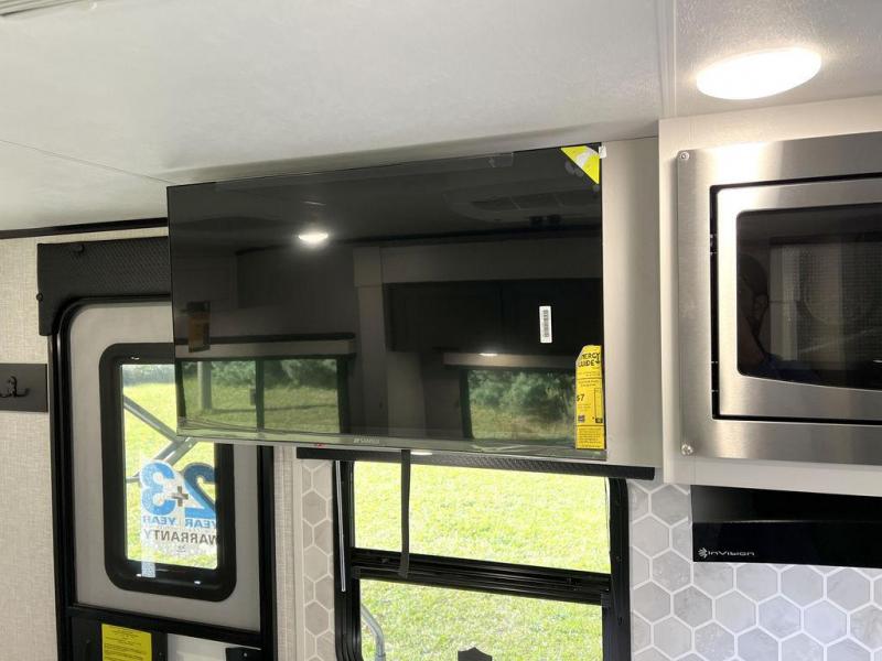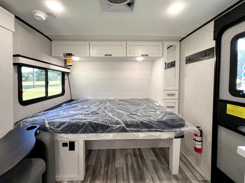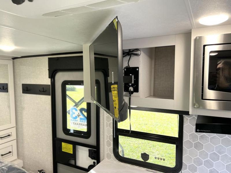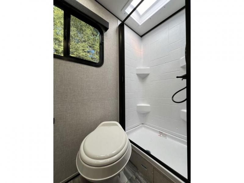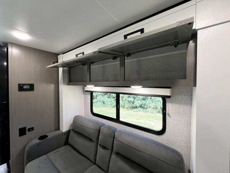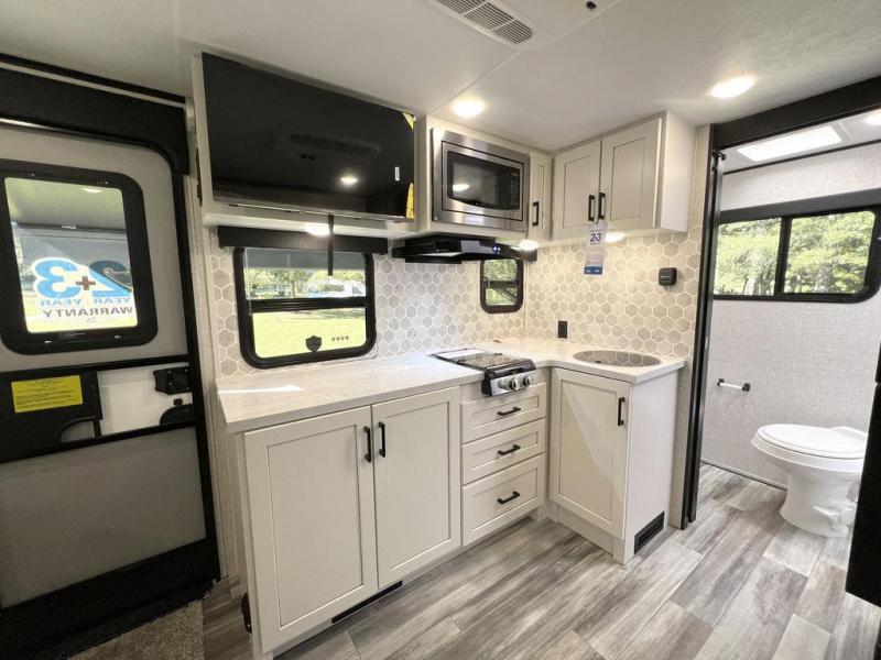 This travel trailer will feel just like home with its front queen bed, full rear bath, and fully-equipped kitchen! There is a jack-knife sofa slide out where you can relax each day, and there are swivel tables so you can enjoy meals here too. The LED Smart TV will let you stay in and watch movies if the weather isn't cooperating, or you can grab the fishing gear from the outside storage and weather the storm! You'll also find plenty of interior storage in the multiple overhead cabinets and the bath medicine cabinet!