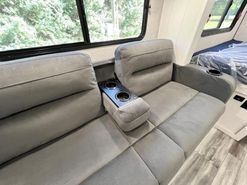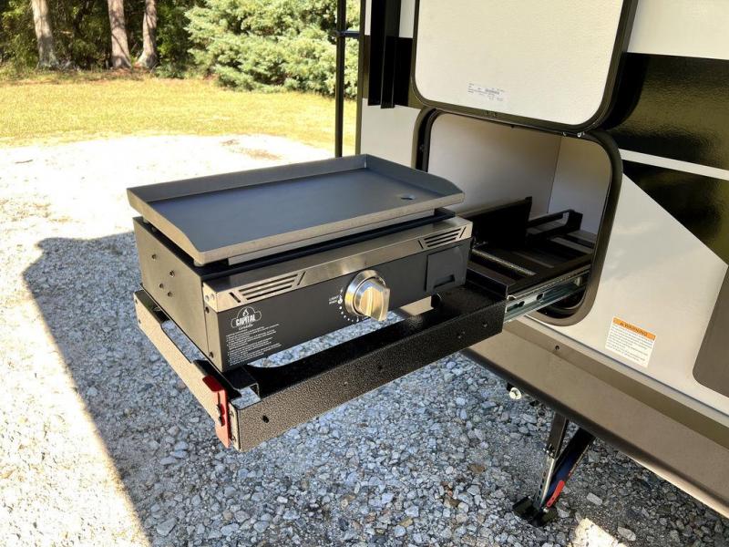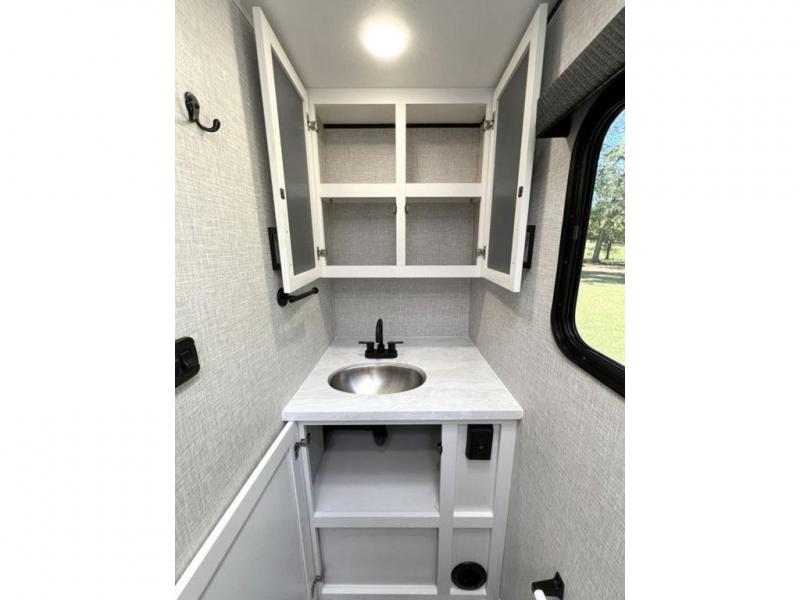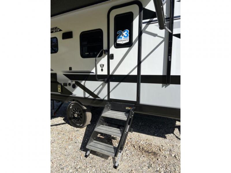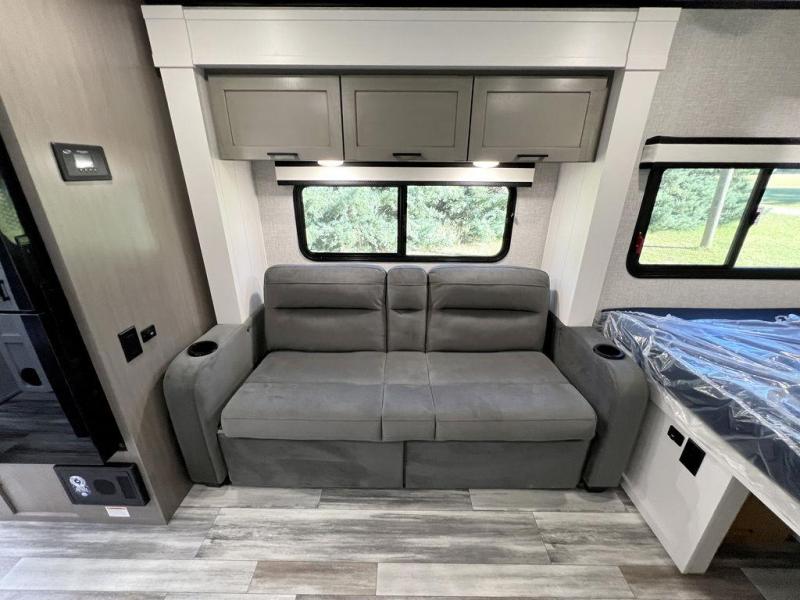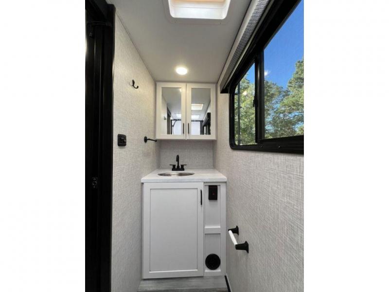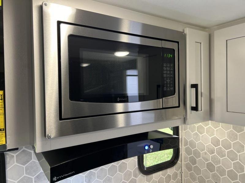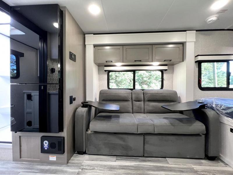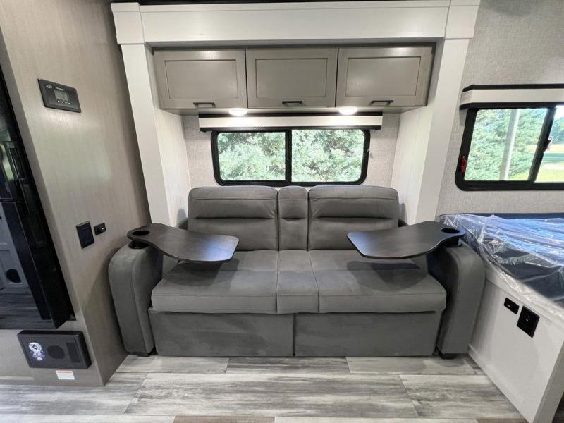 This travel trailer will feel just like home with its front queen bed, full rear bath, and fully-equipped kitchen! There is a jack-knife sofa slide out where you can relax each day, and there are swivel tables so you can enjoy meals here too. The LED Smart TV will let you stay in and watch movies if the weather isn't cooperating, or you can grab the fishing gear from the outside storage and weather the storm! You'll also find plenty of interior storage in the multiple overhead cabinets and the bath medicine cabinet!