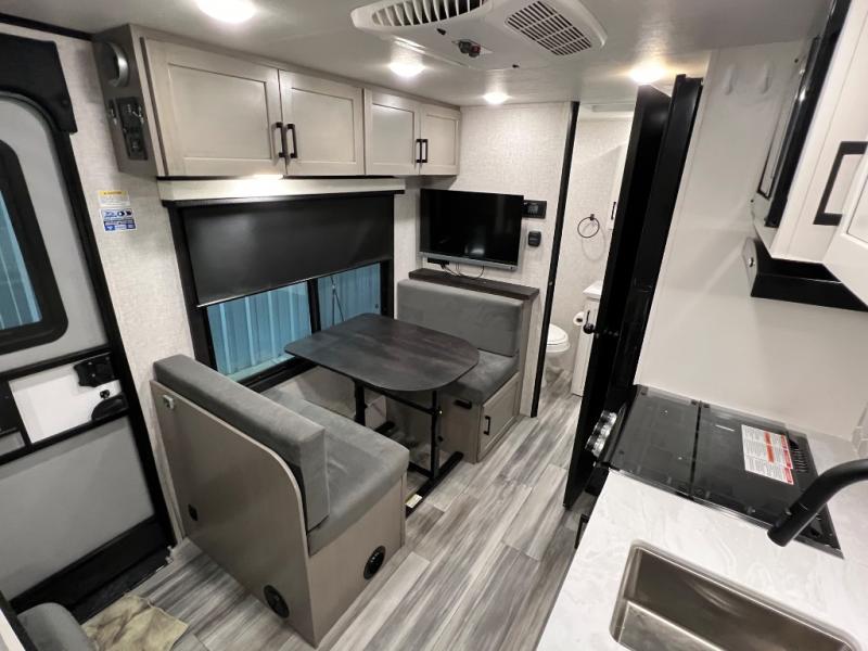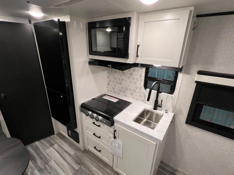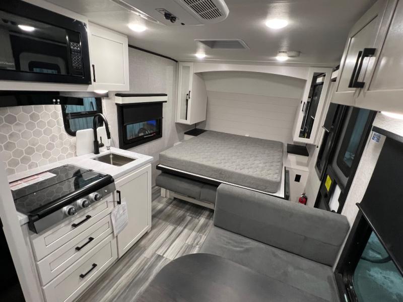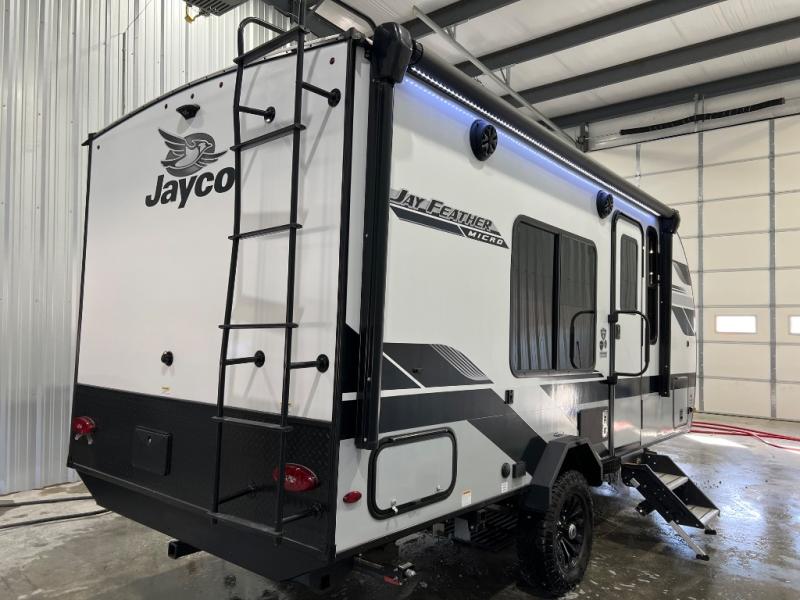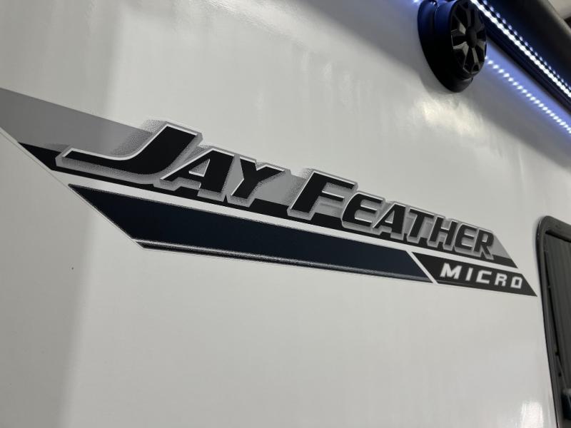 Jayco's Jay Feather Micro travel trailer is ready for adventure at the drop of a hat! The Climate Shield weather protection will let you camp well into the colder months and the Stronghold VBL with double-sized Azdel is ultra durable. The Jay Pro Package includes radial tires with self-adjusting brakes, a rear-mounted roof ladder, and the Overlander 1 Solar Package with a 200W solar panel. Additional exterior features include marine grade exterior speakers, a swing-out entry door assist handle, a power tongue jack, and more! Inside, you will love the 4-inch high-density dinette cushions with vinyl backing for easy cleaning, along with the handcrafted hardwood door/drawer fronts, residential style kitchen countertops, and decorative roller shades with a reflective barrier for better insulation.