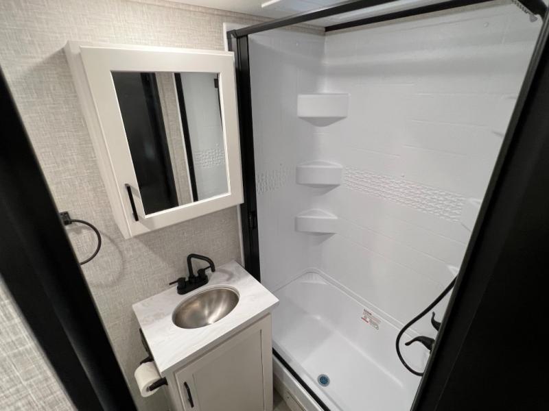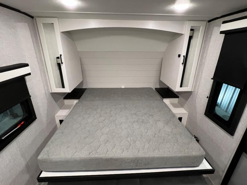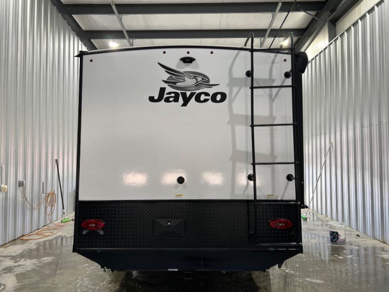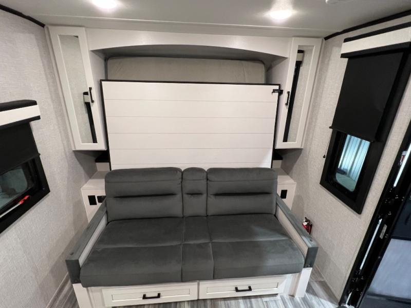 This versatile travel trailer is the perfect couple's trailer with space for an overnight guest on the booth dinette. The front sofa will provide space to relax during the day, and you can fold down the Murphy bed when you're ready to sleep. Whip up some eggs on the three burner cooktop, or use the microwave oven for instant oatmeal, plus there is an outside griddle for the JayPort system so you can make breakfast outside. This model also includes a spacious full rear bath with a shower, medicine cabinet, plus a large linen closet for clean towels.