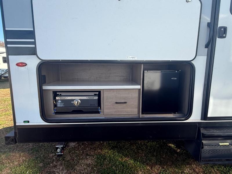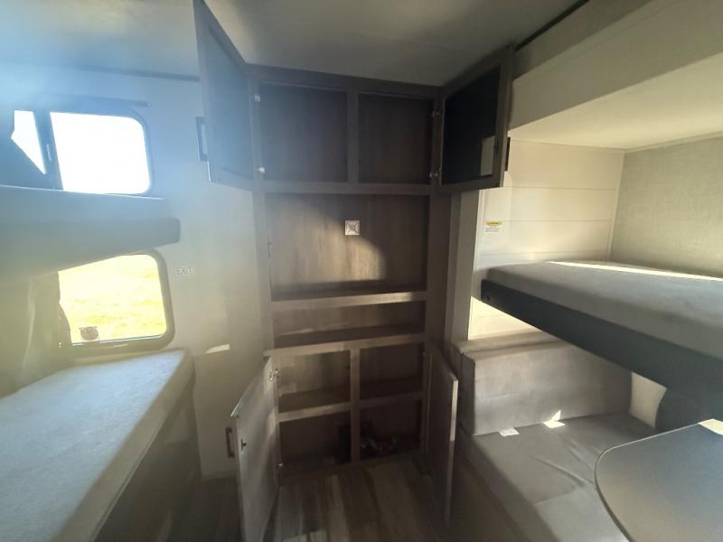 Get ready for a whole lot of memories being made when you have this trailer at the campgrounds! The rear bunkhouse includes bunk beds and a booth dinette plus a slide out for more space. In the main living area, you'll find the U-shaped dinette and Jack-knife sofa within a large slide out. Both furnishings offer more sleeping space when the whole family joins you. The inside kitchen offers full amenities while the outside pull-out griddle and exterior refrigerator give you more choices when cooking for everyone. You will also appreciate privacy in the front bedroom with dual access, two wardrobes and windows for views of the scenery.