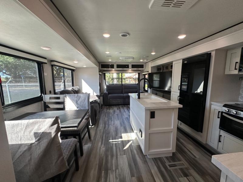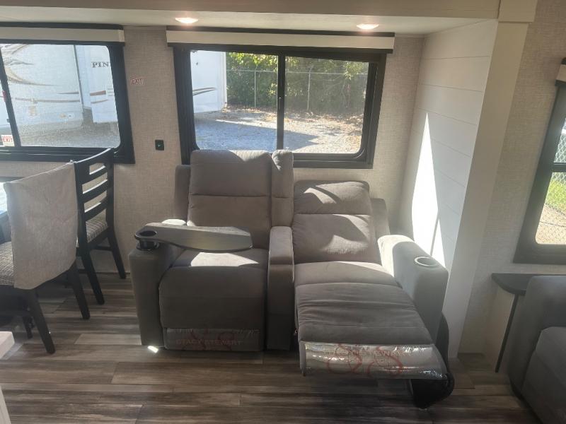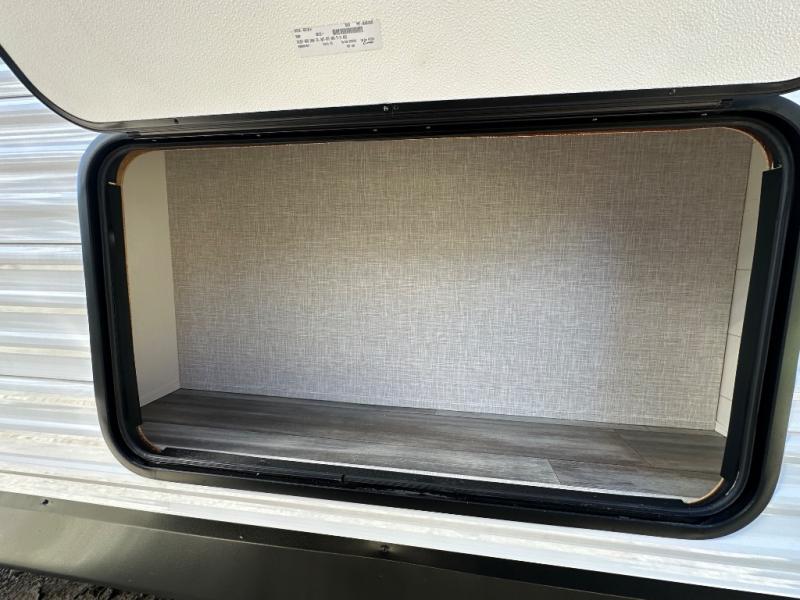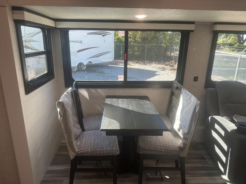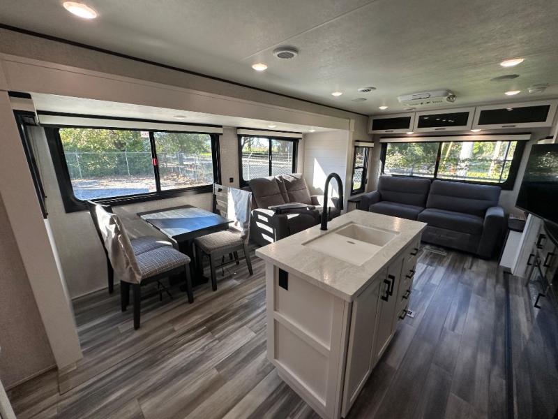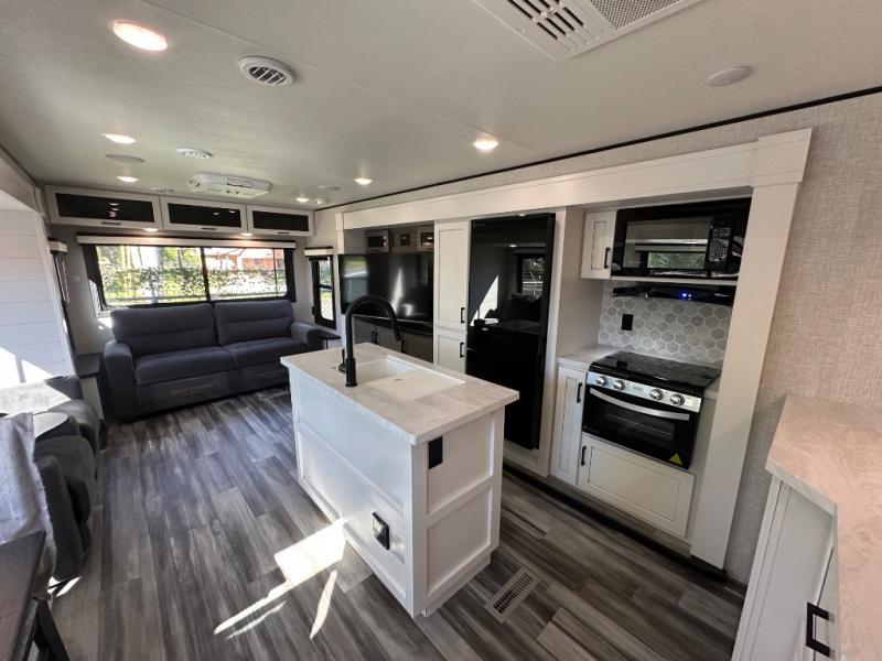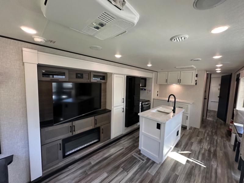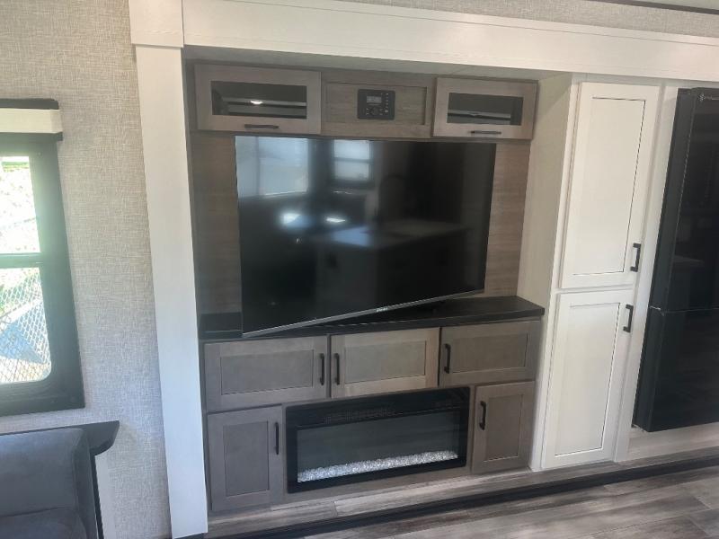 Enjoy a relaxing weekend getaway in this travel trailer! The dual entry bathroom with radius shower creates a front master suite with a queen bed slide, a dresser, and a front large wardrobe with storage space plus washer and dryer prep. The chef will have an easy time preparing their best home cooked meals with the kitchen island, hutch, three burner cooktop, and 12V refrigerator. Enjoy your meals at the booth dinette then play a card game or transform it into an extra sleeping space. The rear living area has a rear Jack-knife sofa for a quick afternoon nap and theater seating across from the entertainment center with a fireplace for the perfect spot on movie night!