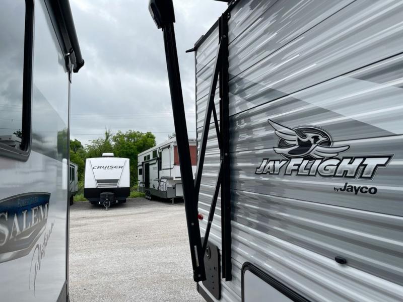 The Jayco Jay Flight SLX travel trailer is quite easy to own because it is lightweight for an easier towing experience. Built on a fully integrated A-frame with galvanized-steel, impact-resistant wheel wells, the Jay Flight SLX has quality at its very foundation. That quality continues on to the electric self-adjusting brakes, easy-lube hubs, Magnum Truss roof system, and LP quick connect. Some of what the mandatory Customer Value Package includes is backup camera prep, Keyed-Alike entry and baggage doors, marine grade exterior speakers, and an on-demand tankless water heater.