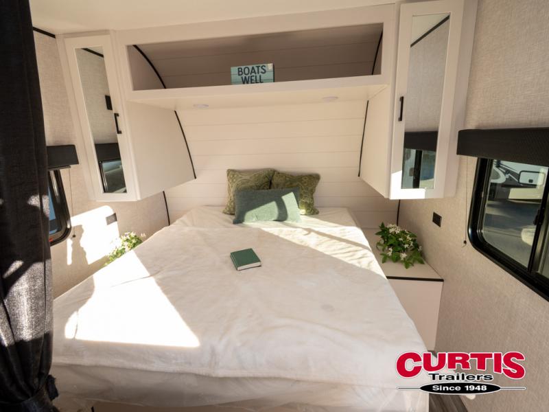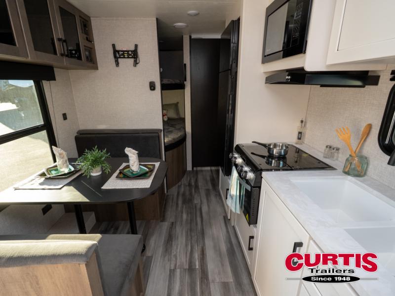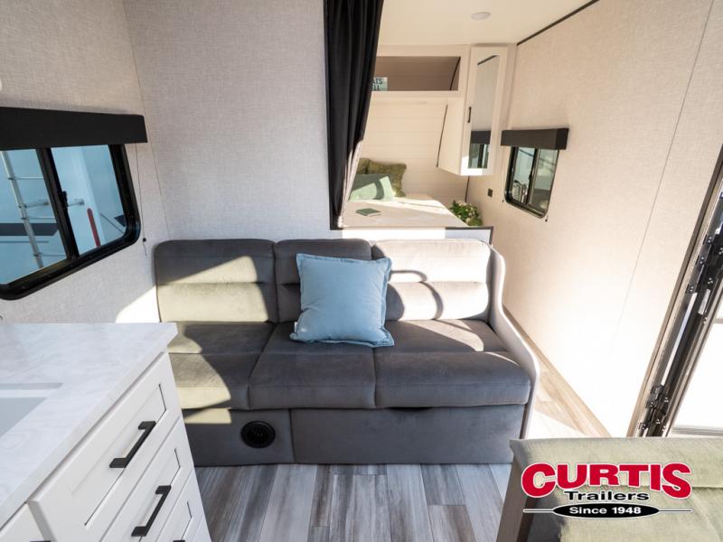 You can comfortably sleep up to eight people in this trailer thanks to the double-size bunks, the RV queen bed in the front bedroom, plus the booth dinette and jack-knife sofa in the main living area! The chef of your crew will have a three burner cooktop and microwave oven to prepare meals, and everyone can store their favorite drinks in the 8 cu. ft. 12V refrigerator. The bathroom includes a tub/shower and a toilet, with the sink just outside of this room so others can brush their teeth if one is taking a shower before bed. The outside storage will let you bring along fishing poles and the 16' power awning with LED lights will create a nice place to gather in the evenings!