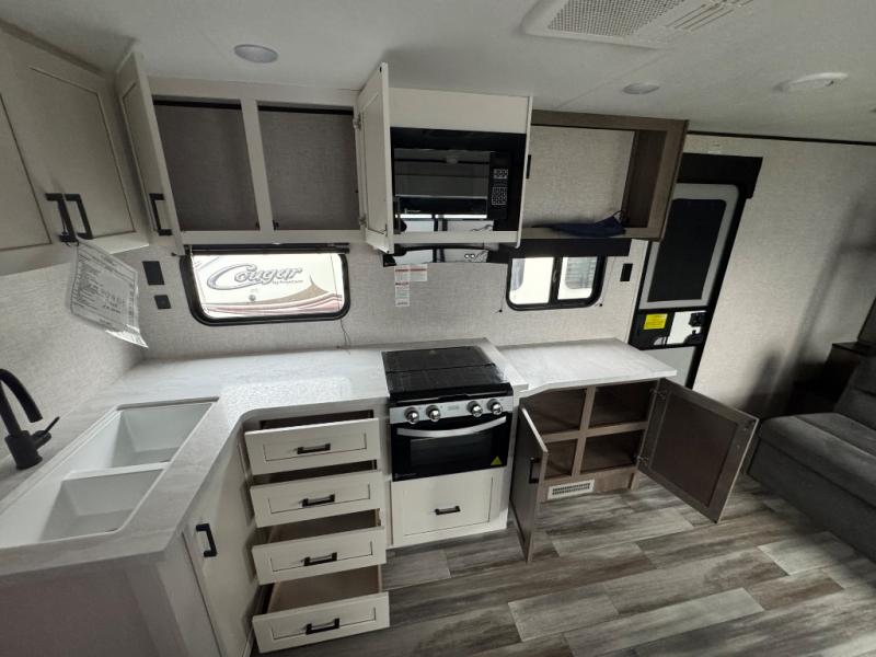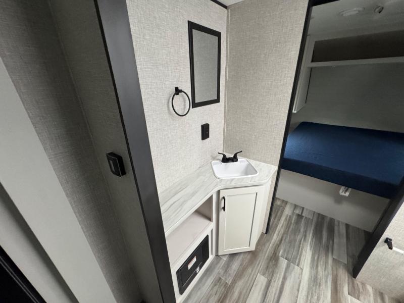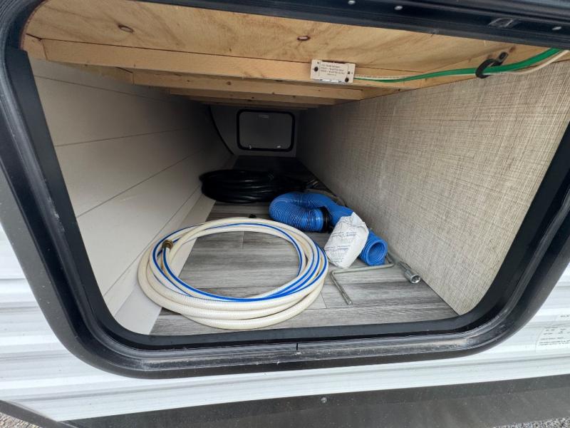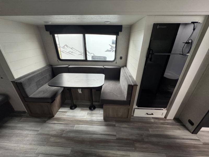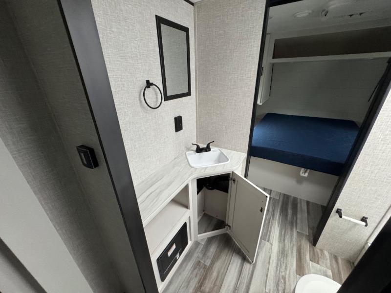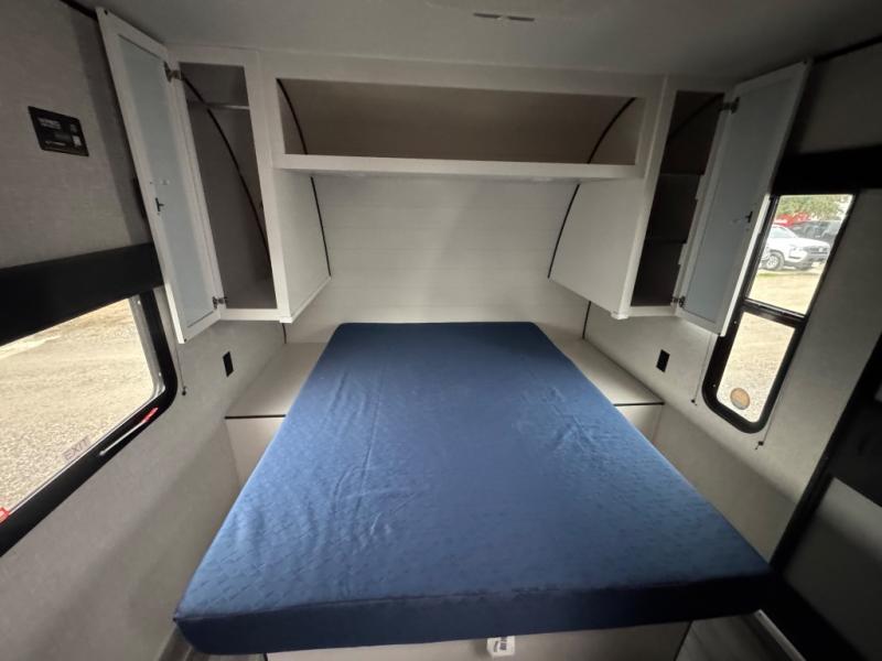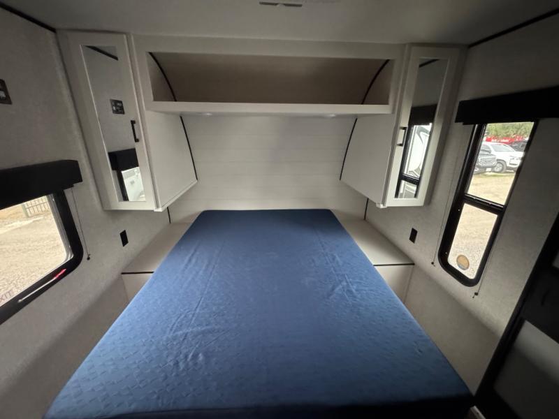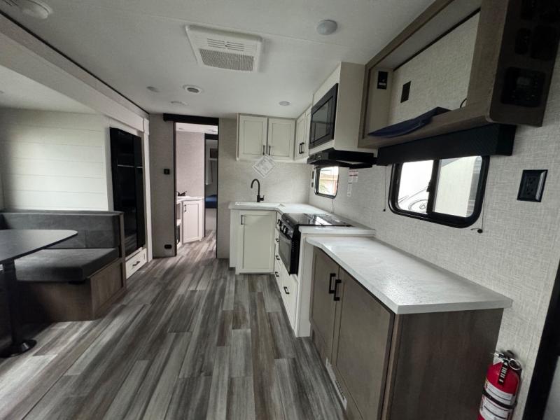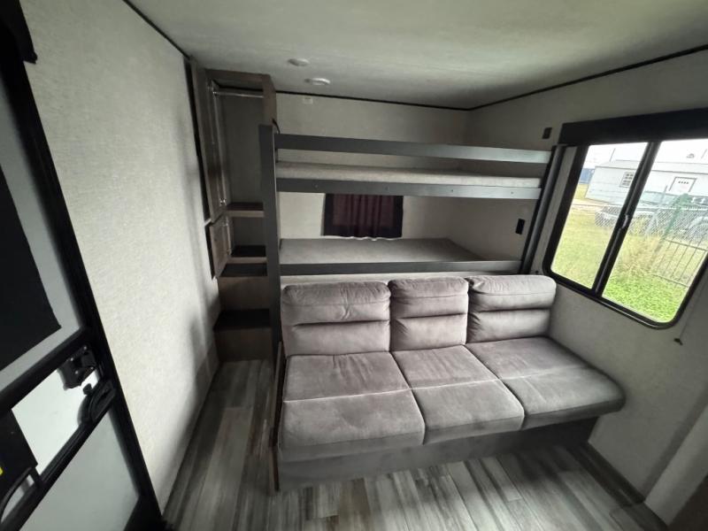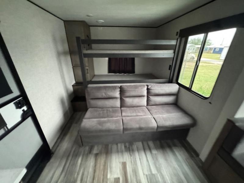 It's time to ditch that old tent and upgrade to this spacious travel trailer! The littles ones or your guests will love the double-size bunks with steps in the back, while you take the front master bedroom. One of the dual entry doors is also found here for convenience, and the walk-through bath is easily accessible for everyone. A U-shaped dinette slide and jack-knife sofa in the main living area provide your crew with space to relax and dine together, and the fully equipped kitchen lets you cook up your best meals. This unit includes ample storage space, including additional kitchen storage, wardrobes, overhead cabinets, and exterior storage!