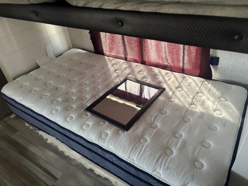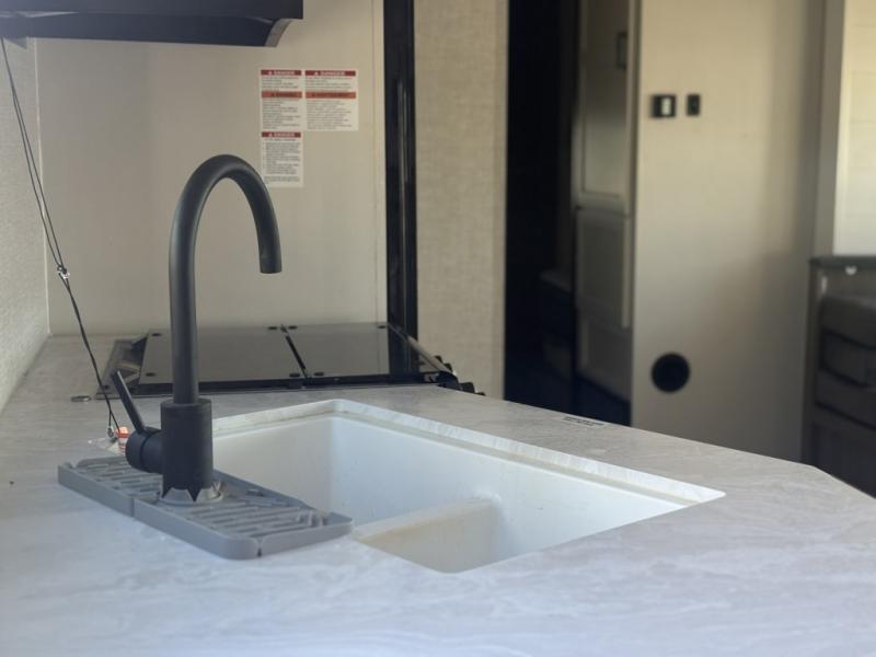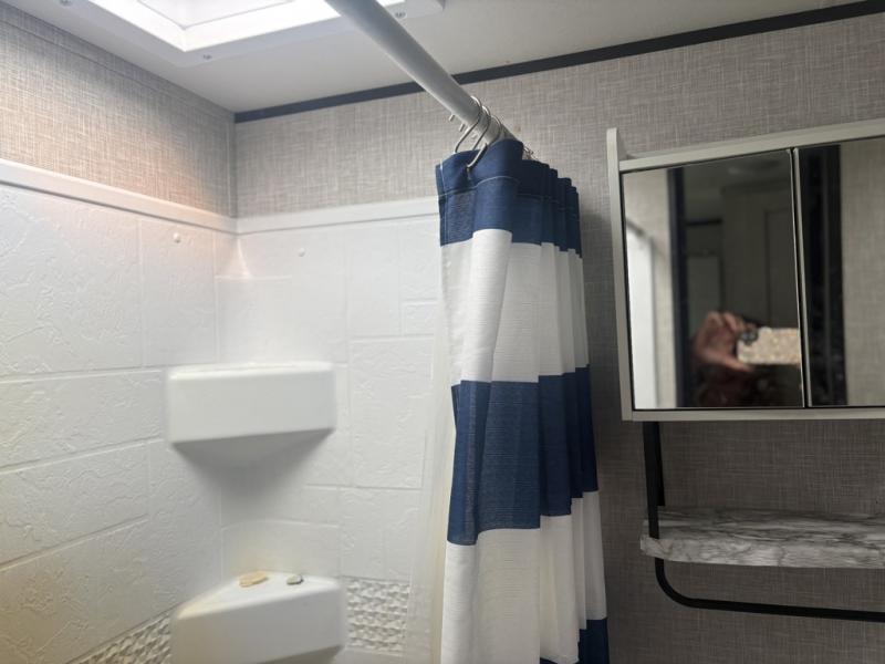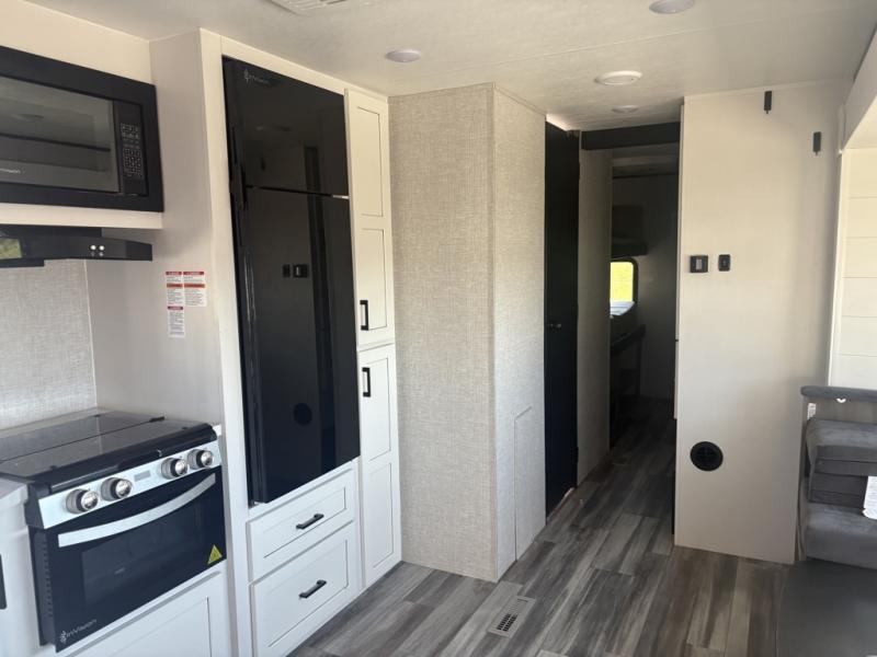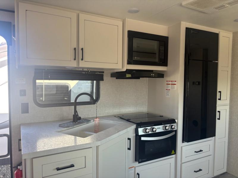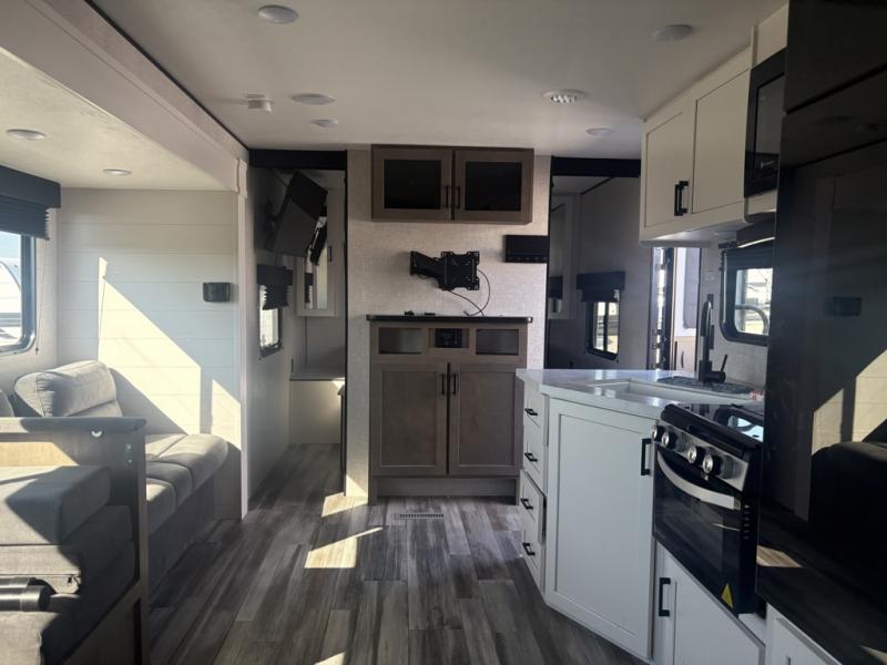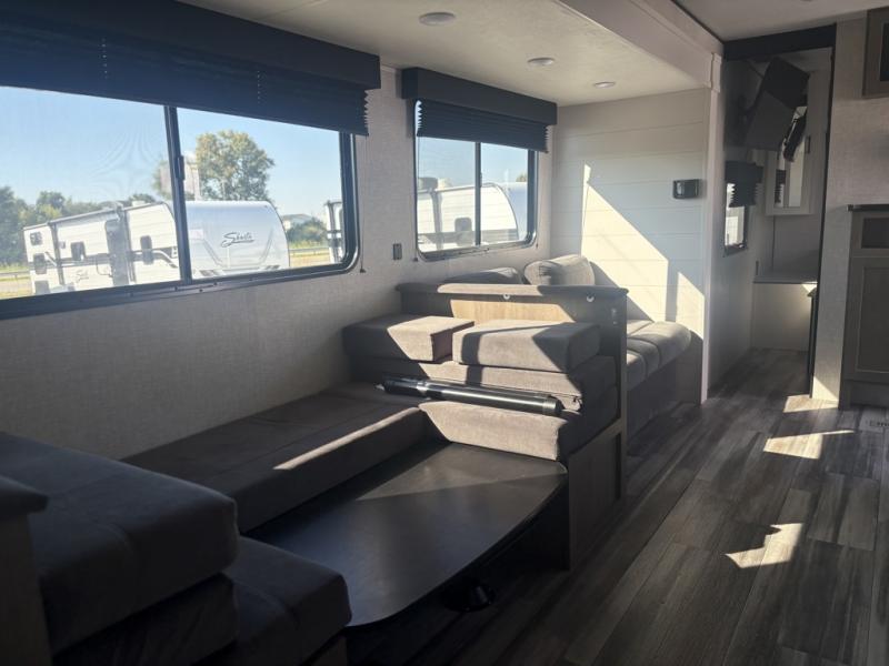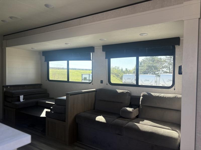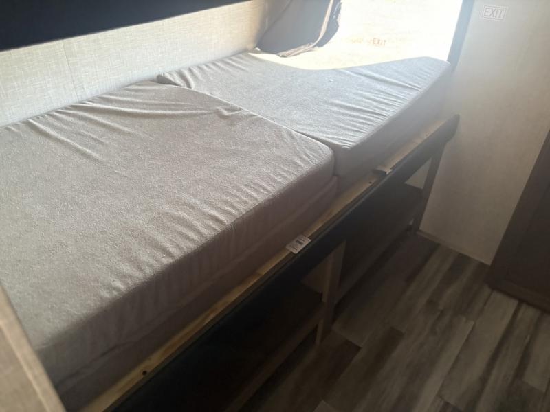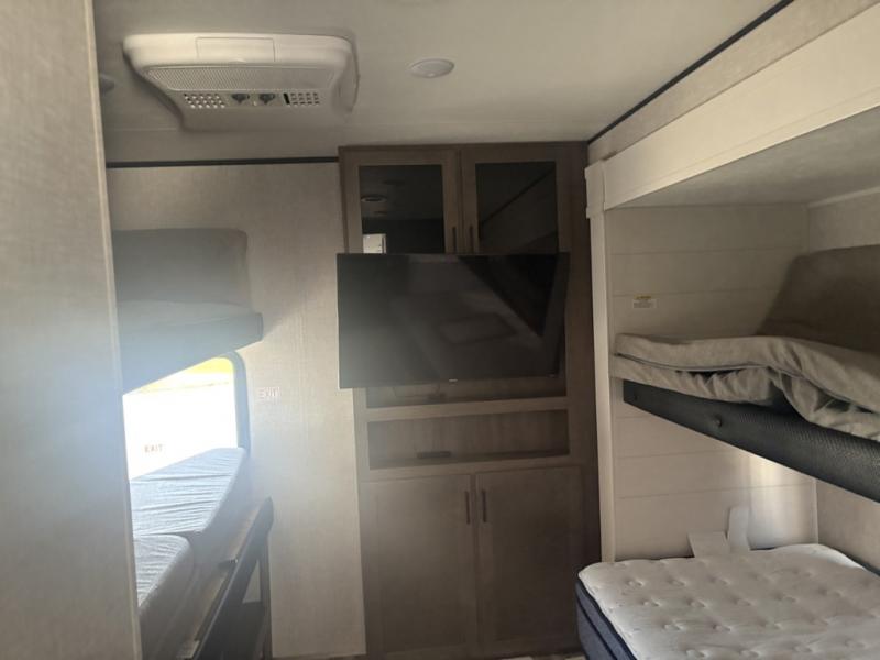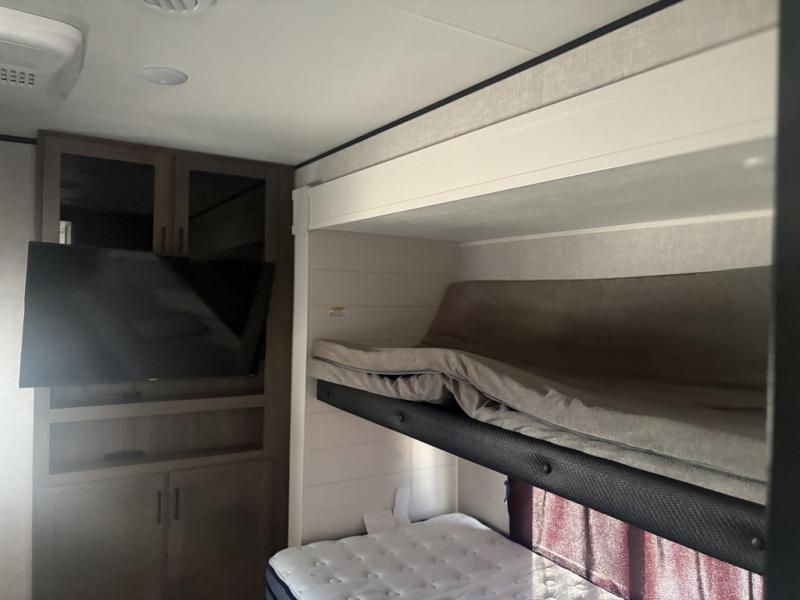 The whole gang can join along on camping trips in this double slide out travel trailer! There is a rear private bunkhouse with a bunk bed and J-cube futon sofa below plus two additional bunks across the room. You'll find your own space in the front private bedroom, which also includes an RV queen bed and dual wardrobes. The middle kitchen and living room will be a favorite place to come together since there is a jack-knife sofa and U-shaped dinette plus a fully-equipped kitchen to make meals each day. This model also includes a full bath with one of the dual entry doors for added convenience!