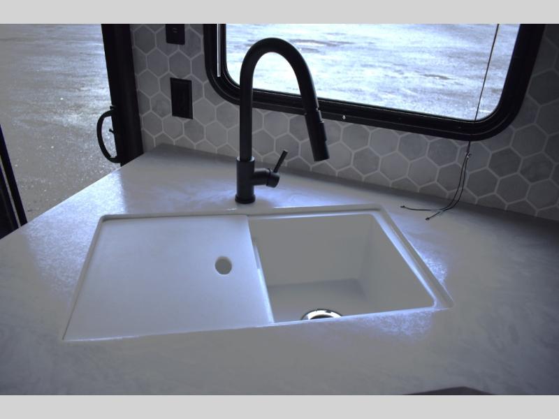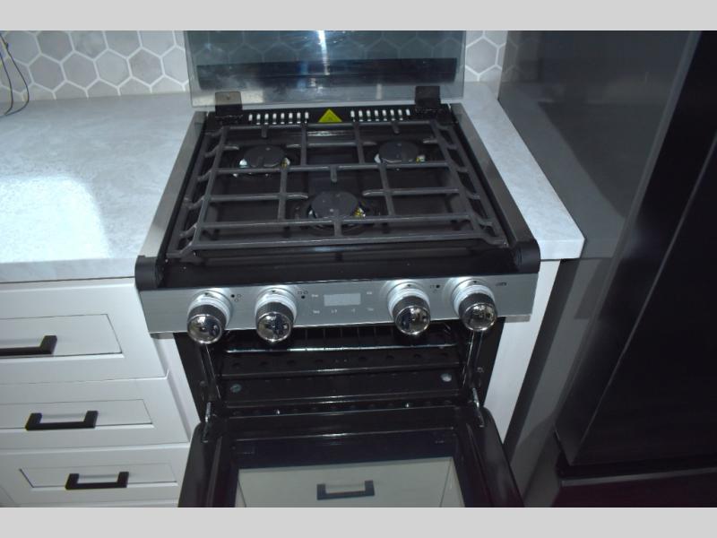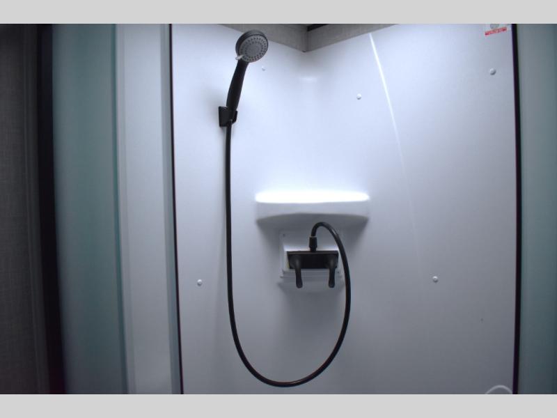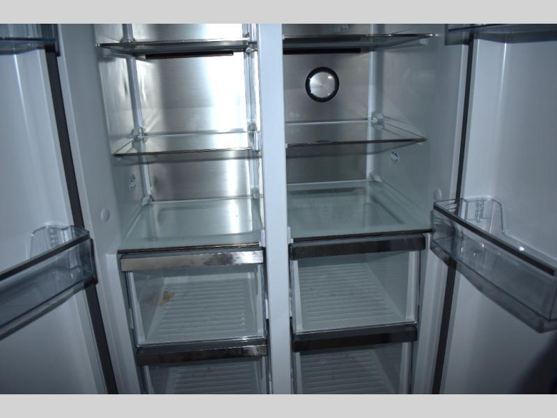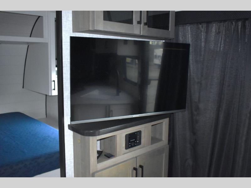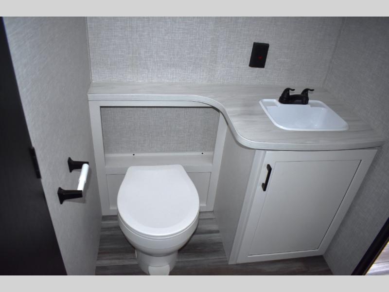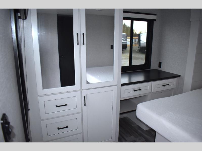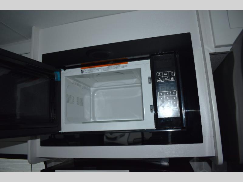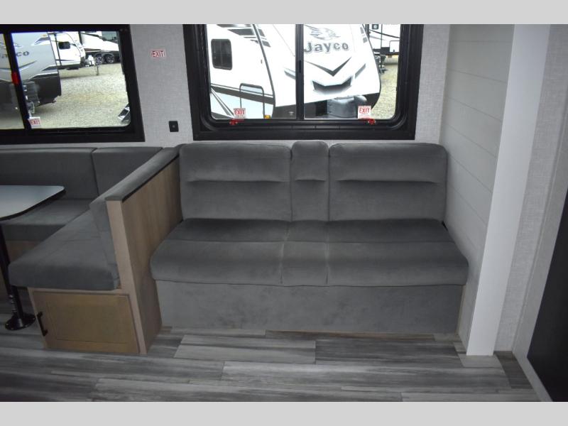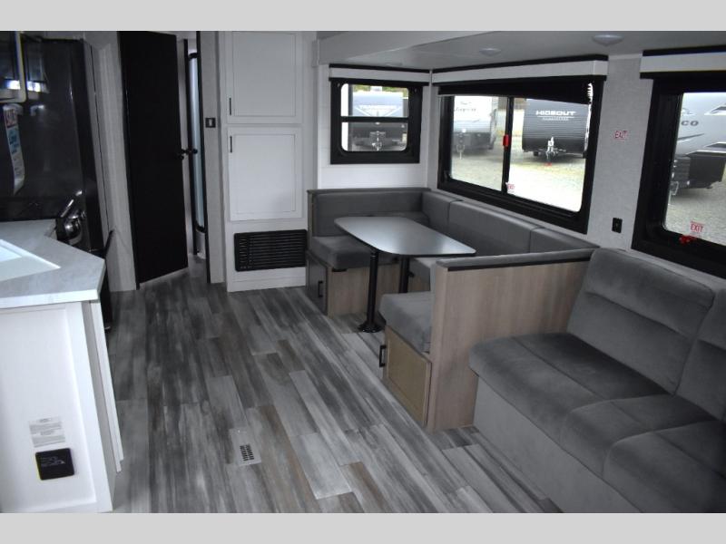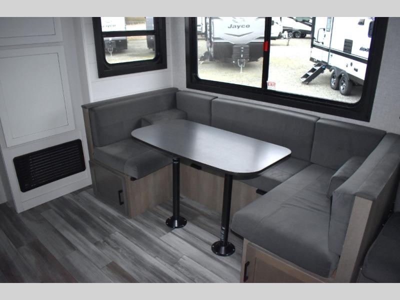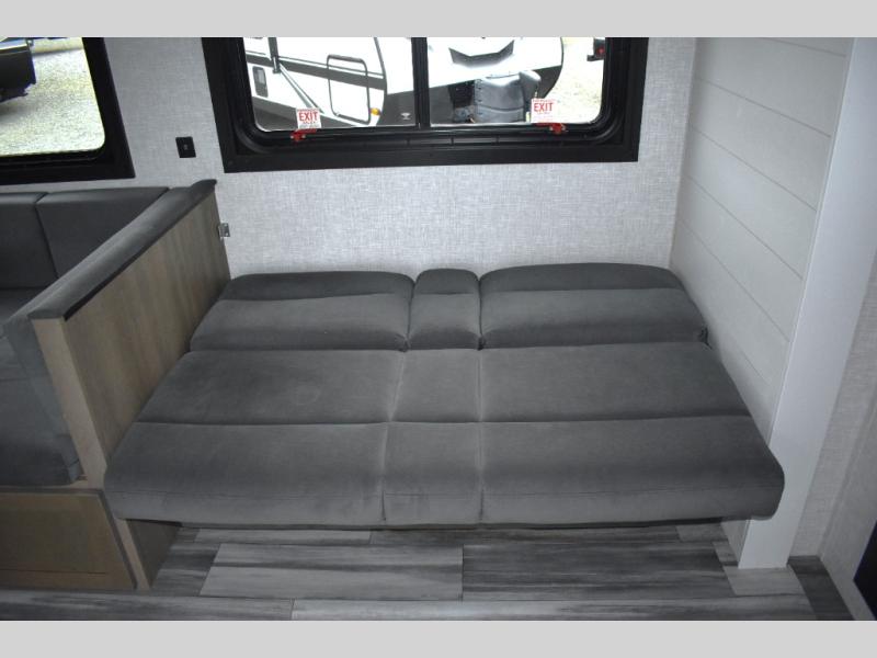 With two private bedrooms, everyone will have a comfortable place to sleep in this travel trailer! The front private bedroom has a 60" x 75" queen bed with wardrobes on either side and the rear private bedroom has a 60" x 80" queen bed slide with a dresser, a wardrobe, one of the exit/entrance doors, and an entrance into the walk-through bathroom which has a radius shower for everyone to stay squeaky clean. The patio doors not only make it easy to enter and exit the unit, but also bring in tons of natural lighting. After you have prepared a delicious home cooked meal, you can can head to the U-shaped dinette to enjoy it there comfortably then relax on the Jack-knife sofa across from the entertainment center!