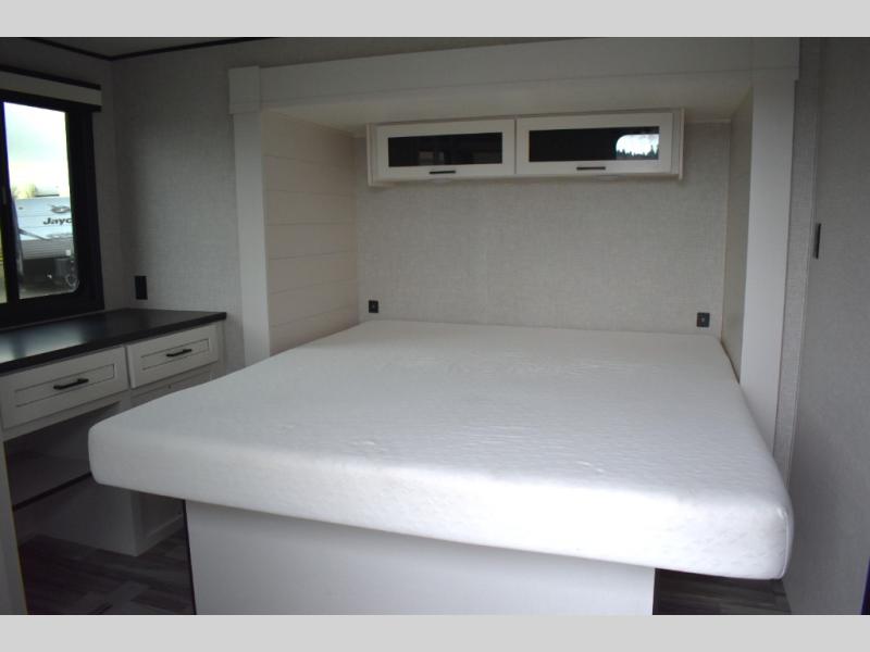 The Jayco Jay Flight SLX travel trailer is quite easy to own because it is lightweight for an easier towing experience. Built on a fully integrated A-frame with galvanized-steel, impact-resistant wheel wells, the Jay Flight SLX has quality at its very foundation. That quality continues on to the electric self-adjusting brakes, easy-lube hubs, Magnum Truss roof system, and LP quick connect. Some of what the mandatory Customer Value Package includes is backup camera prep, Keyed-Alike entry and baggage doors, marine grade exterior speakers, and an on-demand tankless water heater.