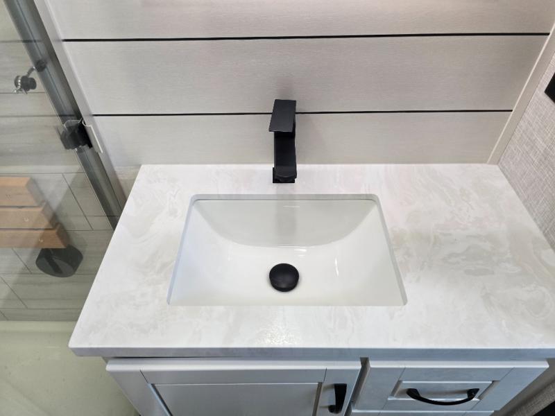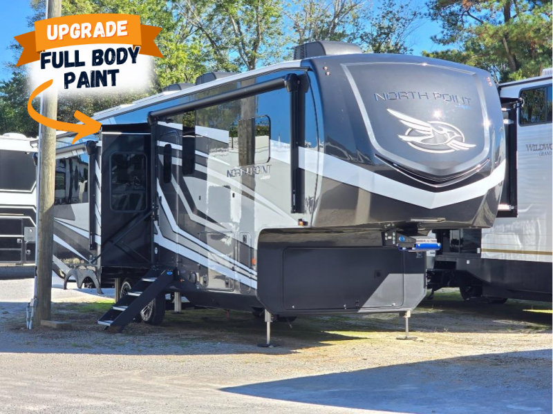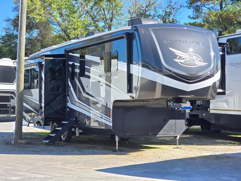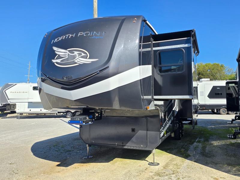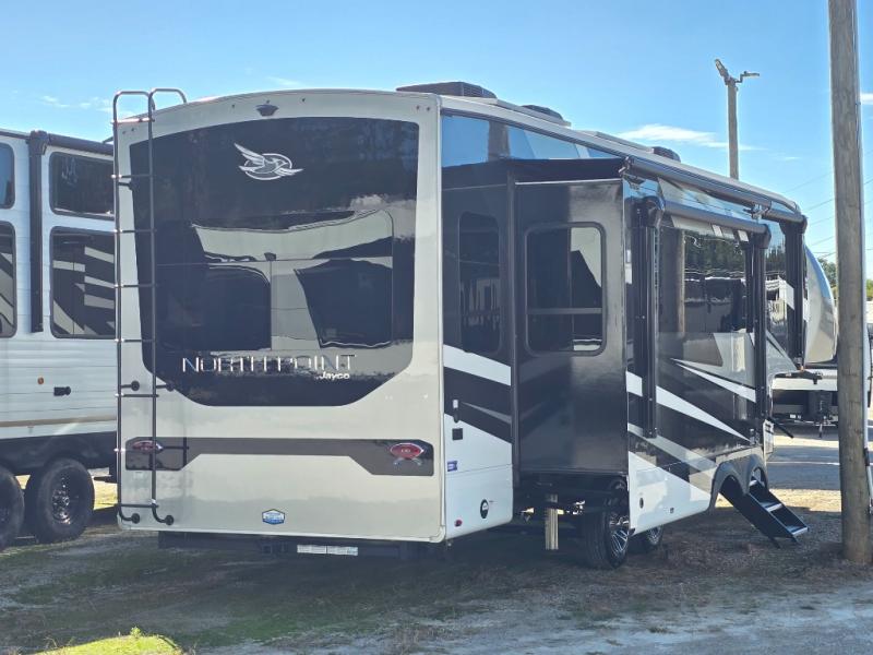 With any North Point fifth wheel by Jayco you begin with a strong foundation with a custom frame, designed and sized specifically to best support each unit. Constructed with Stronghold VBL™ aluminum framed, vacuum bond laminated walls and the Magnum Truss™ XL6™ roof system with an Alpha roof membrane system, which is the strongest tested roof in the industry. The 5-Star Handling package is included with Uniroyal tires, a MORryde rubber pin box, Dexter axles with Nev-R-Adjust brakes, MORryde CRE-3000 rubberized suspension and wet bolt fasteners and bronze bushings. The interior has handcrafted hardwood glazed doors and drawers, vinyl flooring throughout, an integrated under-mount sink in the main bathroom, plus so much more you just have to see one to believe it all!