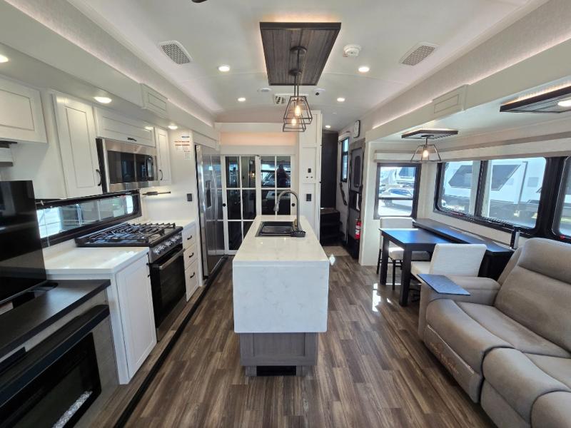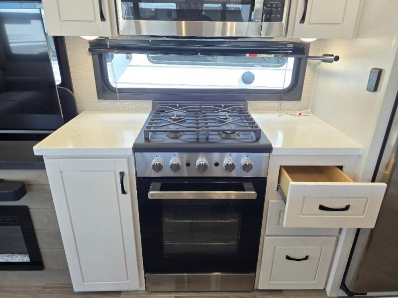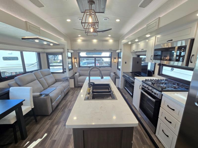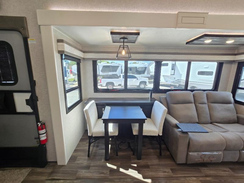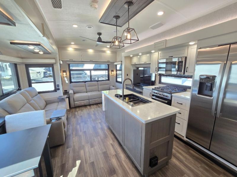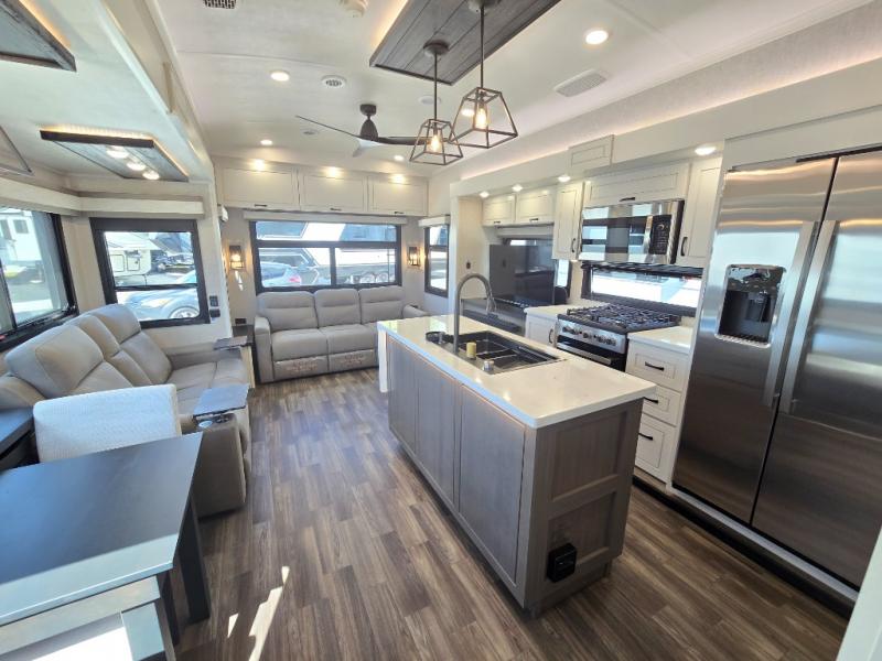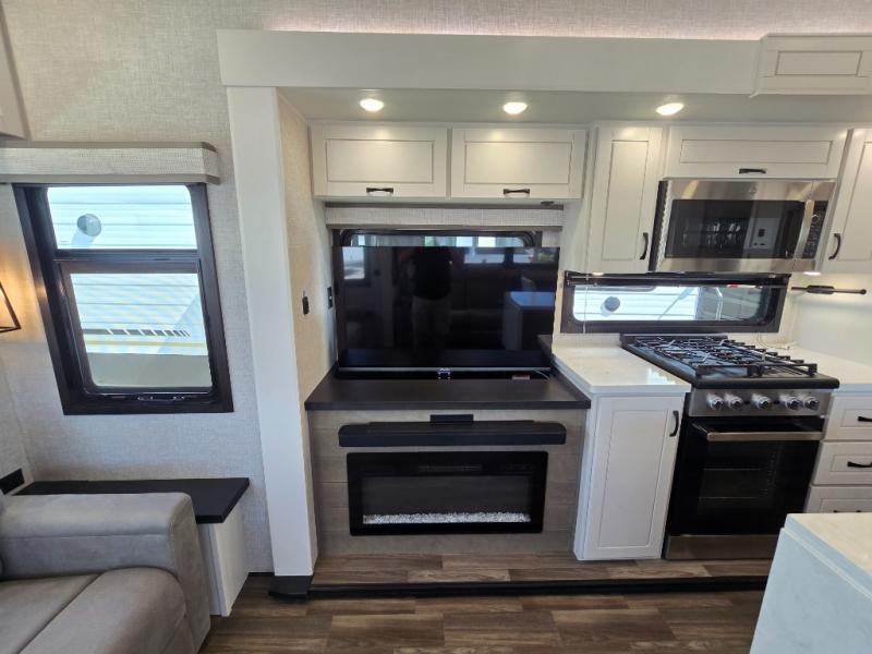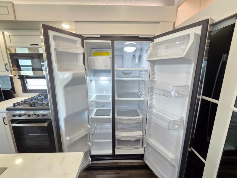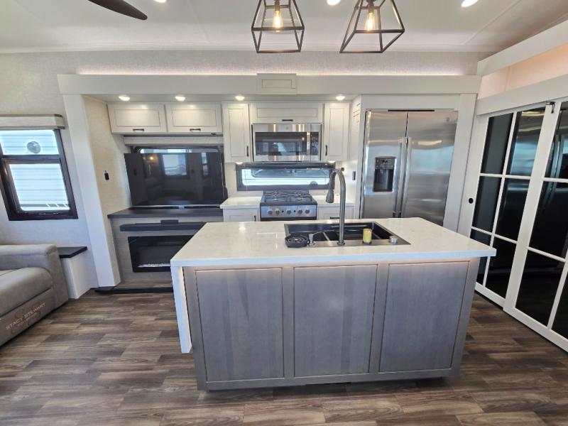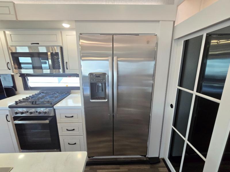 Whether you want to live in this fifth wheel or travel for long periods at a time, you will enjoy the spacious main living and kitchen area with dual slide outs as well as the bedroom with a slide out king bed. You will also find a walk-in closet with hamper and prepped space for a washer/dryer option, and a flip-top dresser with 32" TV. Easily get cleaned up in the full bathroom which also has linen storage. The cook will have a residential refrigerator to store all the cold items and beverages, a kitchen island, a pantry and a residential 24" stove. The 50" Smart LED HDTV with fully digital HDMI output and home entertainment system with subwoofer and fireplace below will provide a cozy place to watch your shows while relaxing on the theater seats, the tri-fold sofa, or the roll-top dinette table.