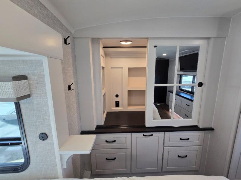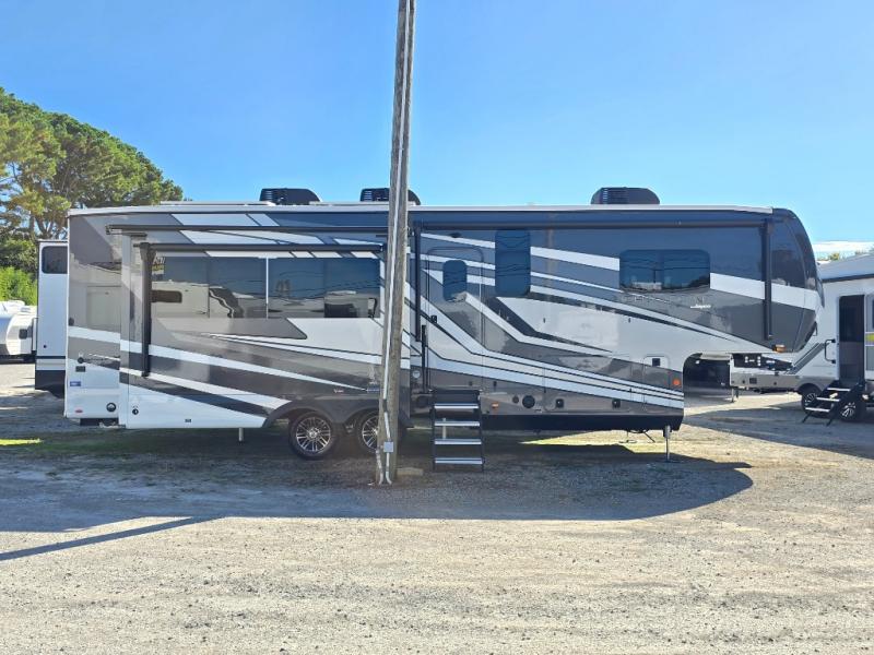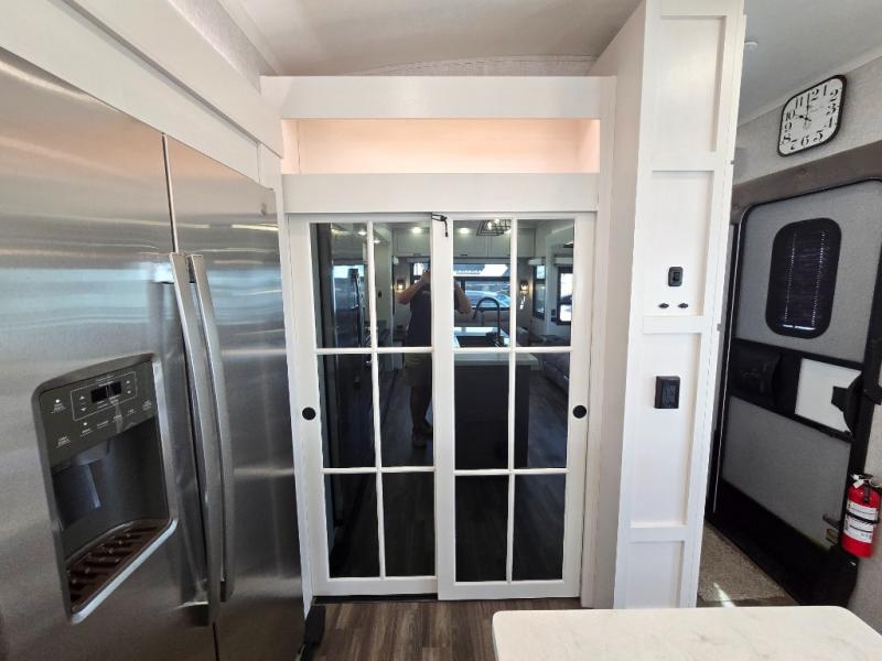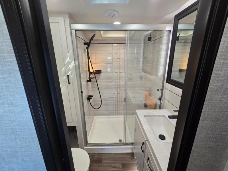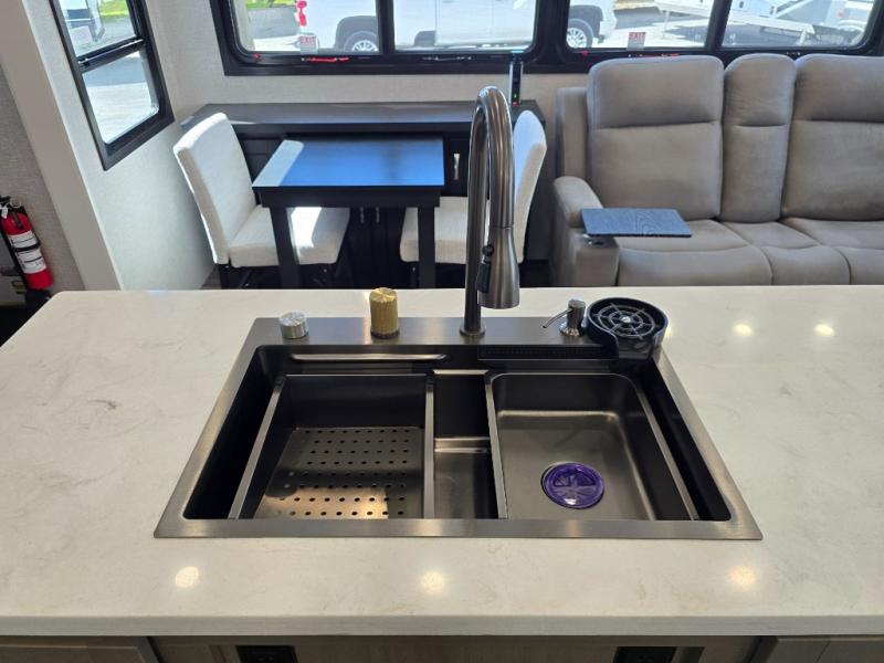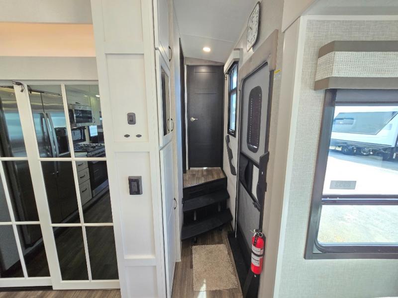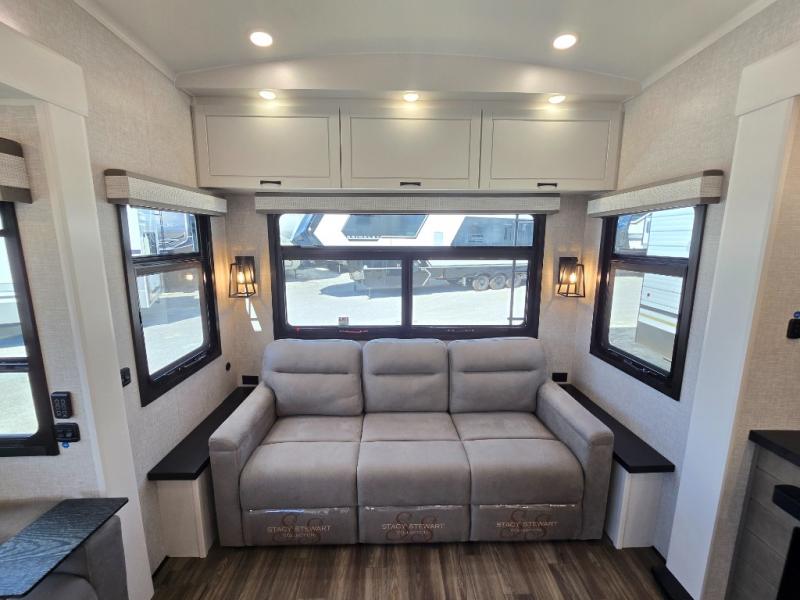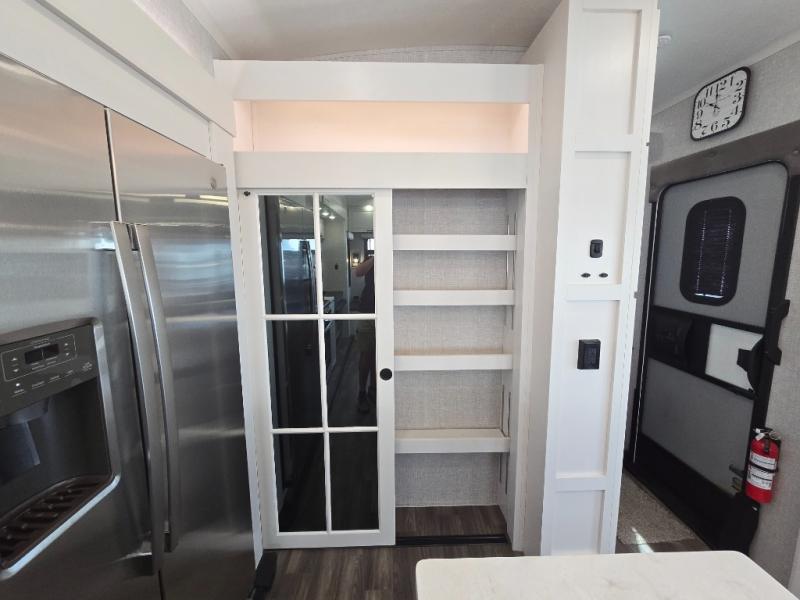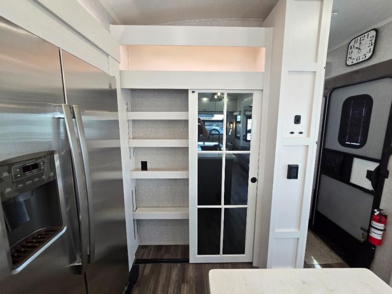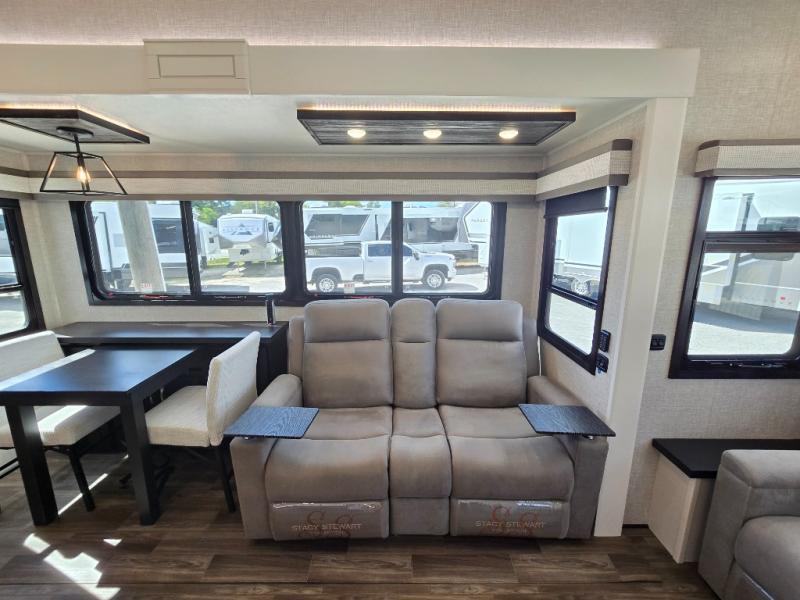 Whether you want to live in this fifth wheel or travel for long periods at a time, you will enjoy the spacious main living and kitchen area with dual slide outs as well as the bedroom with a slide out king bed. You will also find a walk-in closet with hamper and prepped space for a washer/dryer option, and a flip-top dresser with 32" TV. Easily get cleaned up in the full bathroom which also has linen storage. The cook will have a residential refrigerator to store all the cold items and beverages, a kitchen island, a pantry and a residential 24" stove. The 50" Smart LED HDTV with fully digital HDMI output and home entertainment system with subwoofer and fireplace below will provide a cozy place to watch your shows while relaxing on the theater seats, the tri-fold sofa, or the roll-top dinette table.