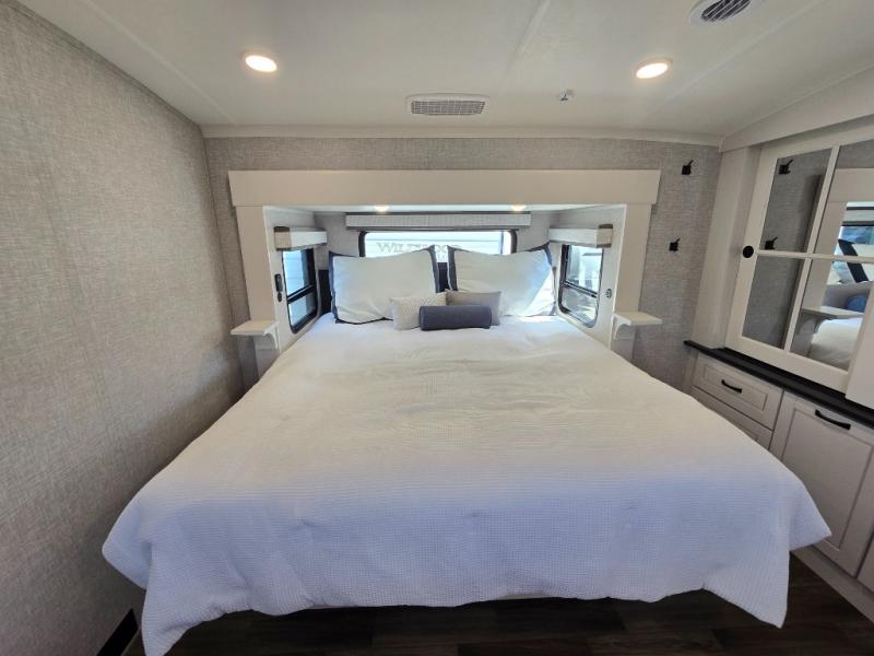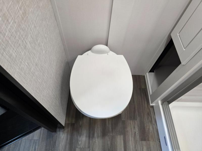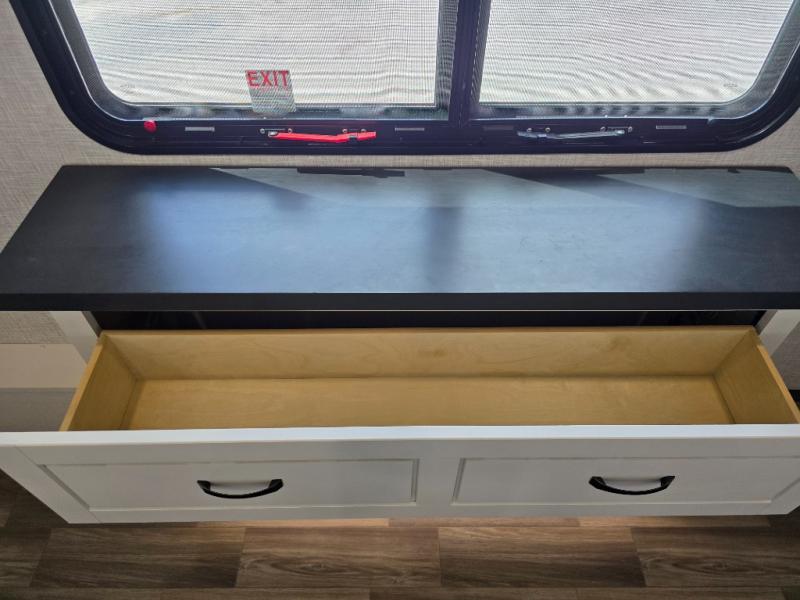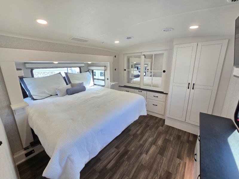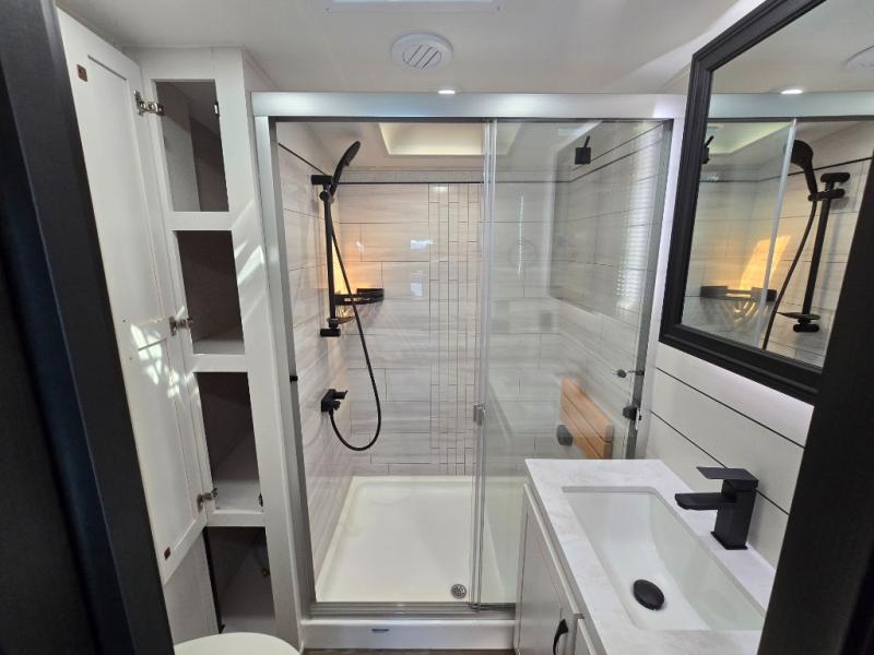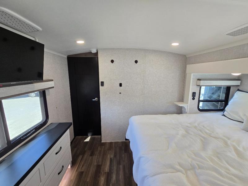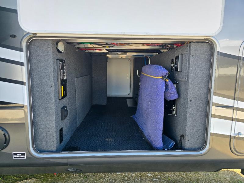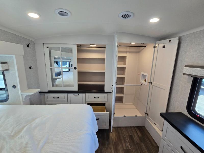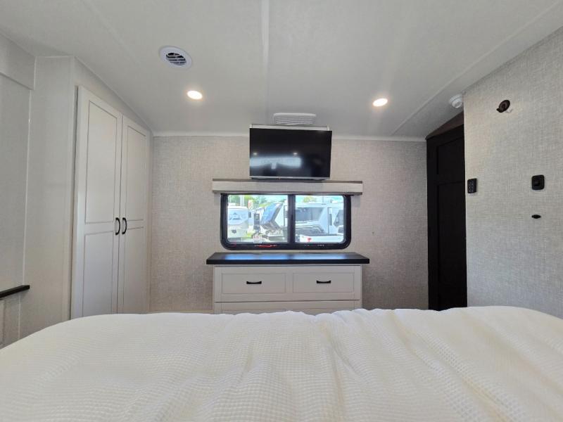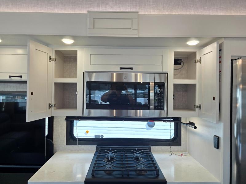 Whether you want to live in this fifth wheel or travel for long periods at a time, you will enjoy the spacious main living and kitchen area with dual slide outs as well as the bedroom with a slide out king bed. You will also find a walk-in closet with hamper and prepped space for a washer/dryer option, and a flip-top dresser with 32" TV. Easily get cleaned up in the full bathroom which also has linen storage. The cook will have a residential refrigerator to store all the cold items and beverages, a kitchen island, a pantry and a residential 24" stove. The 50" Smart LED HDTV with fully digital HDMI output and home entertainment system with subwoofer and fireplace below will provide a cozy place to watch your shows while relaxing on the theater seats, the tri-fold sofa, or the roll-top dinette table.