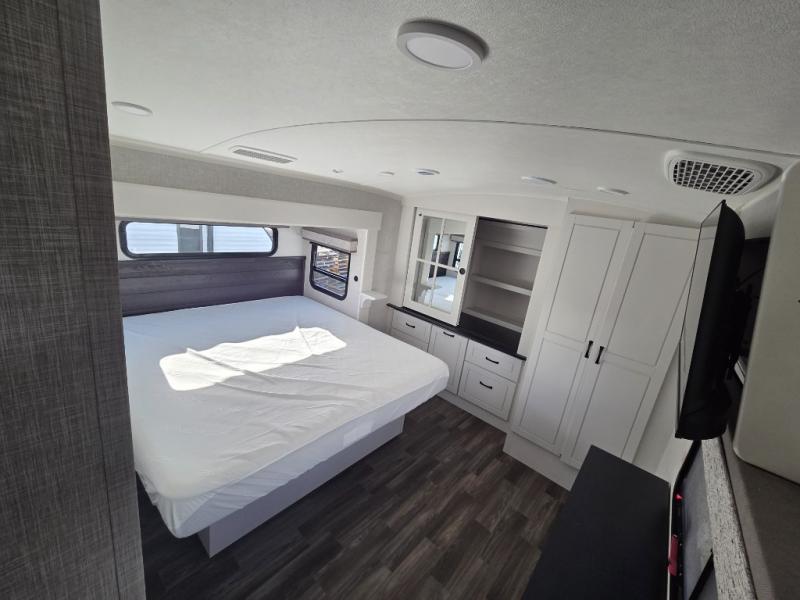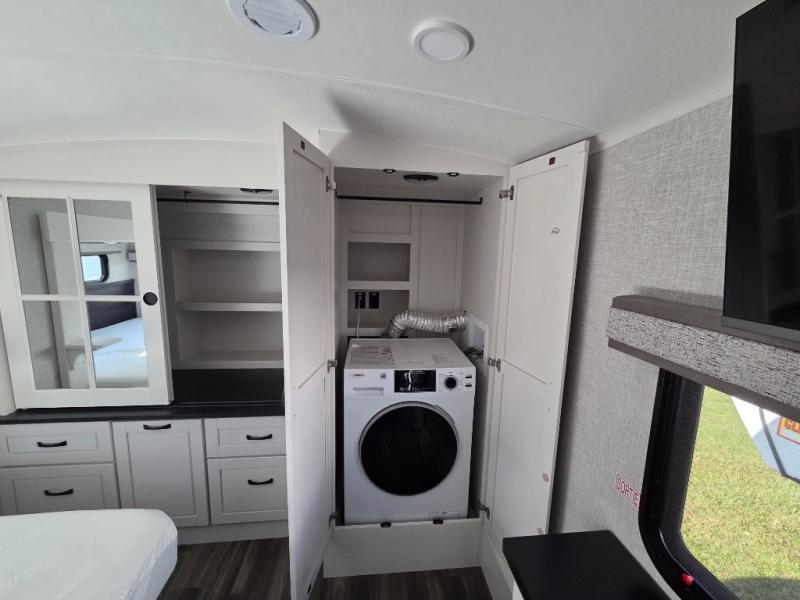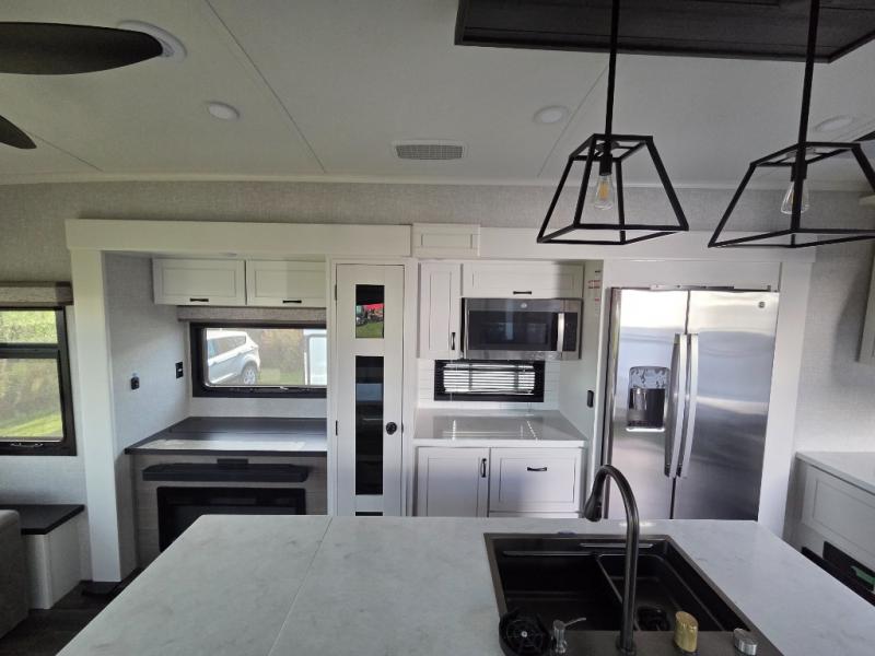 Finding the perfect RV park or campground is all you have to do, then you can load up and hit the road whether you are a full-timer or weekend warrior. The two electric awnings and the three slides are easy to set up and close, and you will have lots of interior and exterior storage to bring everything you might need. The kitchen offers a residential refrigerator and 24" stove, a 30" residential microwave, a kitchen island, a pantry and a pull-out countertop. You can relax on the tri-fold sofa and the theater seats while watching your shows on the 50" Smart LED HDTV with fully digital HDMI output and home entertainment system with subwoofer plus there is a fireplace below. Dine at the free standing table which includes a leaf, two free standing chairs and two folding chairs, or you can work from here as well. The front bedroom offers a king bed slide, a walk-in closet with hamper and prepped space for a washer/dryer option, and a flip-top dresser with 32" TV.