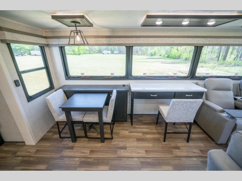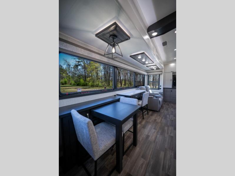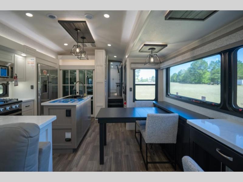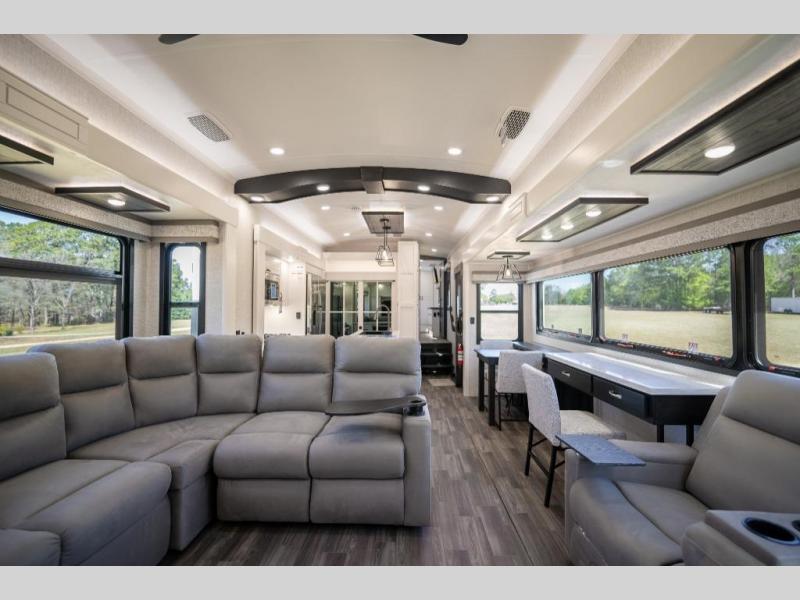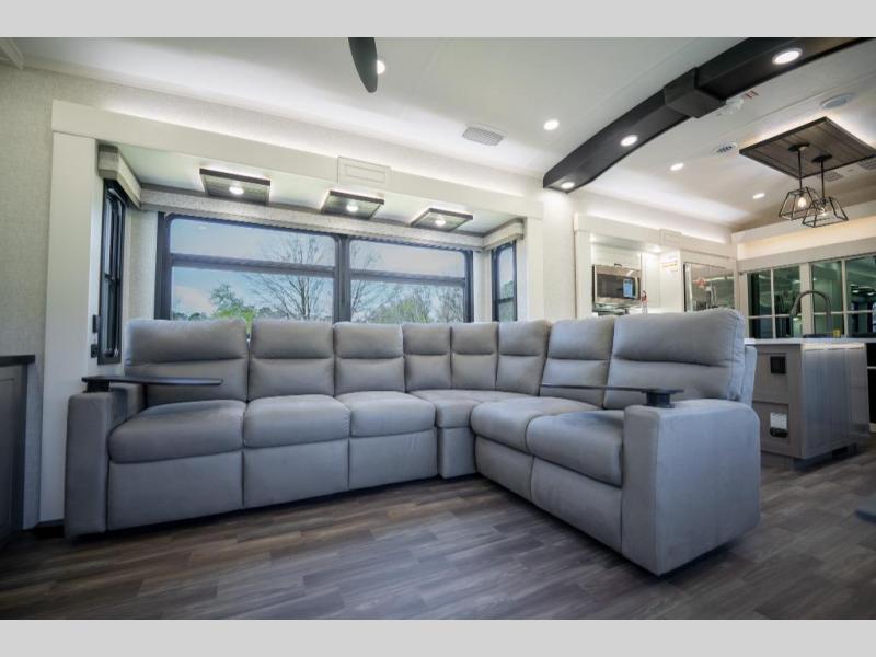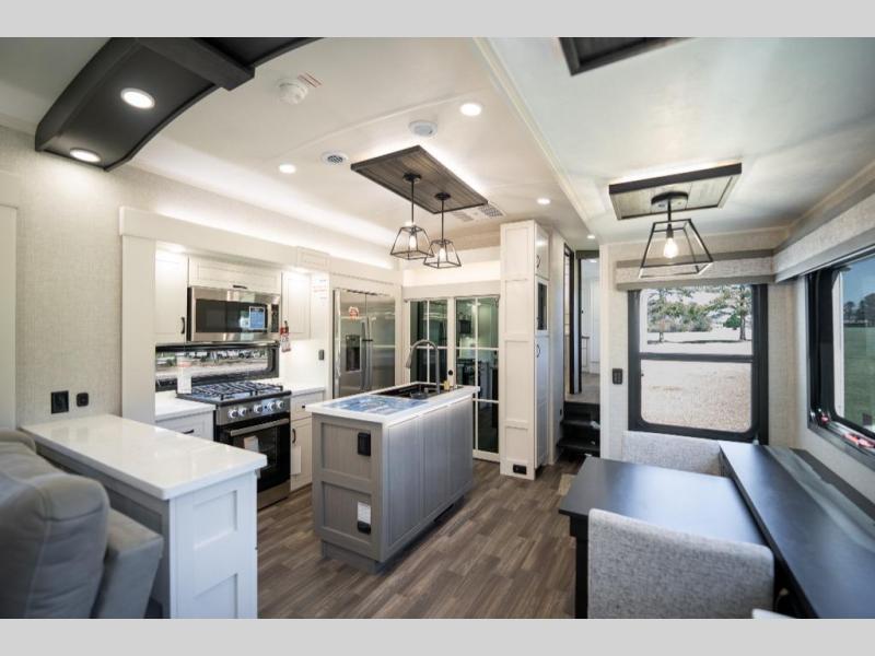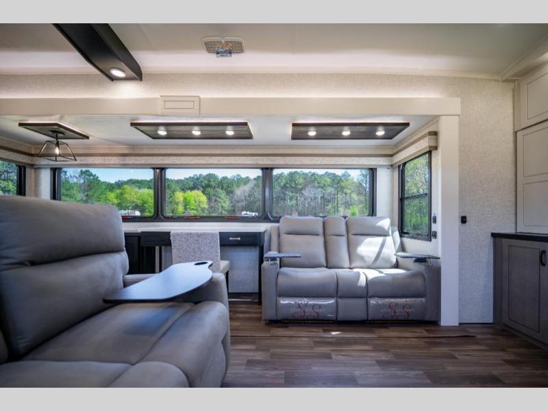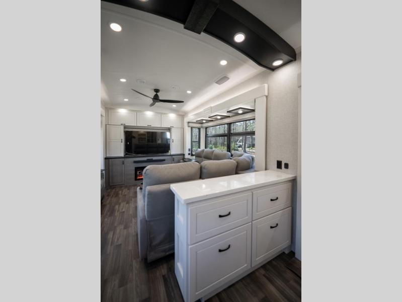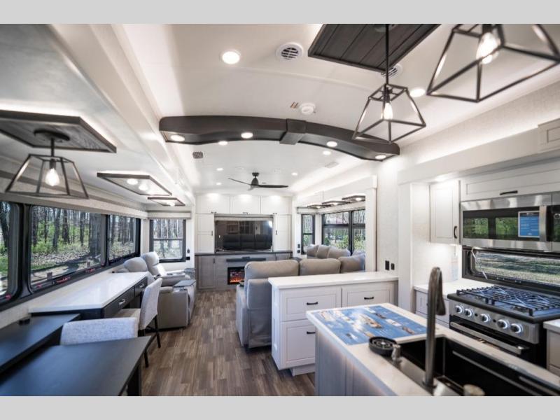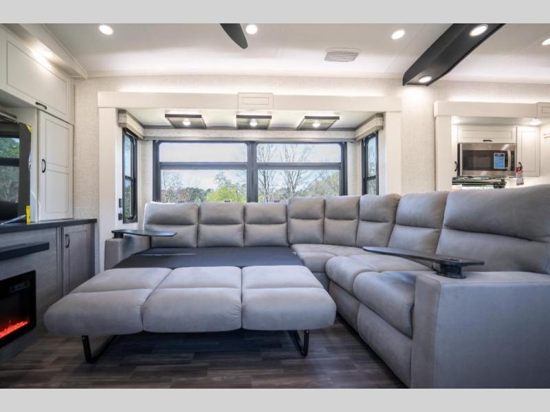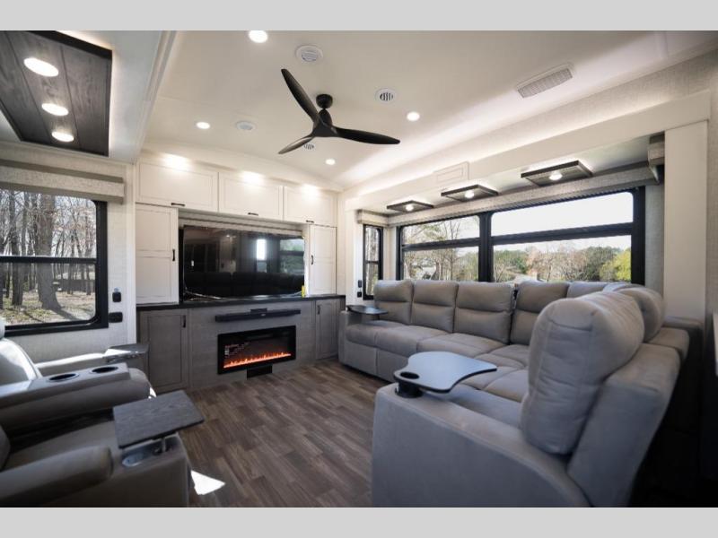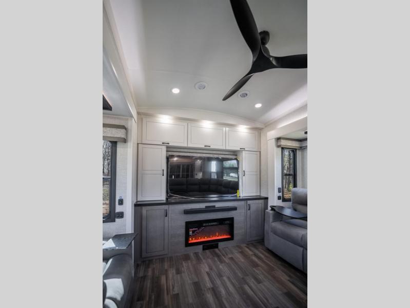 Prepare for great adventures in this fifth wheel! The rear living area features a massive L-shaped sofa which includes a hide-a-bed as well as recliner seats! Plus there's an additional theater seat all facing the entertainment center with a fireplace and 50" Smart TV. A flexible desk/coffee bar connects the living room to the kitchen so you can work or relax as needed. Meals will be easy to prepare with the island with sink and pull-out cutting board, plus pantry, microwave, and residential refrigerator. Up front you will find the private bedroom with its king bed, closet with drawers and hamper, and even a second TV. The full bath features a shower with seat and a linen closet for convenient storage.