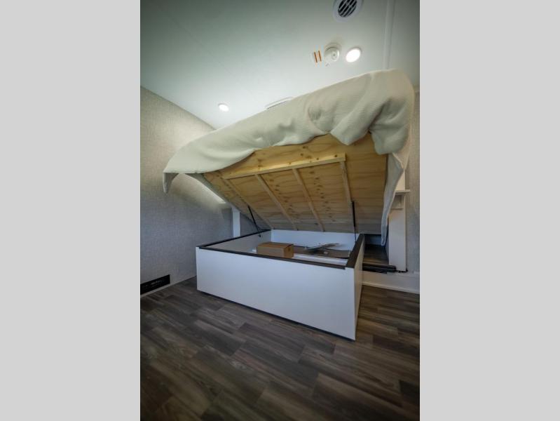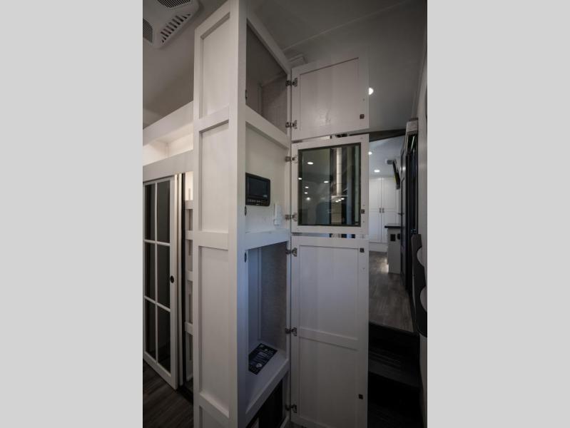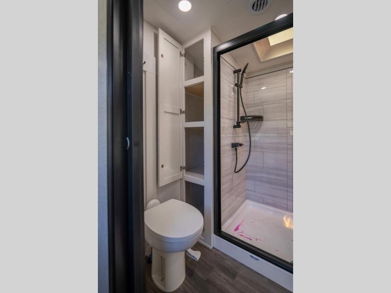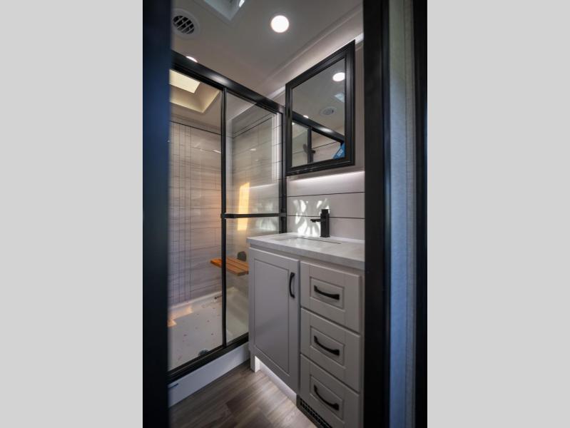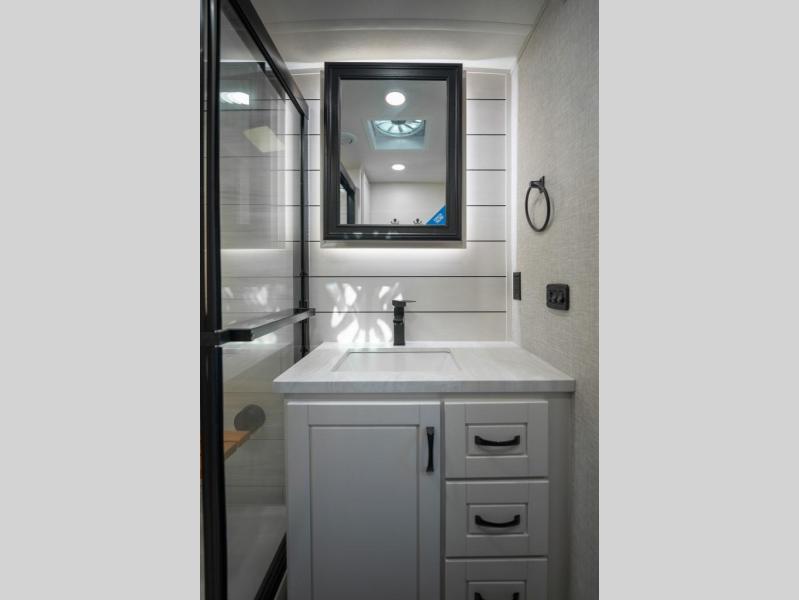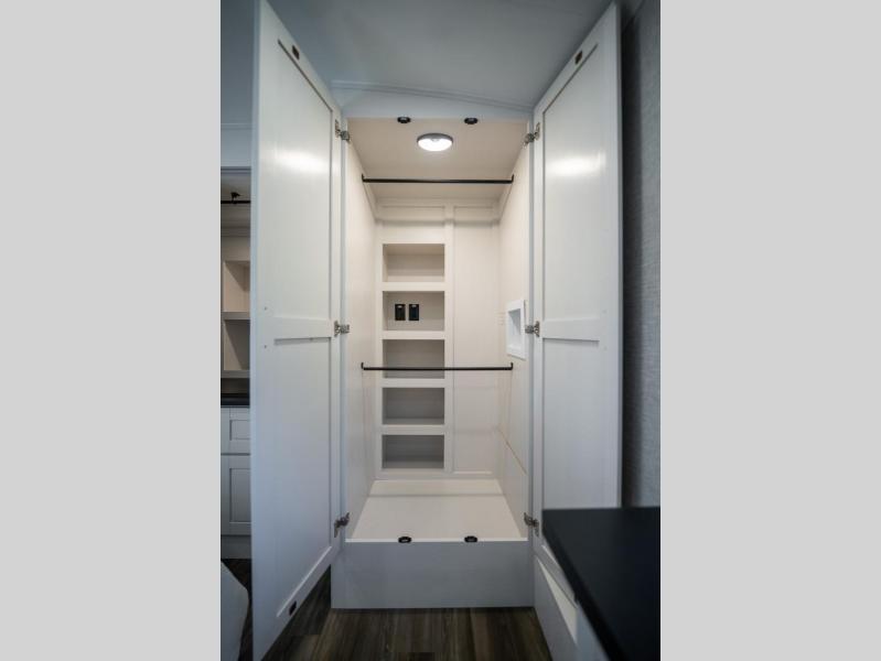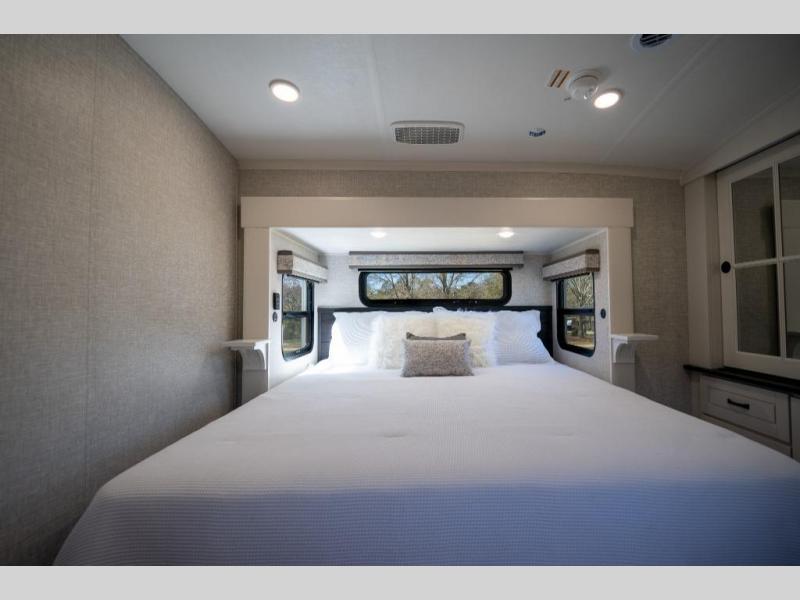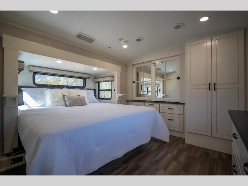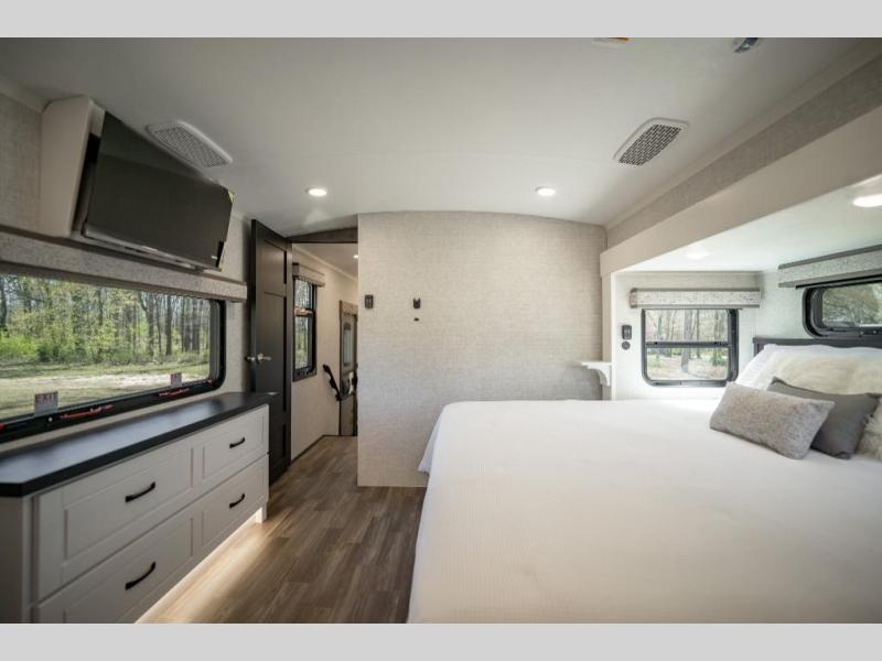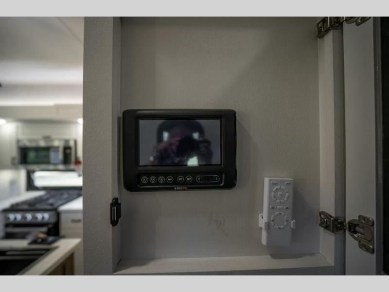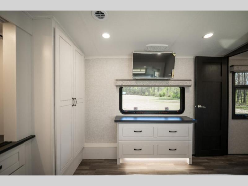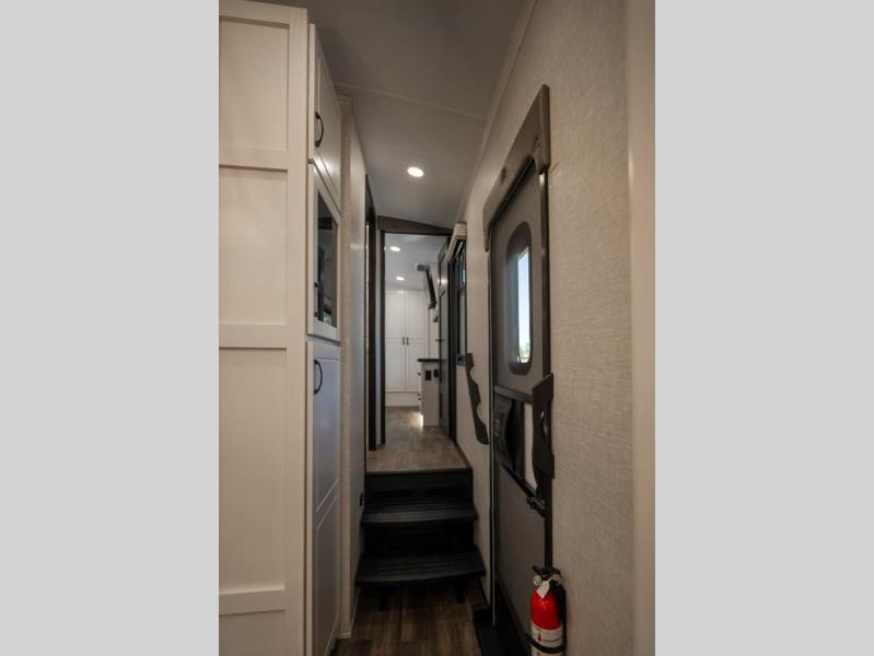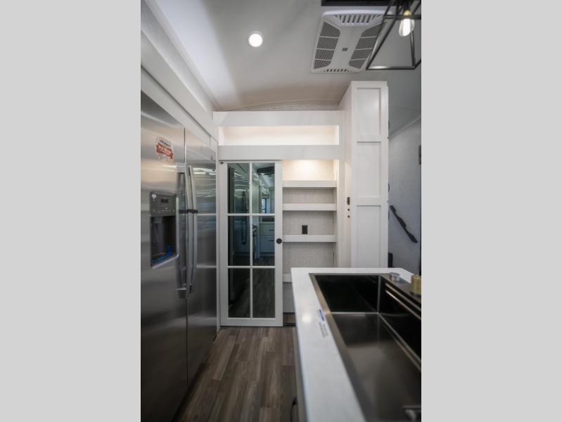 Prepare for great adventures in this fifth wheel! The rear living area features a massive L-shaped sofa which includes a hide-a-bed as well as recliner seats! Plus there's an additional theater seat all facing the entertainment center with a fireplace and 50" Smart TV. A flexible desk/coffee bar connects the living room to the kitchen so you can work or relax as needed. Meals will be easy to prepare with the island with sink and pull-out cutting board, plus pantry, microwave, and residential refrigerator. Up front you will find the private bedroom with its king bed, closet with drawers and hamper, and even a second TV. The full bath features a shower with seat and a linen closet for convenient storage.