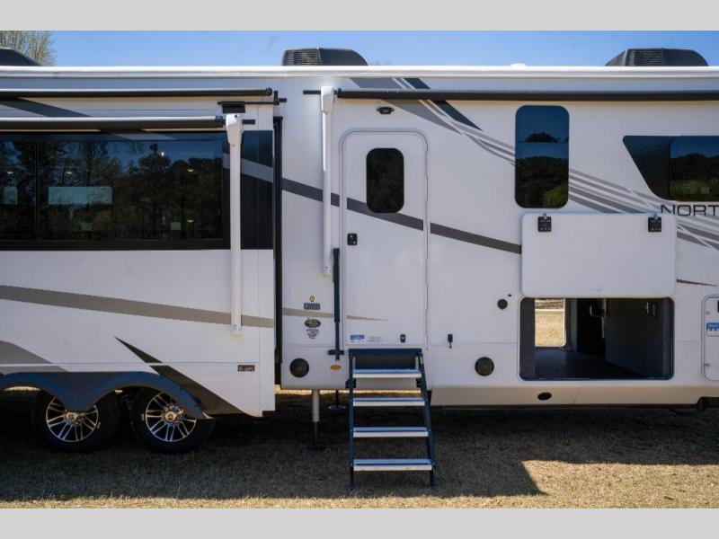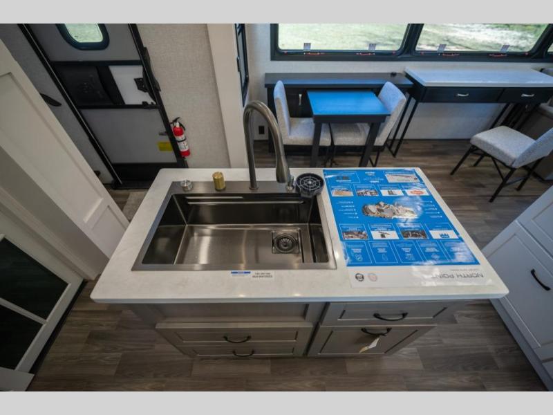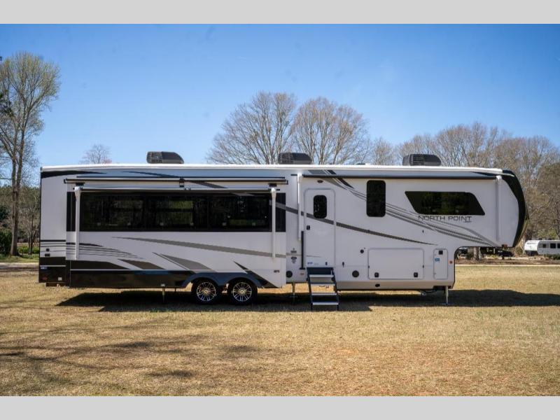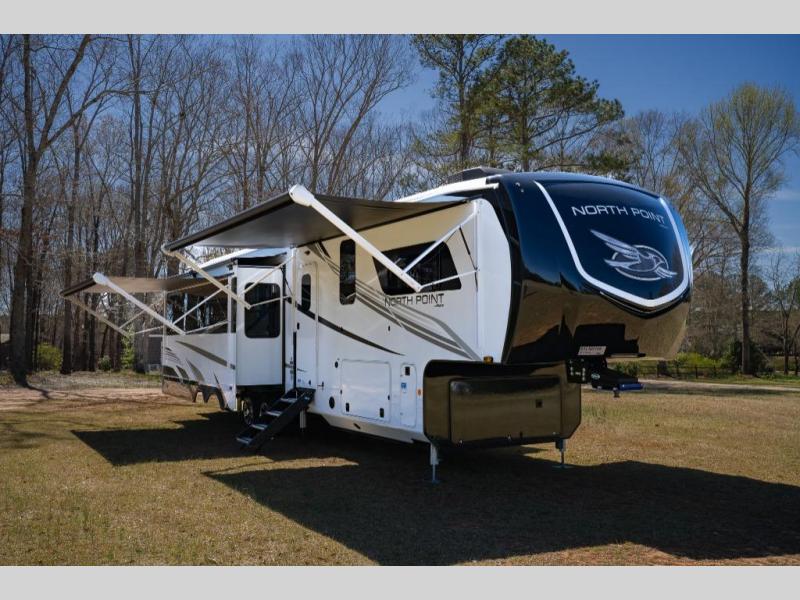With any North Point fifth wheel by Jayco you begin with a strong foundation with a custom frame, designed and sized specifically to best support each unit. Constructed with Stronghold VBL™ aluminum framed, vacuum bond laminated walls and the Magnum Truss™ XL6™ roof system with an Alpha roof membrane system, which is the strongest tested roof in the industry. The 5-Star Handling package is included with Uniroyal tires, a MORryde rubber pin box, Dexter axles with Nev-R-Adjust brakes, MORryde CRE-3000 rubberized suspension and wet bolt fasteners and bronze bushings. The interior has handcrafted hardwood glazed doors and drawers, vinyl flooring throughout, an integrated under-mount sink in the main bathroom, plus so much more you just have to see one to believe it all!
