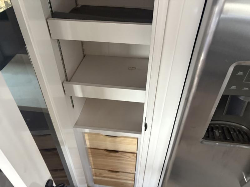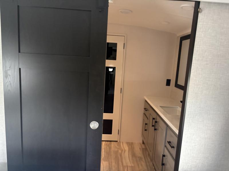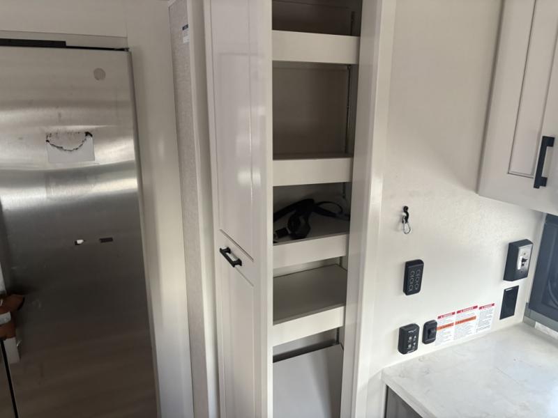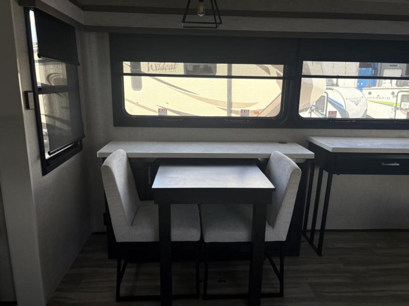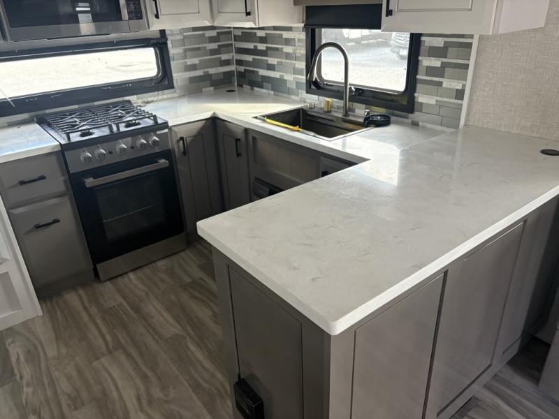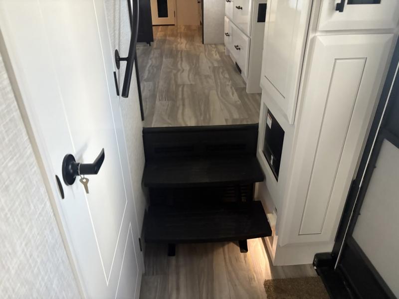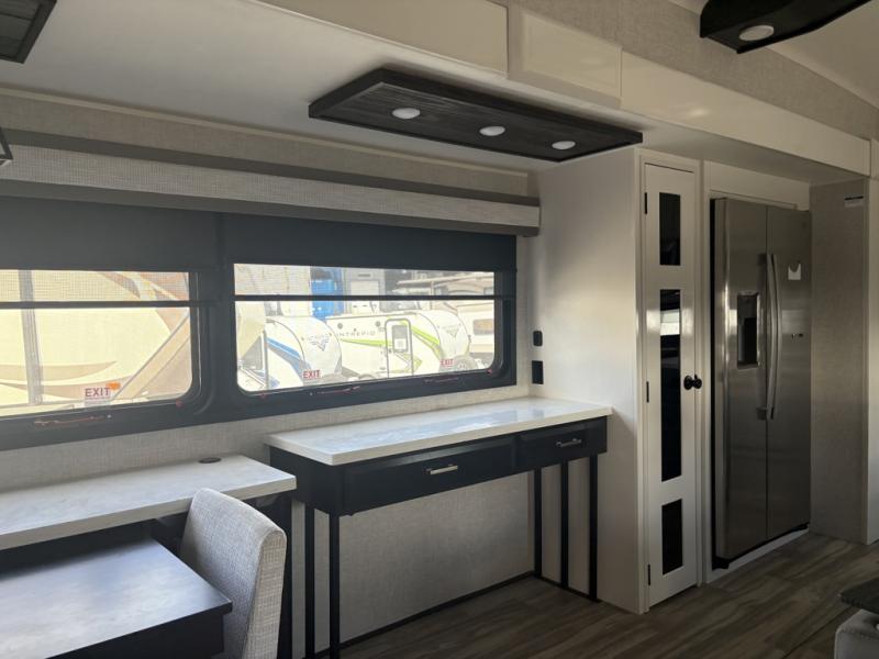 Triples slides, a desk/coffee bar, fireplace, and a huge master bath in front all indicate the kind of vacation you will experience in this Pinnacle Fifth Wheel! As you enter, a convenient half bath is located straight ahead. Slightly to your left, a nice seating area for gathering with family or friends to relax and watch TV, enjoy the fireplace while reading a book or watching a movie, and the dining table with chairs. The dinette slide also houses a 21 cu. ft. residential refrigerator and pantry. The rear kitchen features a u-shaped counter, all the appliances you need to cook like at home, even a pull-out butcher block space for chopping up your veggies. Back through and up the steps to your right in front, the master bedroom will make you feel like royalty with its king bed, plus luxurious full rear bath. A huge vanity with dual bath sinks will allow you both to get ready at the same time, plus there is a walk-in shower with a seat for added convenience. Speaking of walk-in, you will also love the spacious walk-in closet that includes washer/dryer prep.