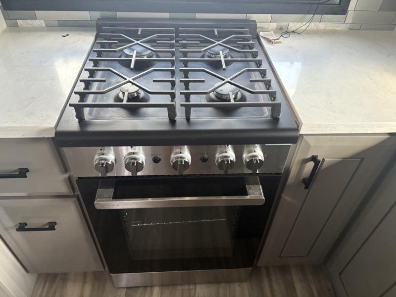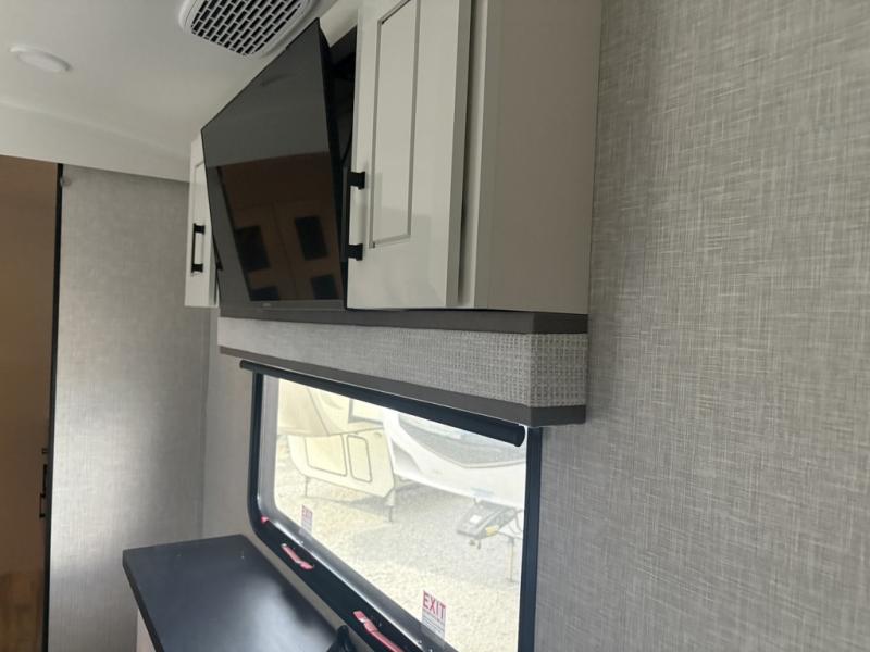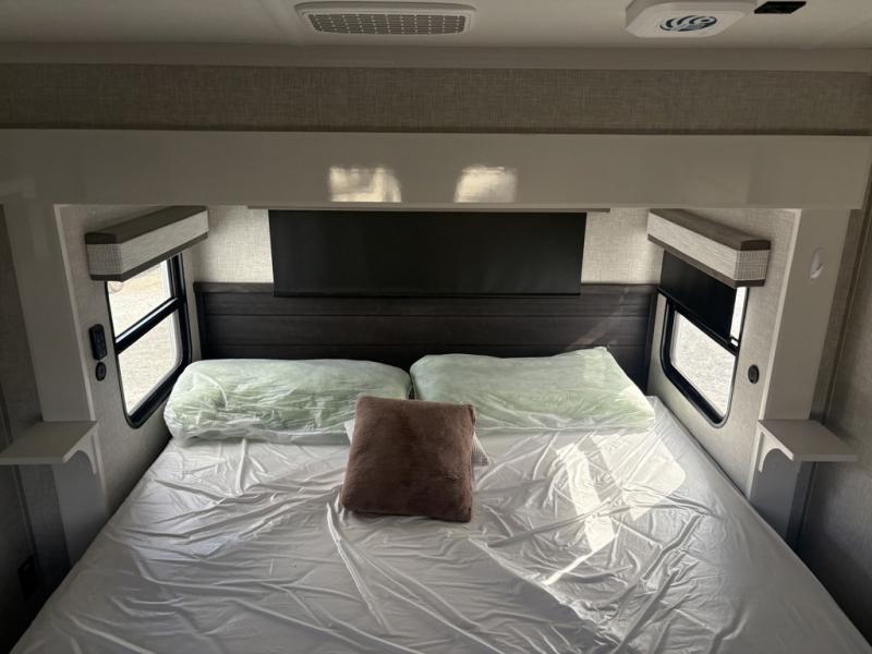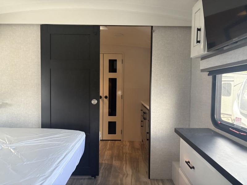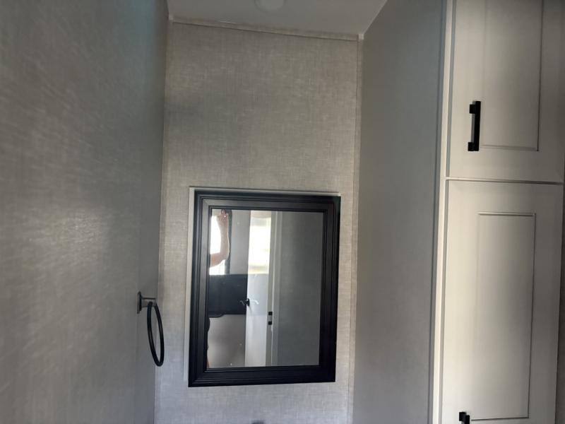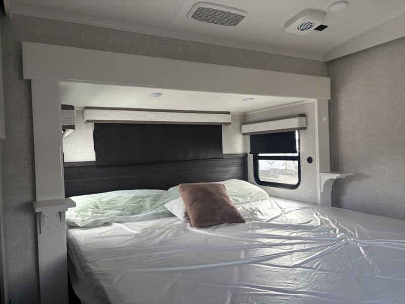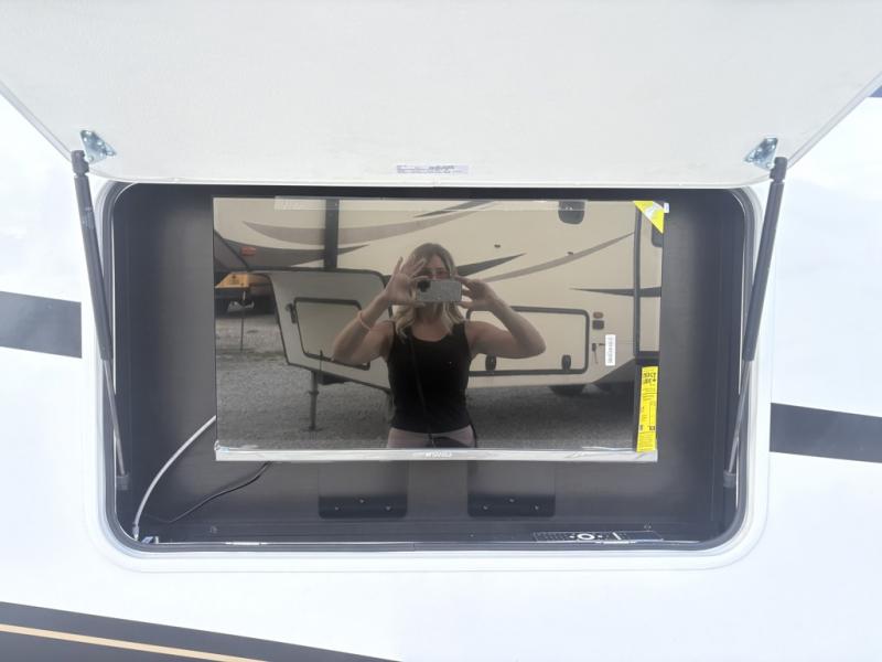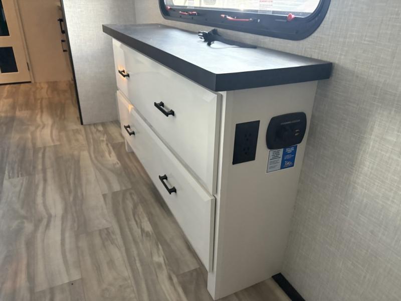 Triples slides, a desk/coffee bar, fireplace, and a huge master bath in front all indicate the kind of vacation you will experience in this Pinnacle Fifth Wheel! As you enter, a convenient half bath is located straight ahead. Slightly to your left, a nice seating area for gathering with family or friends to relax and watch TV, enjoy the fireplace while reading a book or watching a movie, and the dining table with chairs. The dinette slide also houses a 21 cu. ft. residential refrigerator and pantry. The rear kitchen features a u-shaped counter, all the appliances you need to cook like at home, even a pull-out butcher block space for chopping up your veggies. Back through and up the steps to your right in front, the master bedroom will make you feel like royalty with its king bed, plus luxurious full rear bath. A huge vanity with dual bath sinks will allow you both to get ready at the same time, plus there is a walk-in shower with a seat for added convenience. Speaking of walk-in, you will also love the spacious walk-in closet that includes washer/dryer prep.