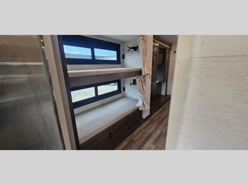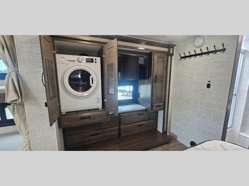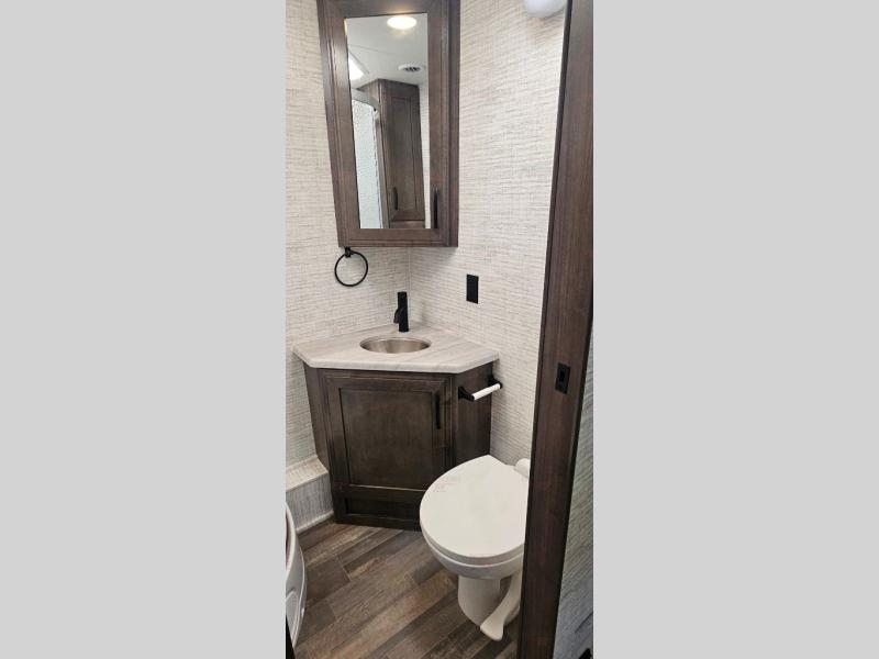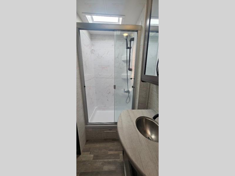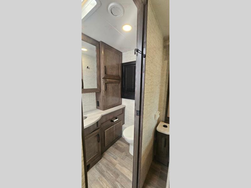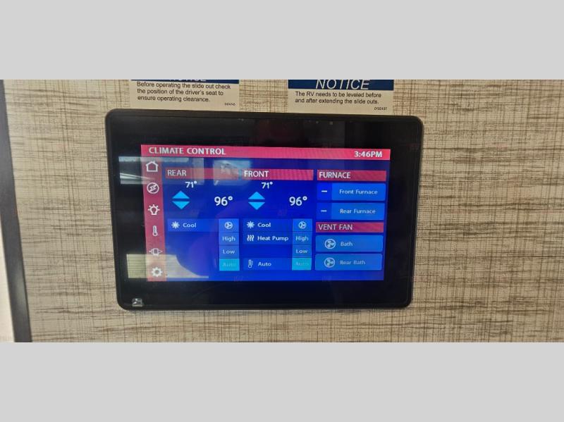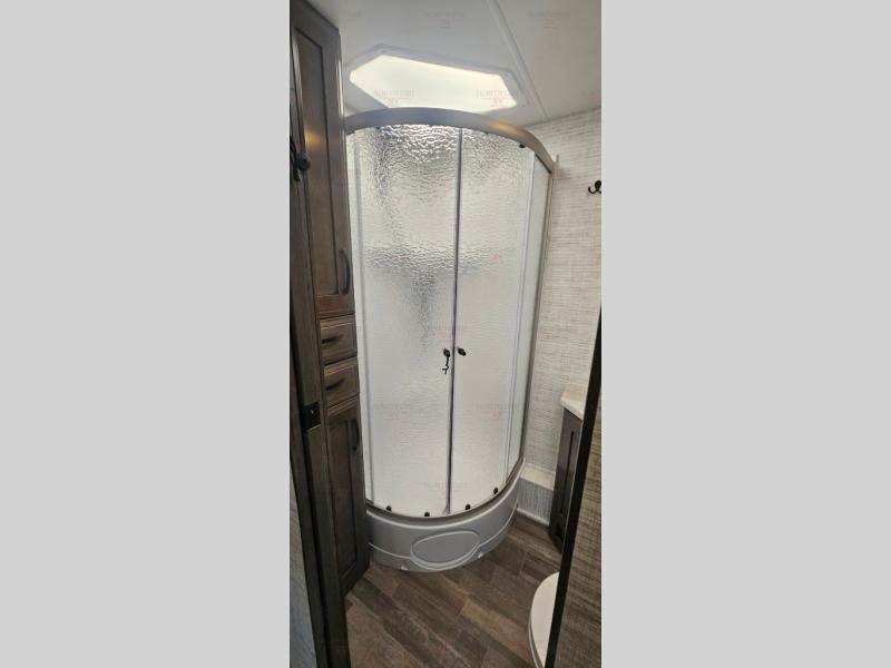 This Precept Class A gas motorhome is outstanding because of its two full bathrooms! No one will have to wait to get cleaned up after a day of outdoor fun because you have a 32" x 32" radius shower in one bathroom and a 30" x 36" shower in the other. Plus, the second bathroom is connected to the bedroom creating a delightful master suite. For compact sleeping space, you'll find a set of bunk beds, and the residential refrigerator will do an excellent job of providing storage space for all of the food needed to feed everyone. You even have more sleeping space once you fold out the booth dinette and tri-fold sofa. Before bed, you should head outside to sit underneath the 12' electric awning with LED lights and watch the exterior LED TV.