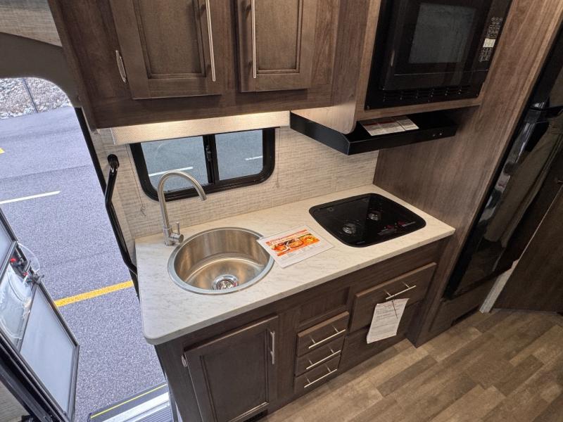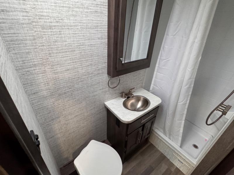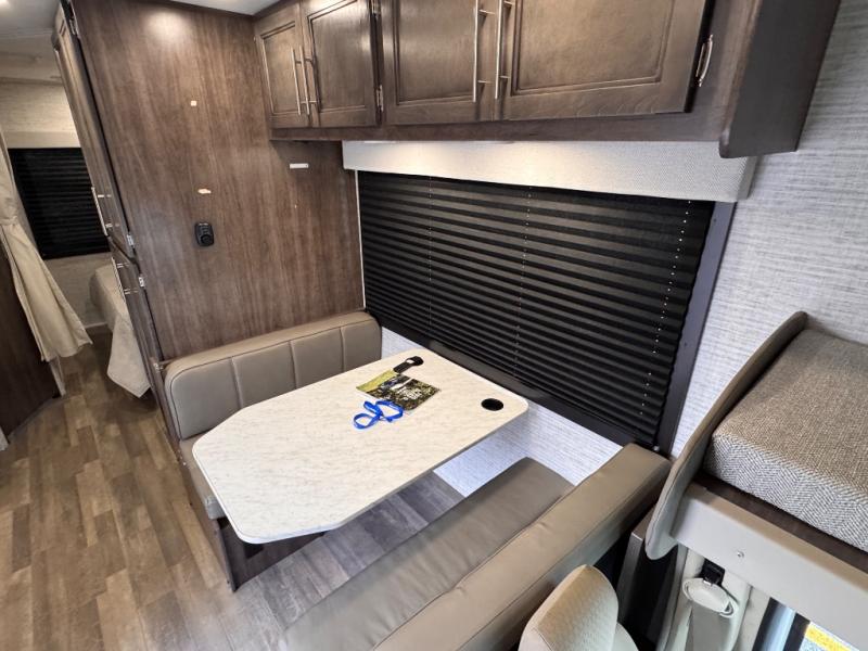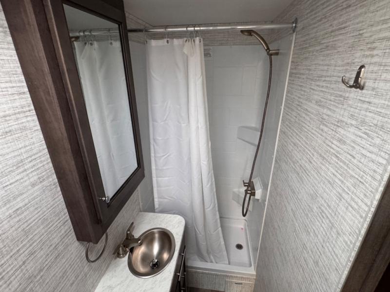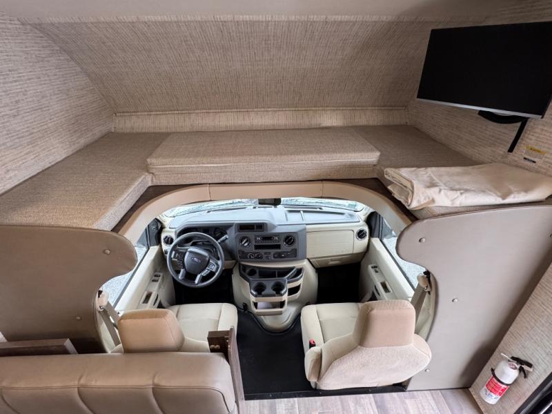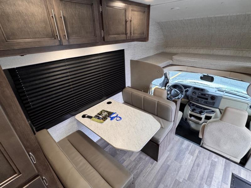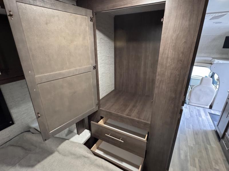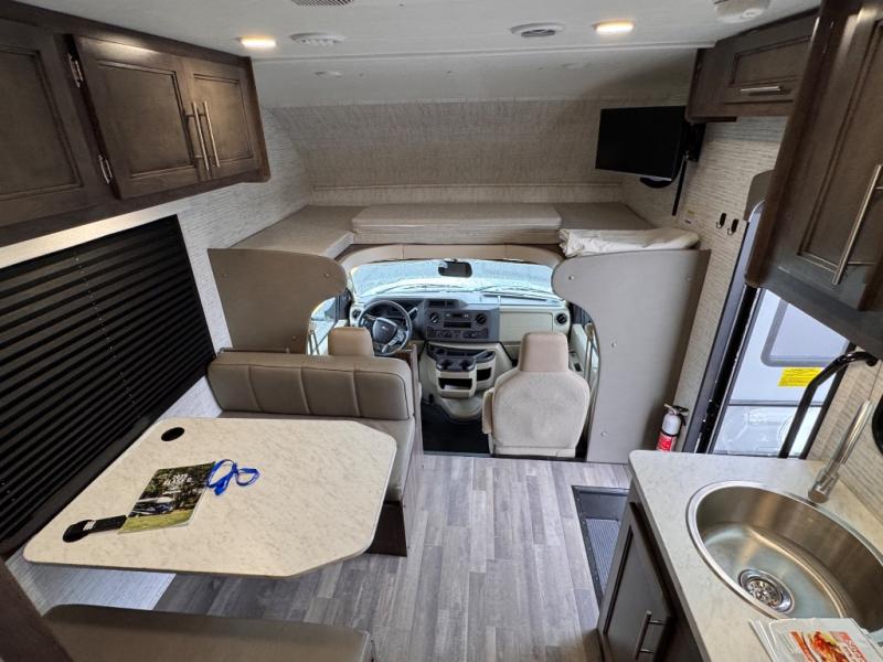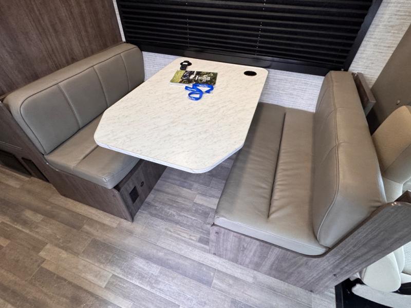 There's a comfortable place to sleep for everyone in this motorhome! From the corner 60" x 70" queen bed that slides out to the bunk over cab, and even the 42" x 70" booth dinette once converted. You can store your favorite snacks and hang up your clothes in the wardrobe/pantry. The chef can prepare delicious meals with the two burner cooktop and if there happens to be any leftovers then they can be stored in the 10 cu. ft. 12V refrigerator. The rear corner bathroom has a 24" x 36" shower that you are sure to enjoy after a long day of traveling!