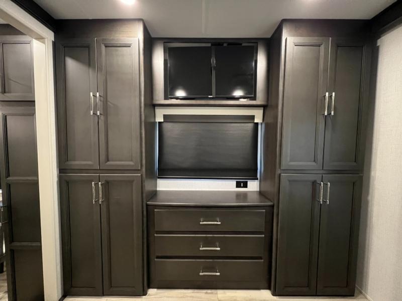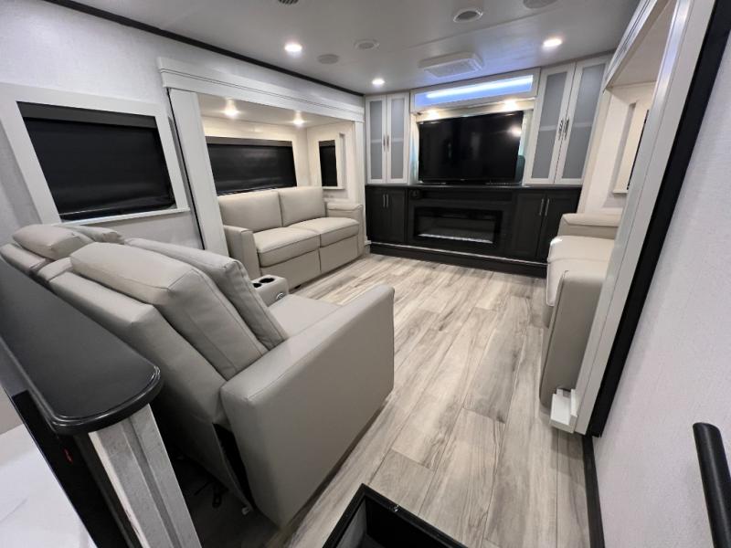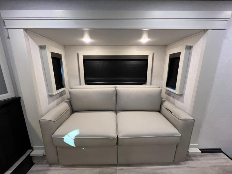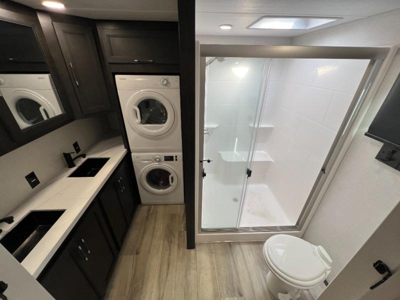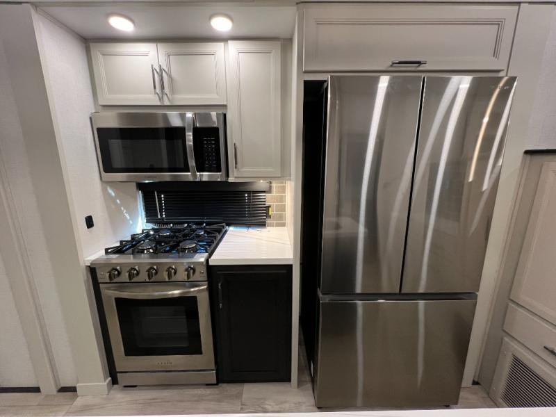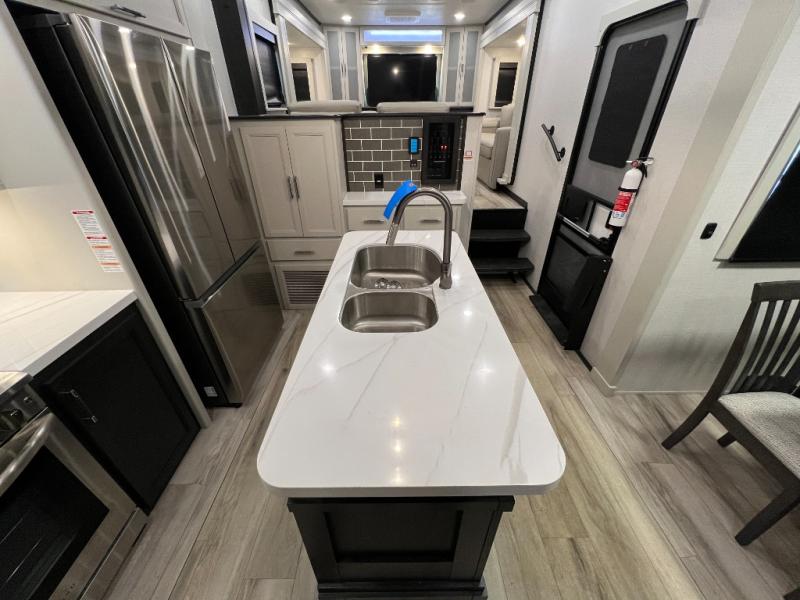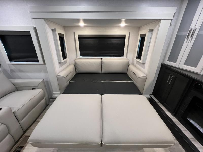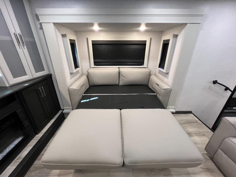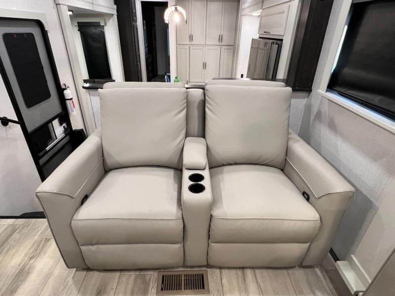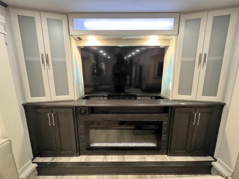 This fifth wheel is decked out in luxuries! The full rear bathroom has a walk-in shower to freshen up in each morning, a dual sink vanity for two to get ready at once, and an area prepped to add an optional washer and dryer. You will enjoy a good night's rest on the king bed slide inside the private bedroom and others can sleep on the opposing tri-fold sofa sleeper slides once they are converted. There are two kitchen pantries to hold everyone's favorite snacks, one of which is a walk-in pantry. The 18 cu. ft. residential refrigerator will keep your perishables fresh and you also have the option to switch it out for a 20 cu. ft. 12V refrigerator instead. The front living area has a front entertainment center with a 40" fireplace and a 50" TV, plus there is Thomas Payne theater seating with massage, heat, LED lights, and a USB charging station to keep your electronics charged while you relax!