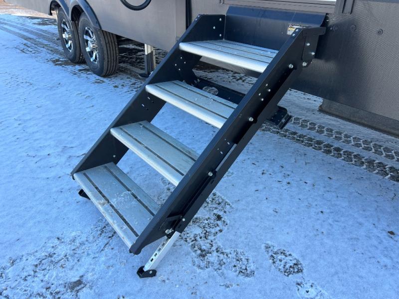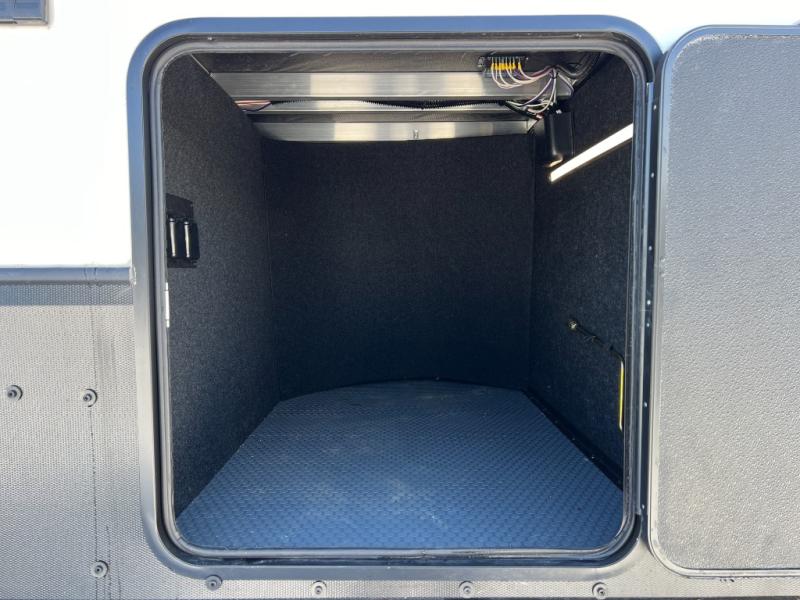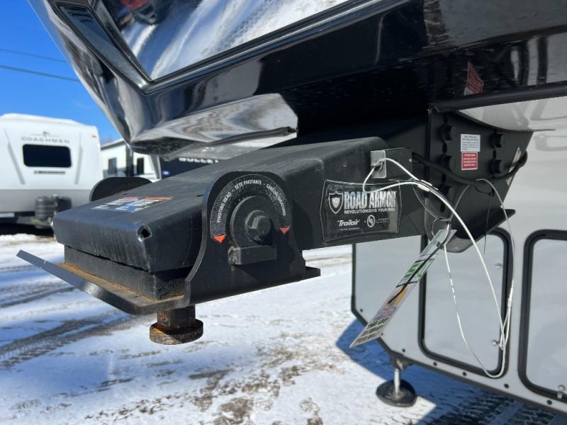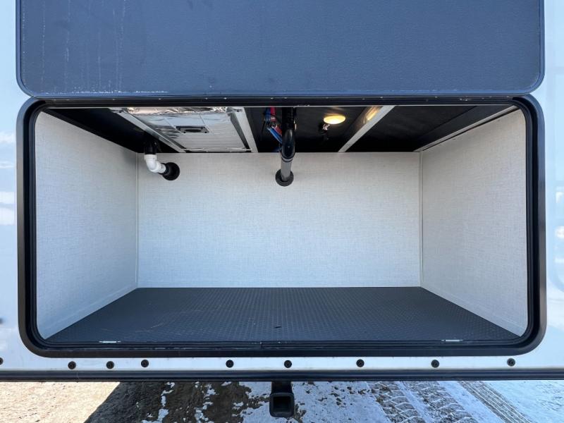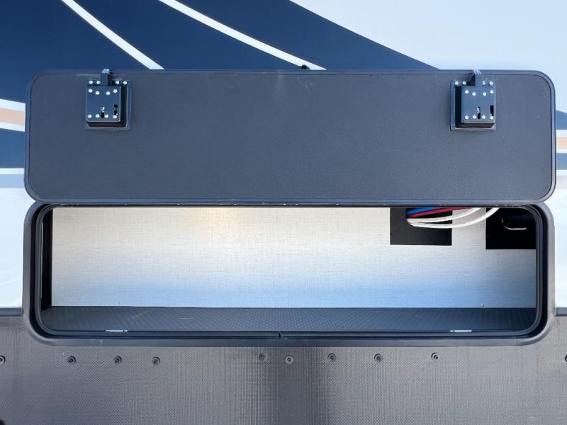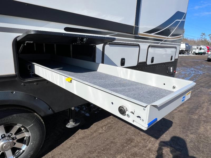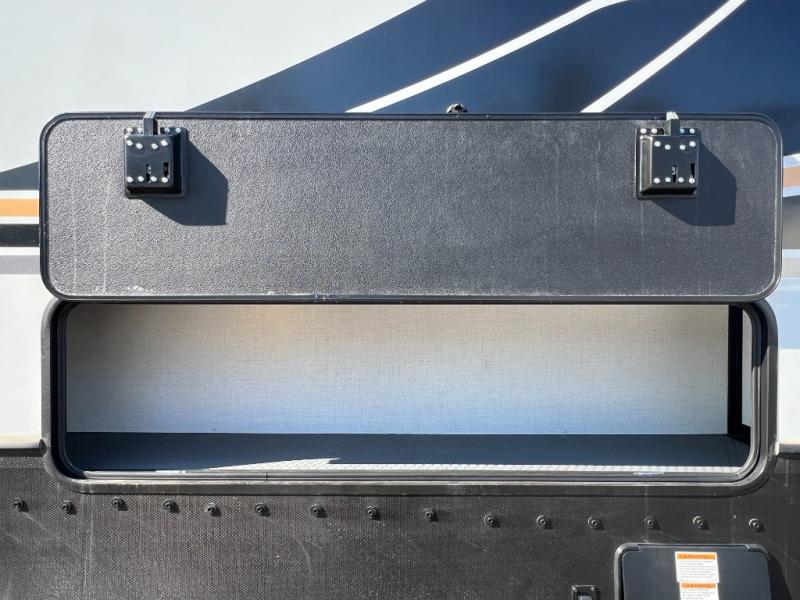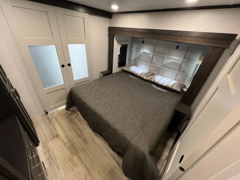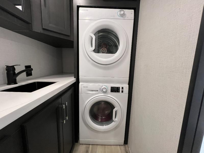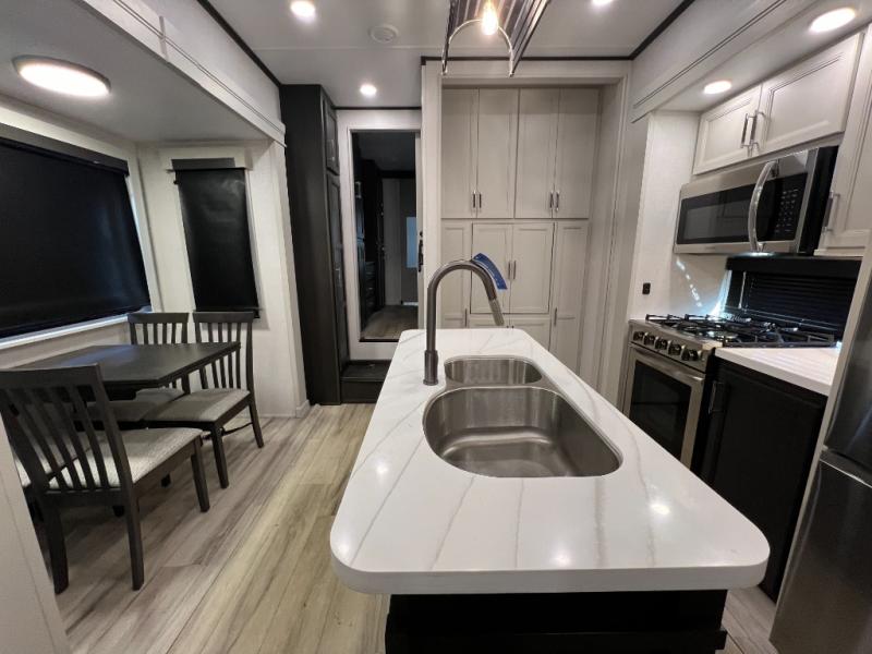 This fifth wheel is decked out in luxuries! The full rear bathroom has a walk-in shower to freshen up in each morning, a dual sink vanity for two to get ready at once, and an area prepped to add an optional washer and dryer. You will enjoy a good night's rest on the king bed slide inside the private bedroom and others can sleep on the opposing tri-fold sofa sleeper slides once they are converted. There are two kitchen pantries to hold everyone's favorite snacks, one of which is a walk-in pantry. The 18 cu. ft. residential refrigerator will keep your perishables fresh and you also have the option to switch it out for a 20 cu. ft. 12V refrigerator instead. The front living area has a front entertainment center with a 40" fireplace and a 50" TV, plus there is Thomas Payne theater seating with massage, heat, LED lights, and a USB charging station to keep your electronics charged while you relax!