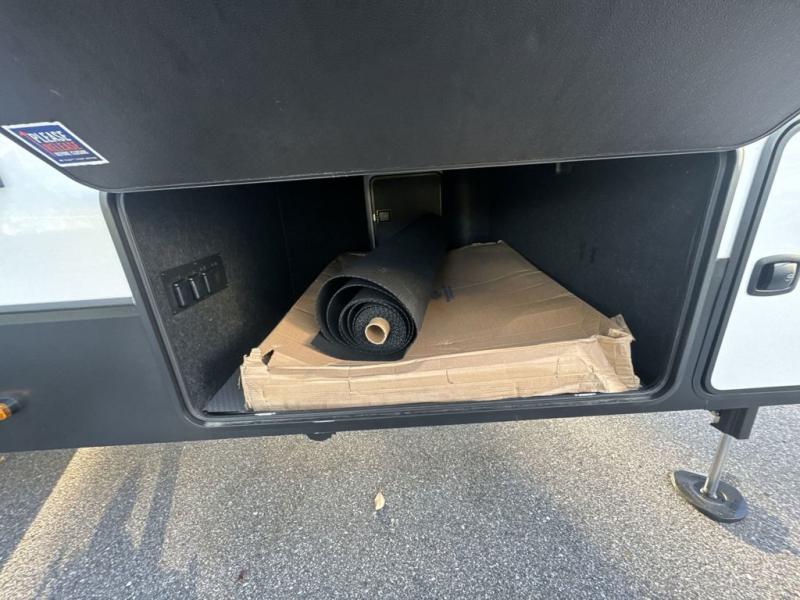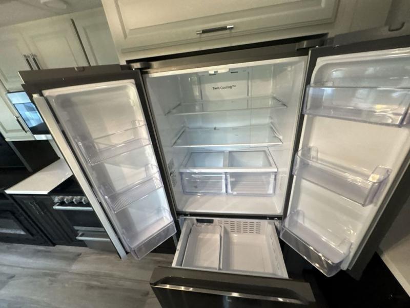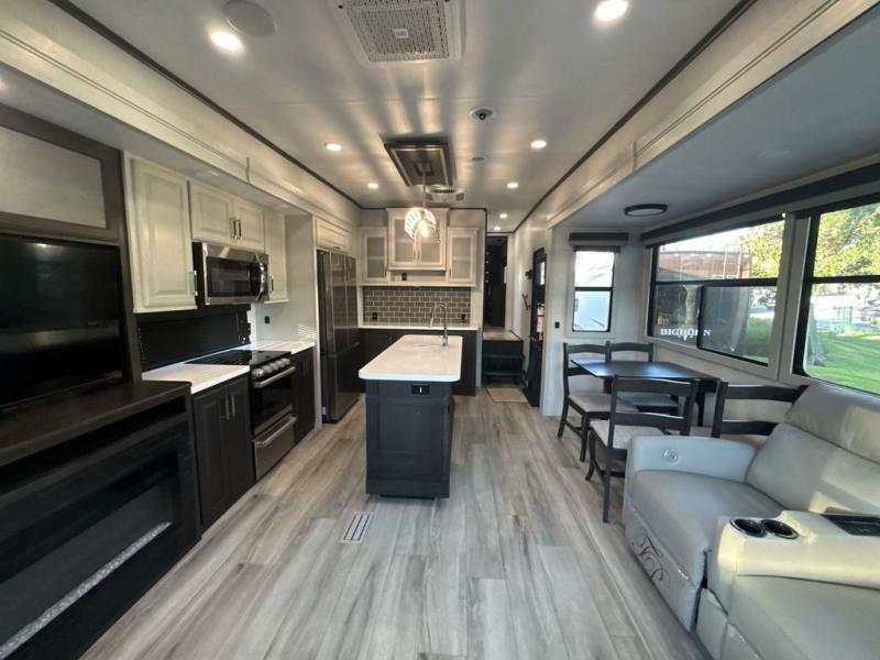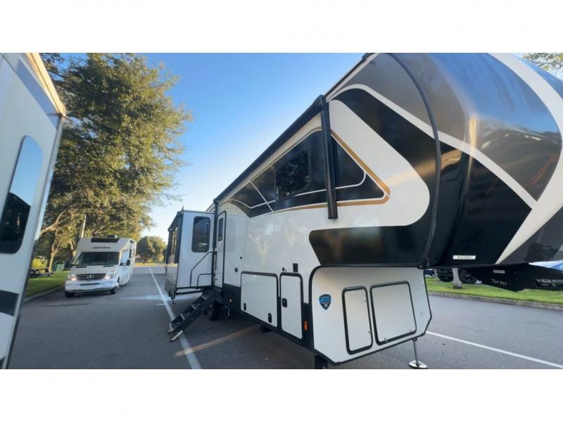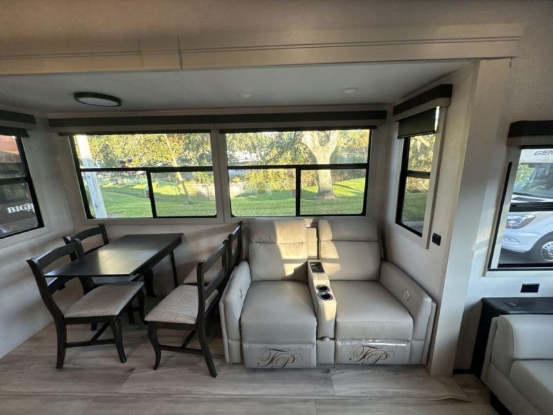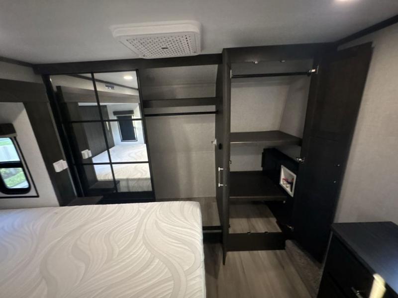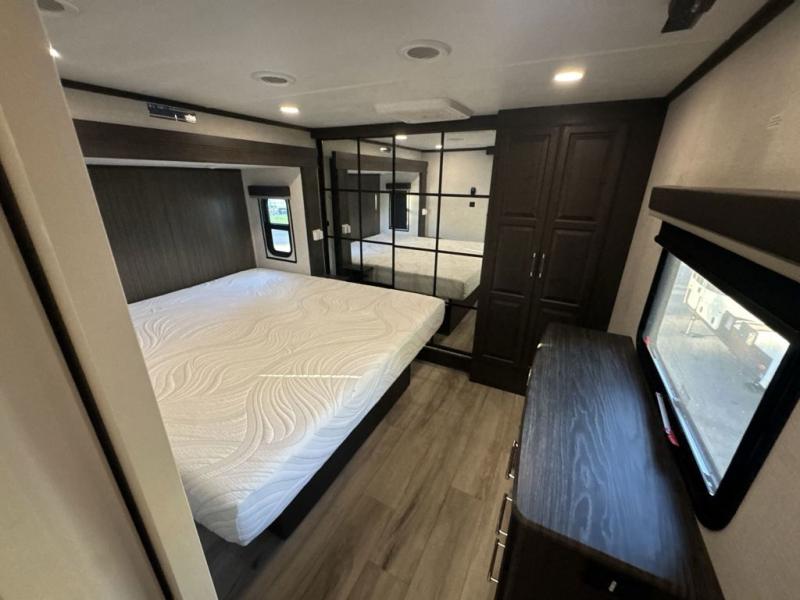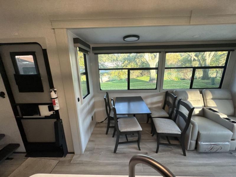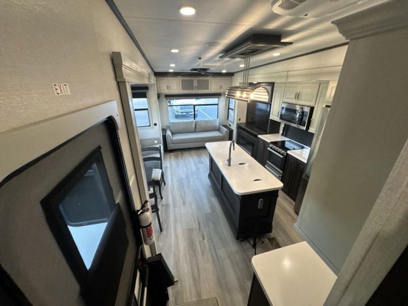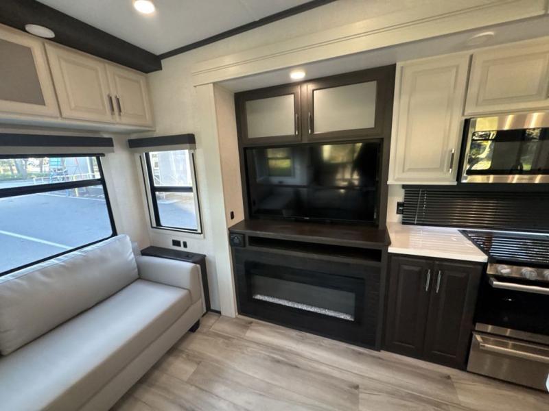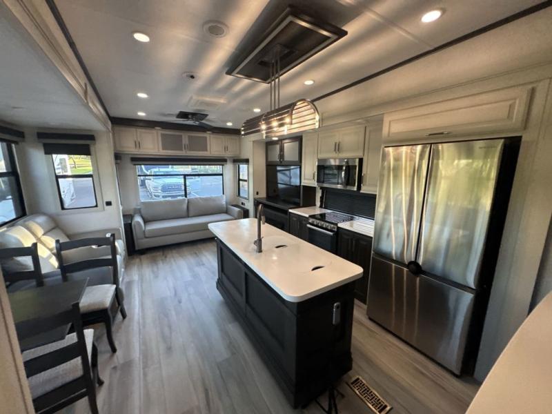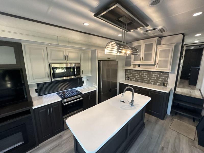 For the couple that loves to travel, you will truly enjoy this spacious fifth wheel featuring triple slides with dual opposing in the main combined kitchen and living area. Here you can entertain friends, even overnight, thanks to the hide-a-bed sofa sleeper. A free standing dinette and four chairs makes dining feel like home, and you will love the spacious kitchen for cooking with a large center island including prep space next to the double sink. A side hutch offers space for dishes, or place for other small appliances to be left out. The master bedroom is just beyond the spacious bath on your left up the steps and behind a space saving sliding barn style door. You will sleep comfortably on the king bed that slides out to provide even more floor space for getting dressed, and there is also a prepped area for adding a stackable washer and dryer if you choose. The bath provides a large shower and vanity with dual sinks so two can easily get ready at once!