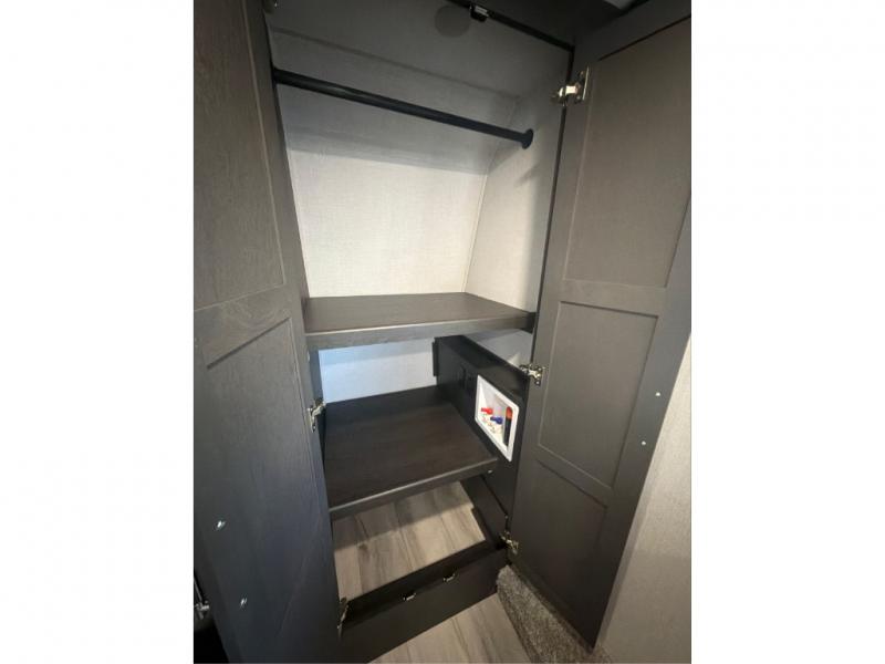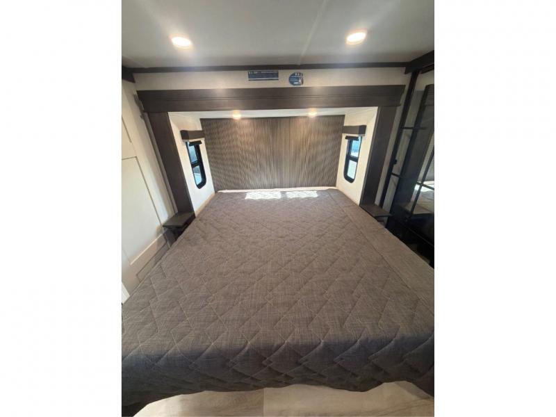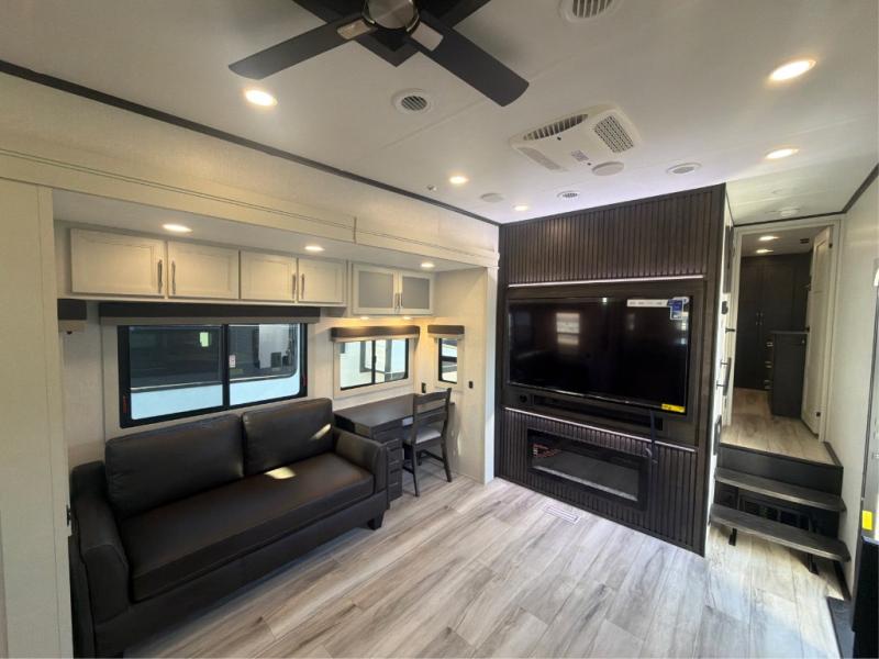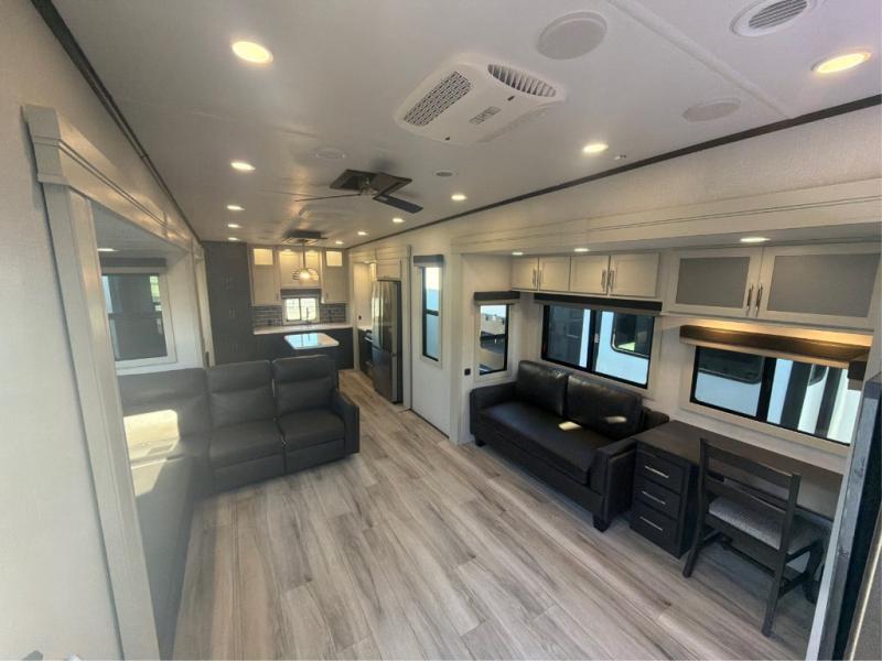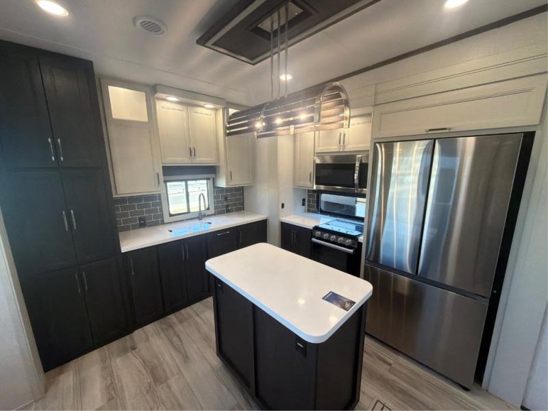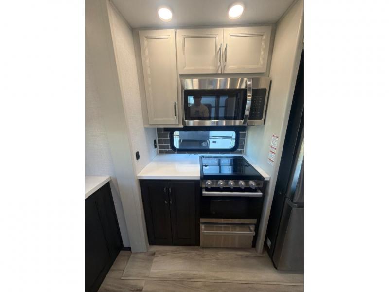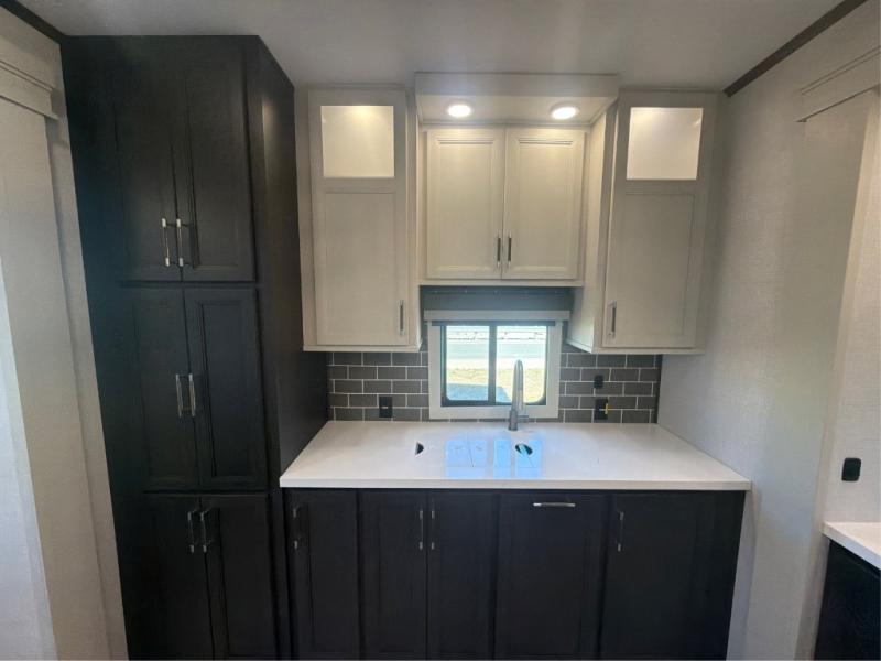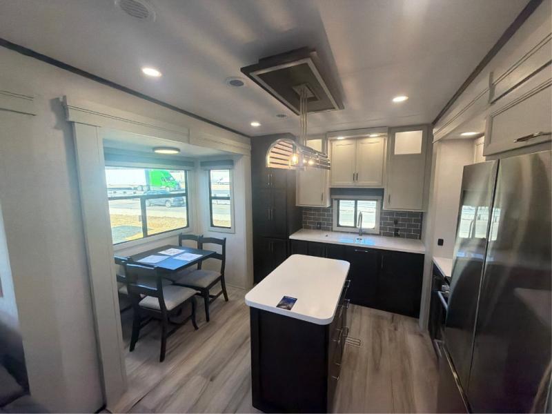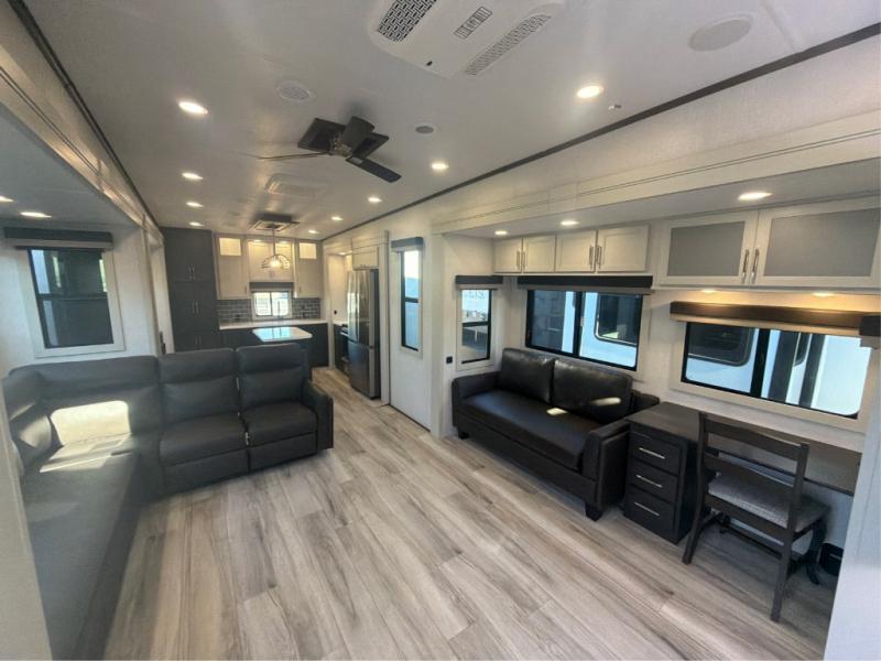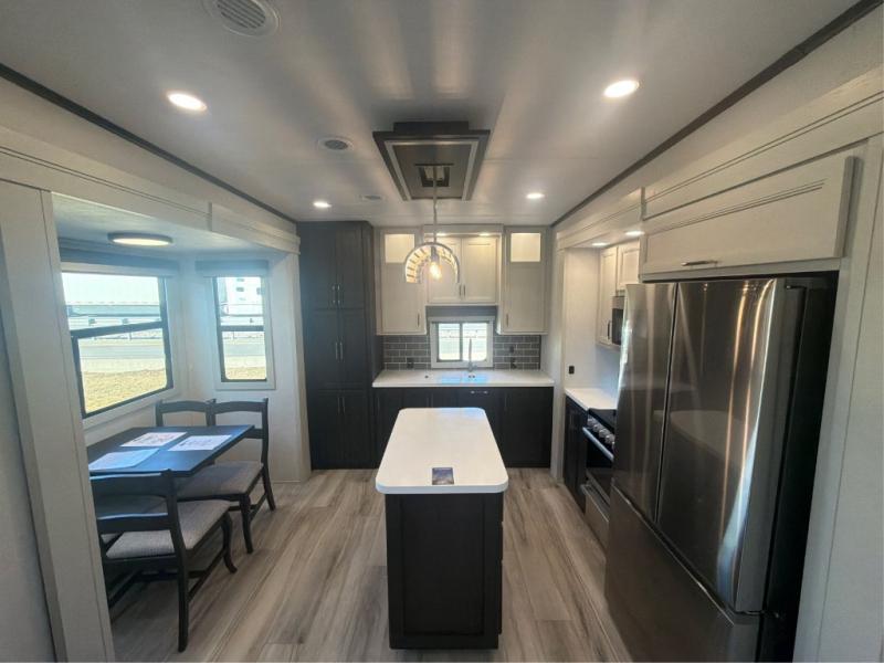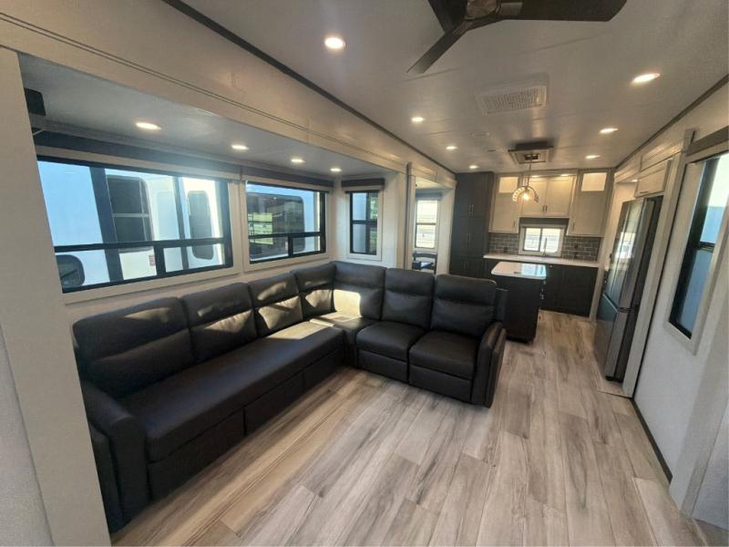 This rear kitchen fifth wheel makes extended stays or weekend trips to the lake enjoyable! The chef of your group will find plenty of counter space with the included kitchen island, plus there is a pantry and 18 cu. ft. residential refrigerator for food storage. A free-standing dinette provides a place to dine together, and the largest L-shaped sofa with recliners will be the perfect spot to relax with a movie. If you have guests, they could sleep here or on the hide-a-bed sofa sleeper. The dual entry bath includes a shower with a seat for added comfort, and the front master bedroom will feel just like home with its king bed slide out and master closet. There is also a dresser and stackable washer and dryer prep if you want to add those appliances!