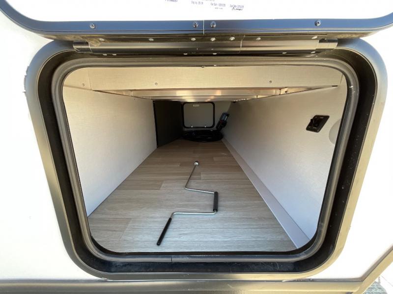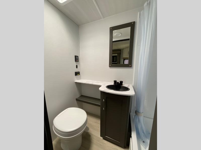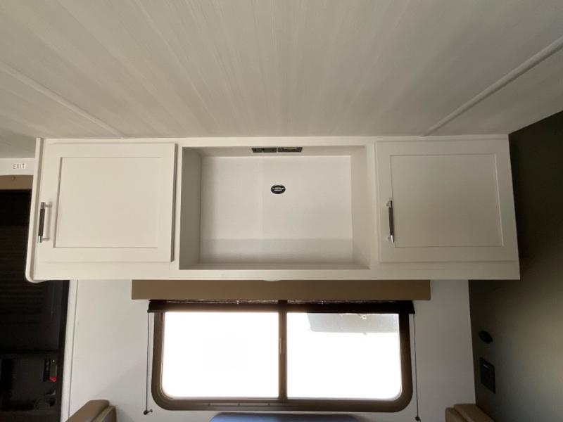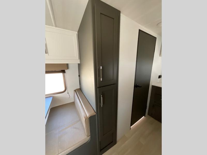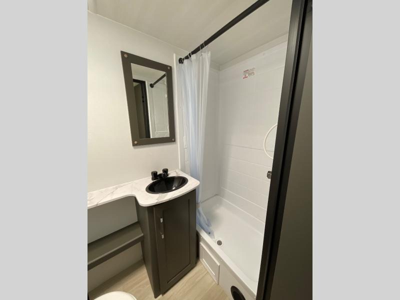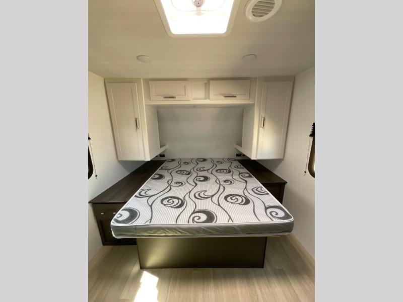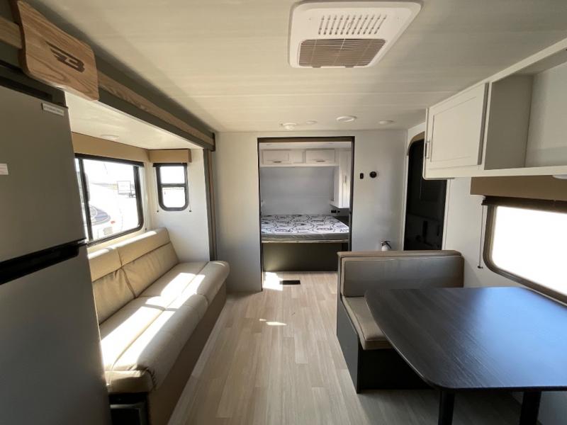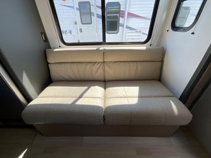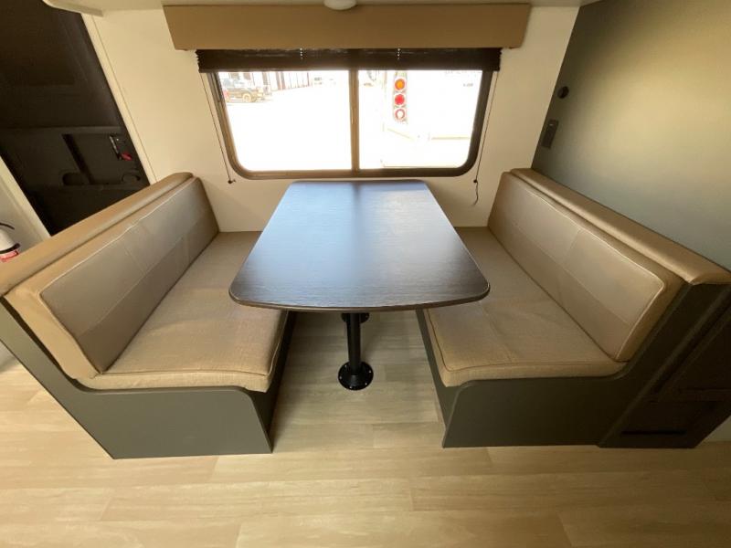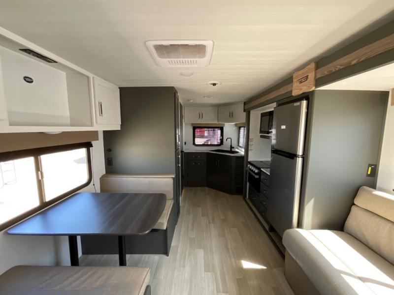 This travel trailer with a large slide out is sure to meet all your needs. When you arrive at the campground, you can put out the patio awning, unload the pass-thru storage, and relax in your camp chairs. The cooktop and microwave oven in the rear corner kitchen will let you make lunch for everyone, and the 8 cu. ft. refrigerator and pantry will help you keep food stocked. You will love having a queen bed to sleep on each night, and the booth dinette and jack knife sofa provide seating and sleeping space for guests!