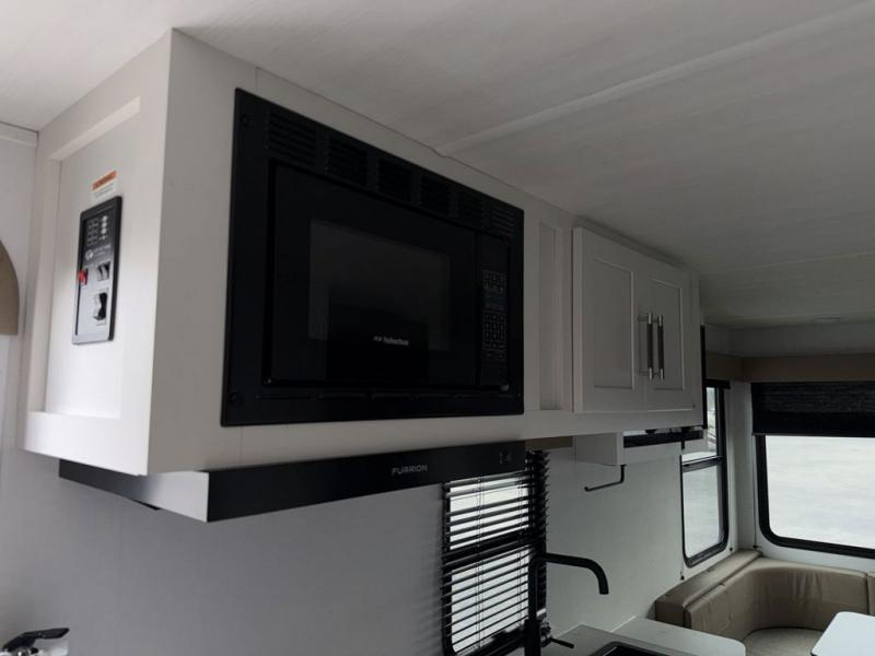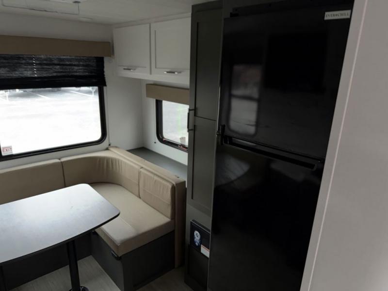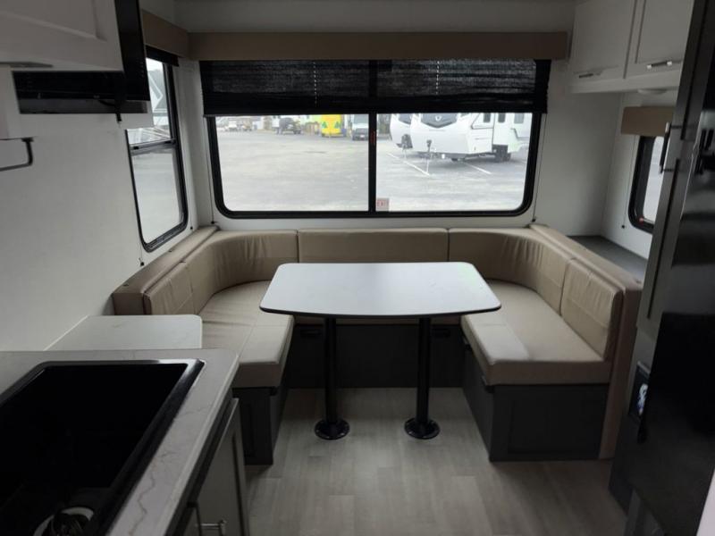Simple and lightweight; this travel trailer is the unit you've been searching for! Once you arrive at your destination, unload the pass-thru storage, then head inside to start lunch in the full kitchen. Here, you'll find a microwave oven, two burner cooktop to cook meals on, and an 8 cu. ft. refrigerator for perishables. The rear U-shaped dinette can serve as dining and sleeping space for your guests, while you take the front corner queen bed. Don't let this travel trailer slip away!