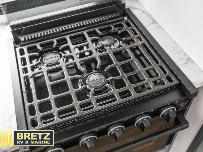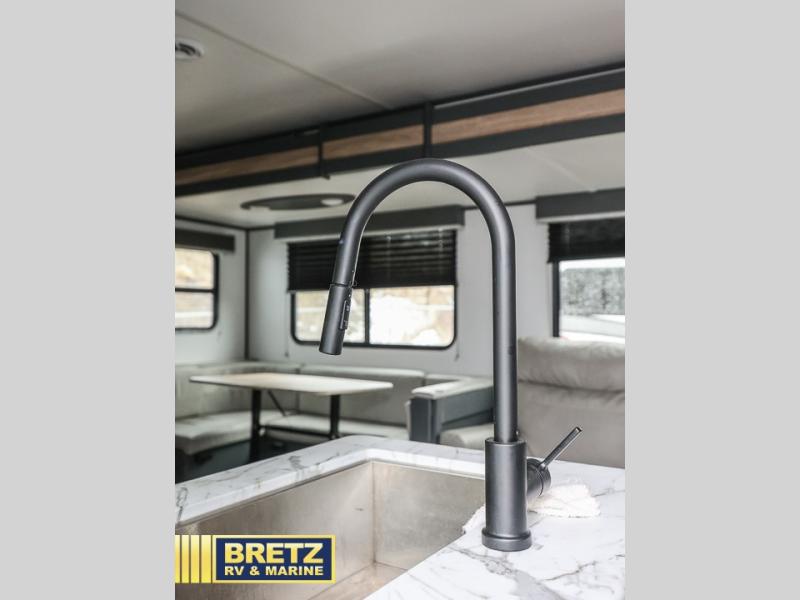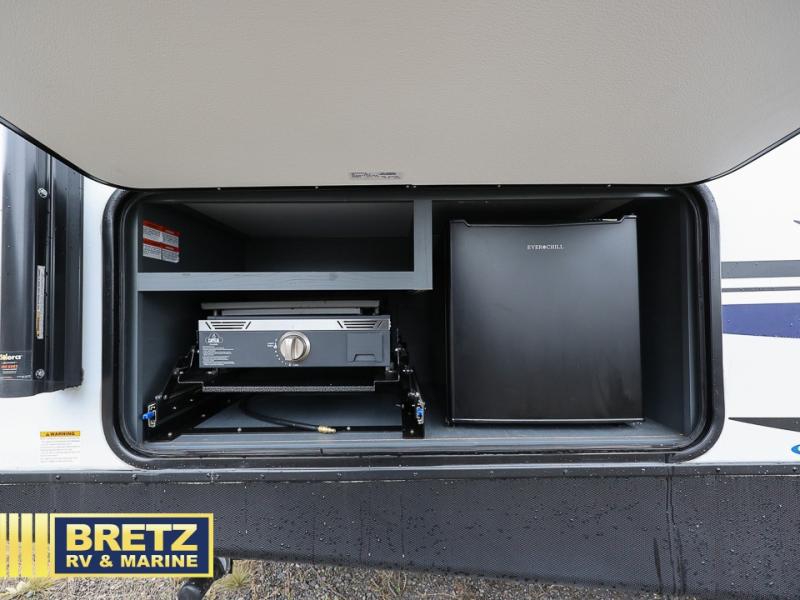 Double-size bunks make this travel trailer fun for all! There is even flip-up bunk for added storage and a rear cargo door where you can quickly unload gear from under the bunks. Whether your crew is playing a game around the U-shaped Do-More dinette table, relaxing on the tri-fold sofa sleeper, or making lunch on the outdoor kitchen, a good time is sure to be had! The chef will also love the interior kitchen with a three burner gas range/oven, a Furrion microwave, an 8 cu. ft. refrigerator, and a flip-up counter for more prep space. And don't overlook the front private bedroom, complete with a walk-around queen bed, plus dual nightstands and dual wardrobes!