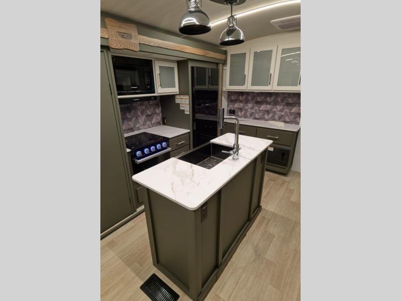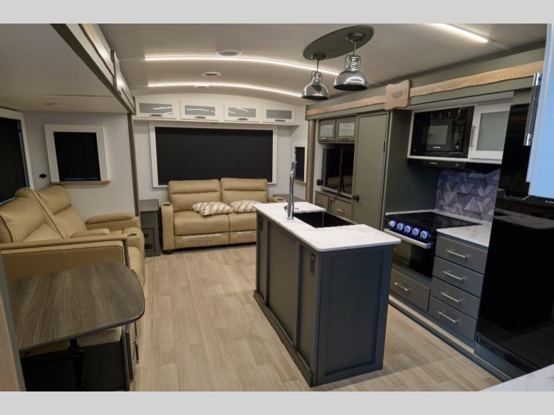 Weekend trips to the campground are made easy in this travel trailer! There are dual opposing slides in the combined kitchen and living area to provide you with ample space to stretch out. A kitchen island will come in handy when prepping meals, plus you'll have all the appliances needed to cook them. You will find comfortable seating on the rear tri-fold sofa sleeper, Do-More dinette table, and theater seats across from the entertainment center and fireplace. When you're ready to call it a night, the front private bedroom with a queen bed will be calling your name, and the full bath onboard will let you freshen up each day!