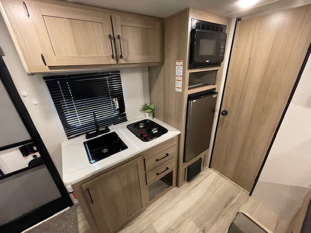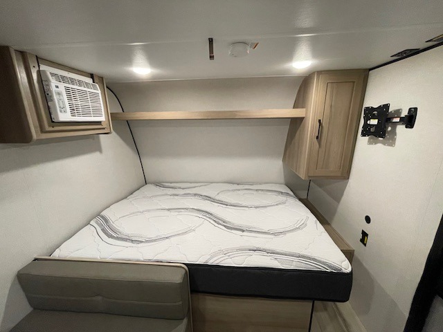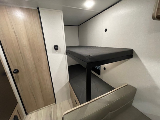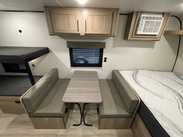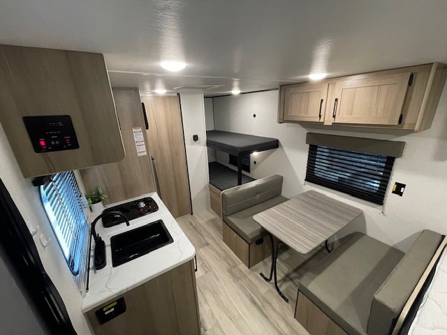 After making dinner on the two burner cooktop or inside the microwave, you can dine at the booth dinette or outside under the 8' power awning if you brought along your camping chairs. Either way you will be comfortable and the dinette may even sleep one person if needed. After playing outdoors all day, everyone can return to get cleaned up in the private toilet and shower room then fall asleep on the queen bed up front or the bunk beds in the rear. And everyone can wake up the next morning to do it over again.