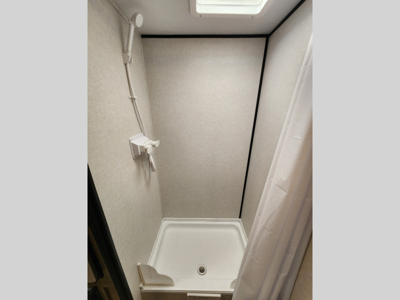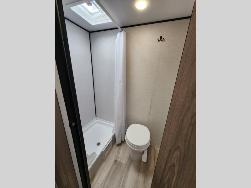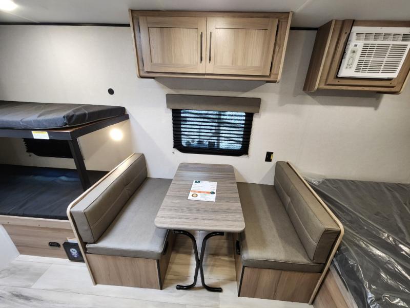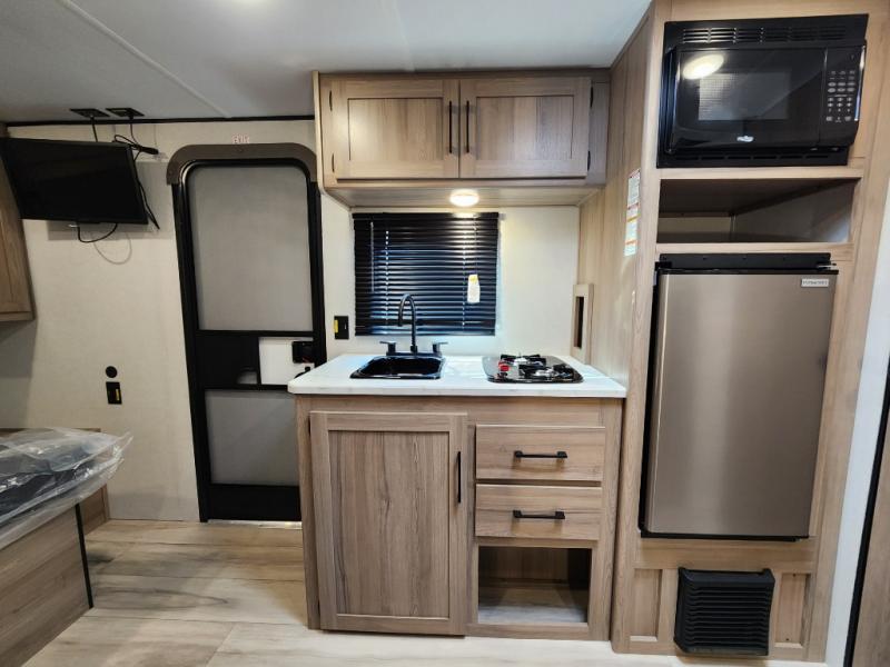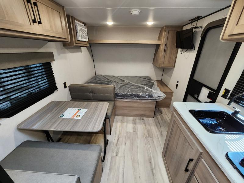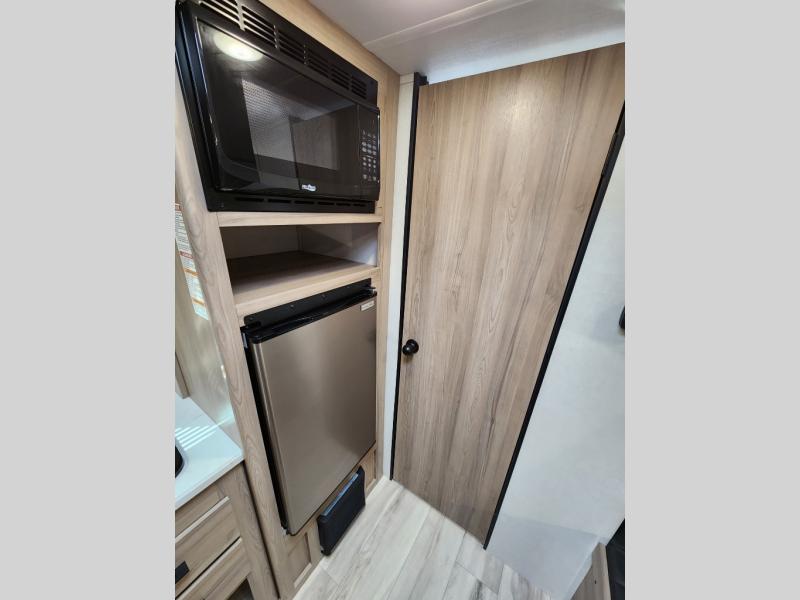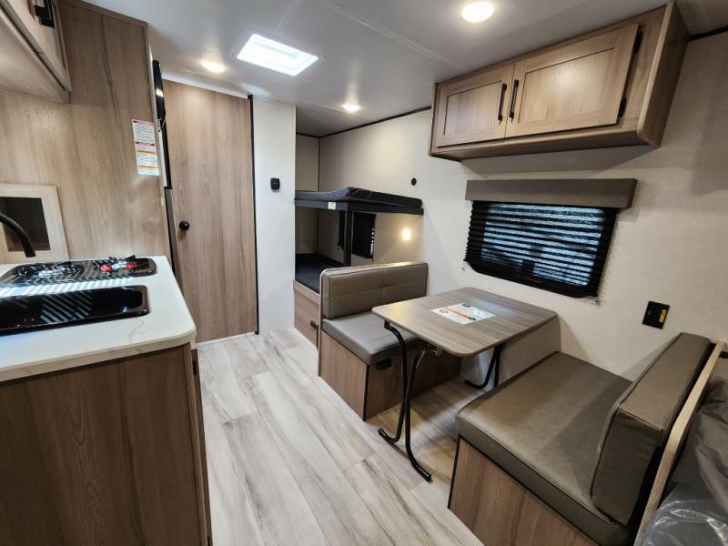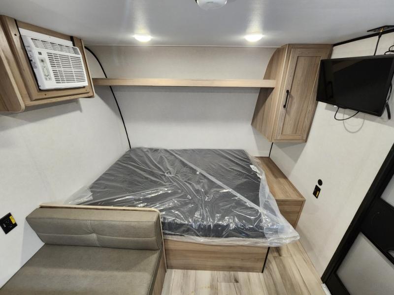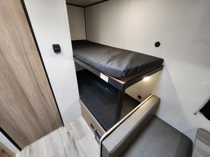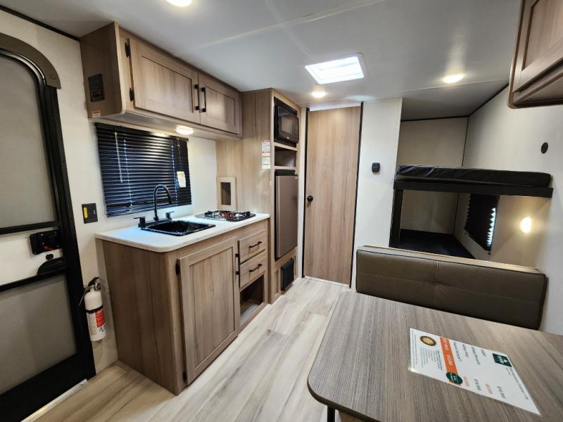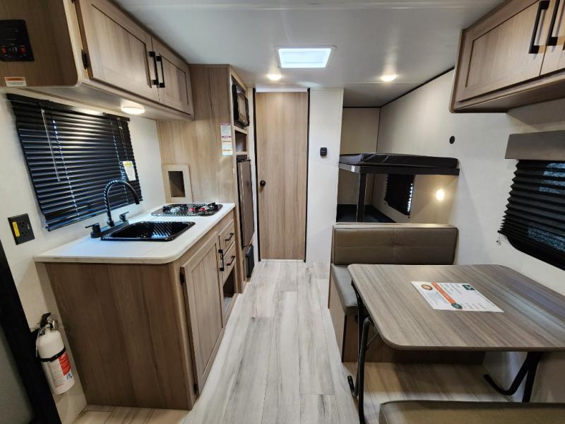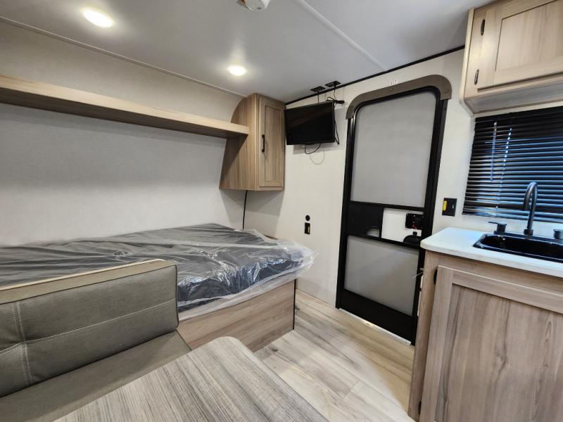 With any Coleman travel trailer, you will experience Keystone's quality throughout, plus enjoy lightweight towing to the campground or RV park. There is a walkable roof, tinted safety glass windows, and a power awning outdoors for an inviting space to relax. The friction hinge entry door is another convenience you'll appreciate, and there is Furrion backup camera prep if you want the option to make parking easier. Inside, you'll find blackout night shades, a 6' 6" ceiling height, bedside outlets, and many more comforts.