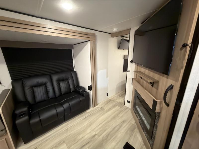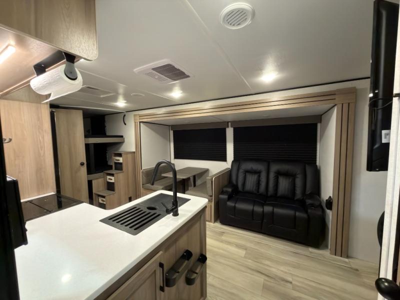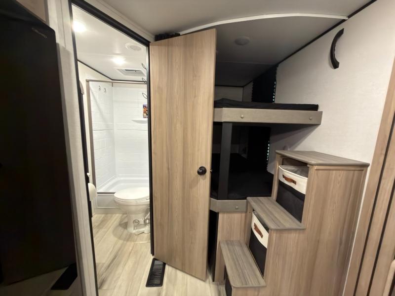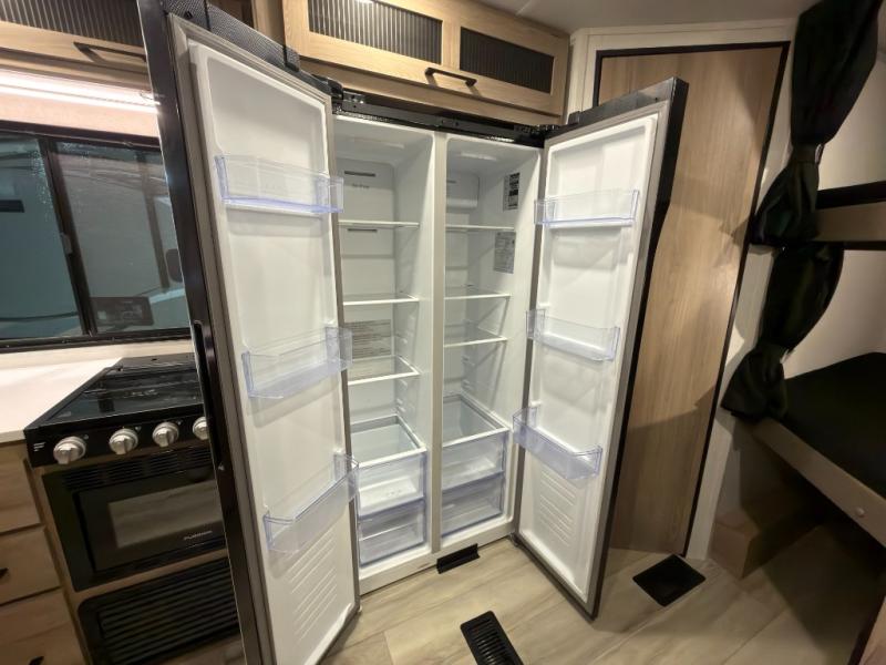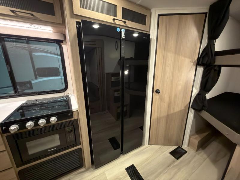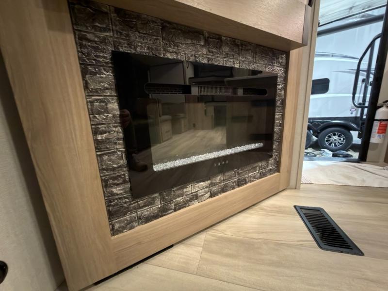If you're needing additional sleeping space and added comfort in your next RV, this travel trailer is the one! There are double-size bunks with steps in the back for your guests or little ones, and the full bath includes one of the dual entry doors to the unit for added convenience. The combined kitchen and living area is made spacious thanks to the large slide out which houses the sofa and booth dinette. You can make meals on the three burner range or in the air fryer/convection microwave, and there is a 16 cu. ft. 12V refrigerator to keep food fresh. A 50" TV and fireplace features hidden shelves behind it for smart storage space plus there is an entryway pantry for snacks galore! Outside, the 21' power awning will provide shade as you visit in your camp chairs, and there is a 2.6 cu. ft. outdoor refrigerator to keep cold drinks on hand!