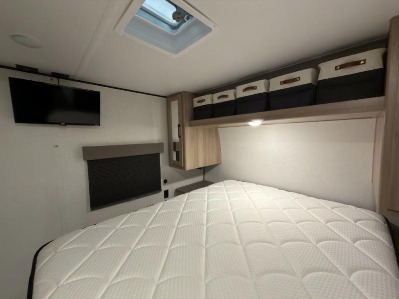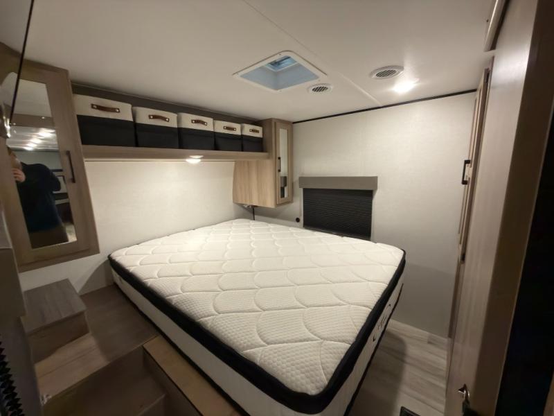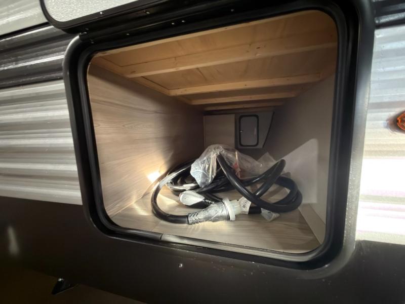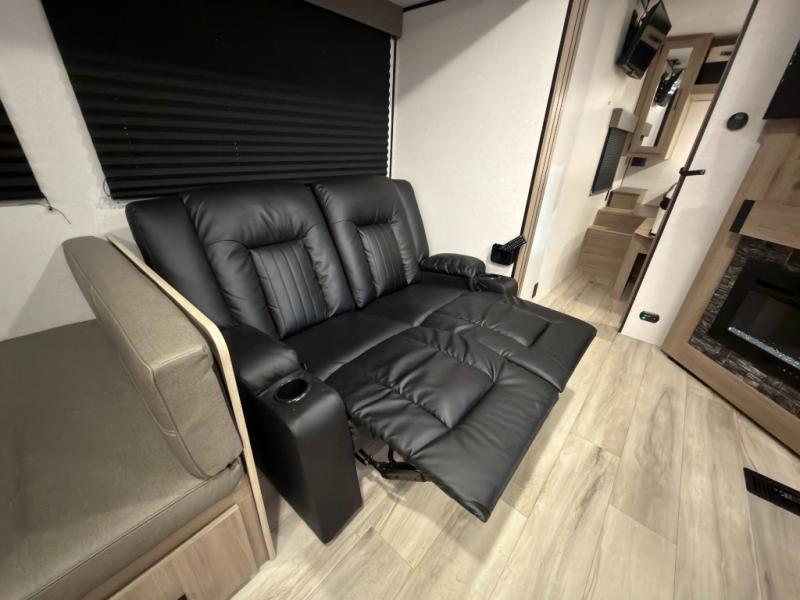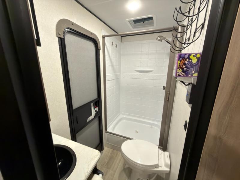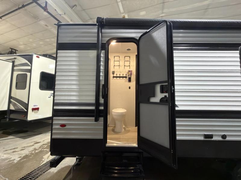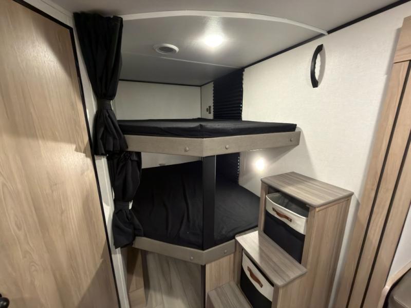 If you're needing additional sleeping space and added comfort in your next RV, this travel trailer is the one! There are double-size bunks with steps in the back for your guests or little ones, and the full bath includes one of the dual entry doors to the unit for added convenience. The combined kitchen and living area is made spacious thanks to the large slide out which houses the sofa and booth dinette. You can make meals on the three burner range or in the air fryer/convection microwave, and there is a 16 cu. ft. 12V refrigerator to keep food fresh. A 50" TV and fireplace features hidden shelves behind it for smart storage space plus there is an entryway pantry for snacks galore! Outside, the 21' power awning will provide shade as you visit in your camp chairs, and there is a 2.6 cu. ft. outdoor refrigerator to keep cold drinks on hand!