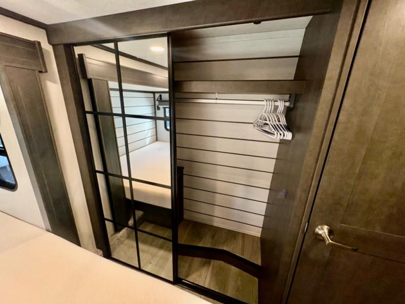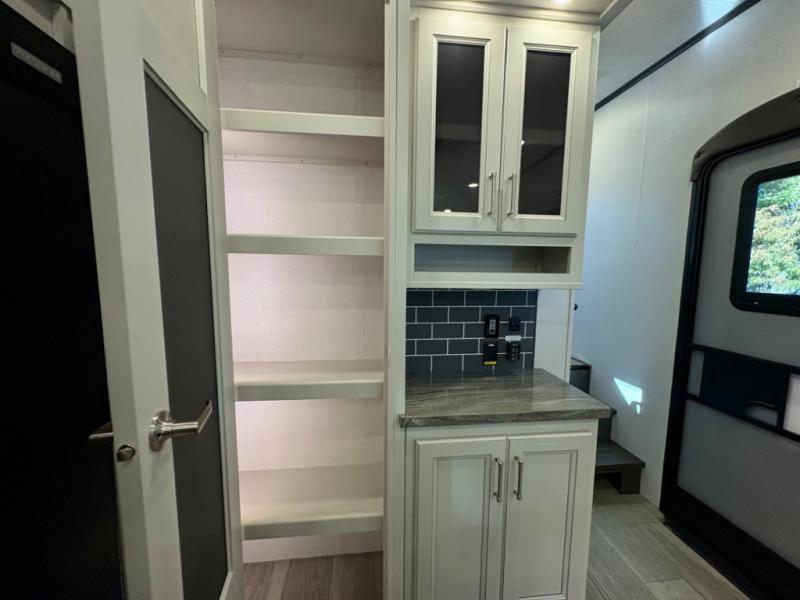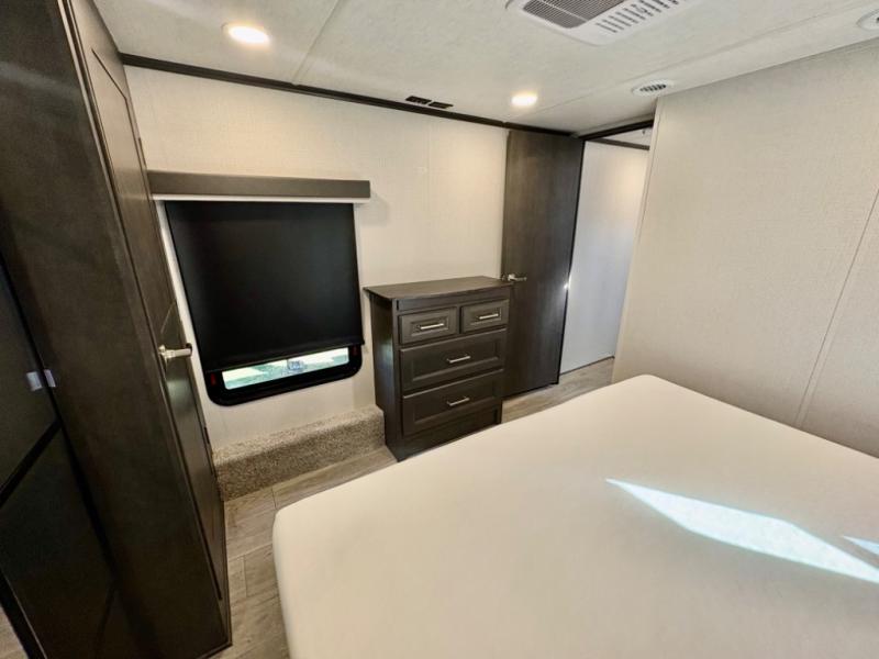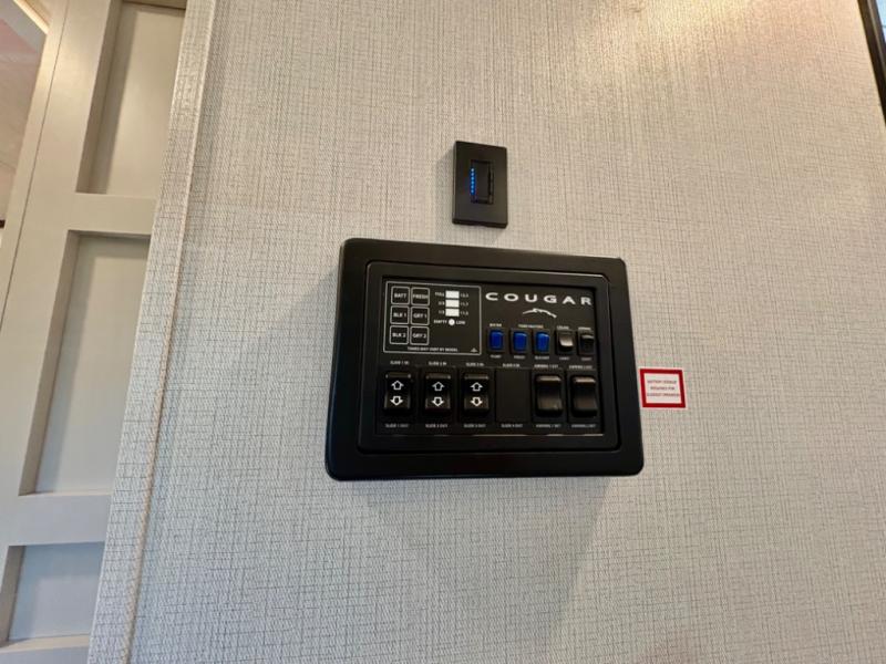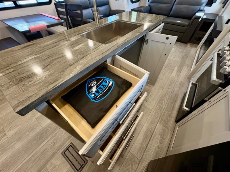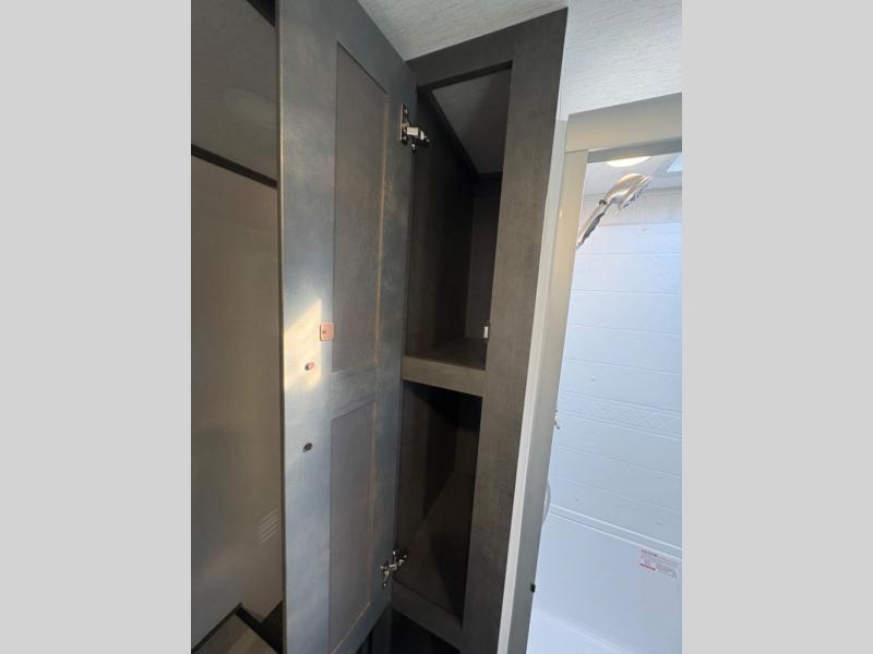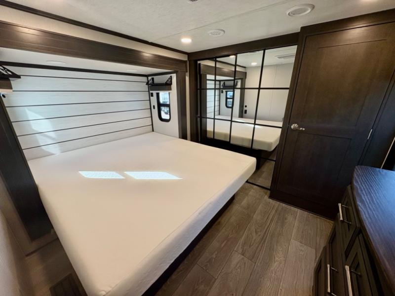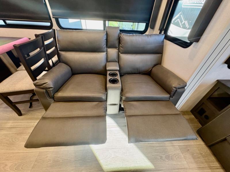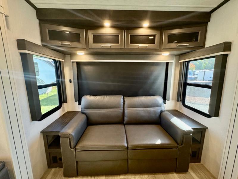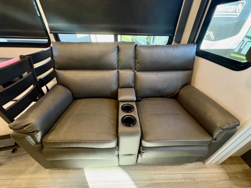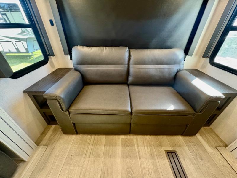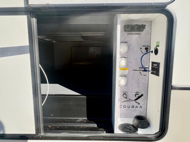 The dual-sink vanity in the full bathroom on this Cougar fifth wheel is what will make your morning routine feel just the same on the road as it does at home! You'll also sleep just as well on the queen-size bed in the front private bedroom, and there is under-bed storage, a full-height wardrobe, and a dresser with hidden storage for all of your personal belongings. As you spend time in the main living area, you'll appreciate having extra space thanks to the set of opposing slides, and the kitchen island will be easy to work around. You'll be able to relax on the tri-fold sleeper sofa and theater seating while you watch the LED HDTV with an pivoting entertainment door and hidden pantry. There is also a booth dinette with storage drawers, convenient shoe storage right as you enter the unit, and an exterior unobstructed pass-thru storage so nothing gets left behind.