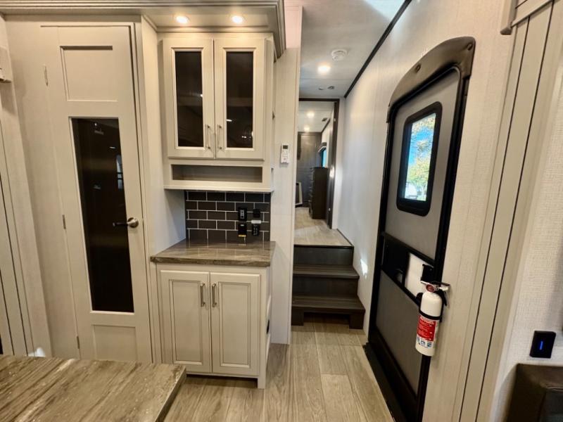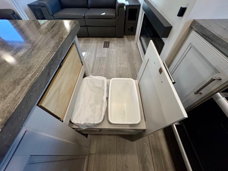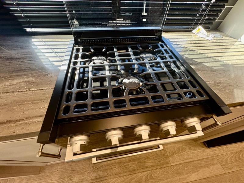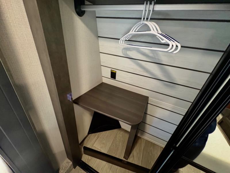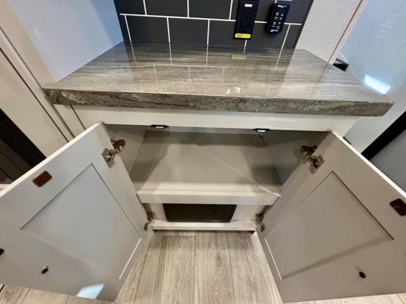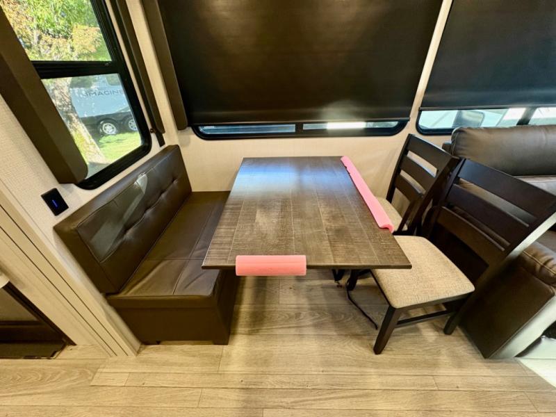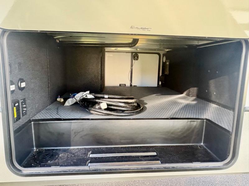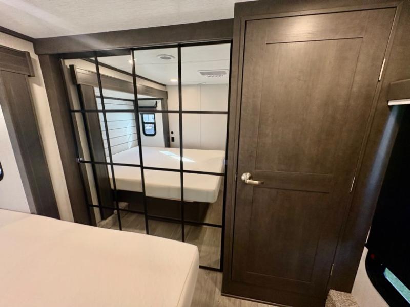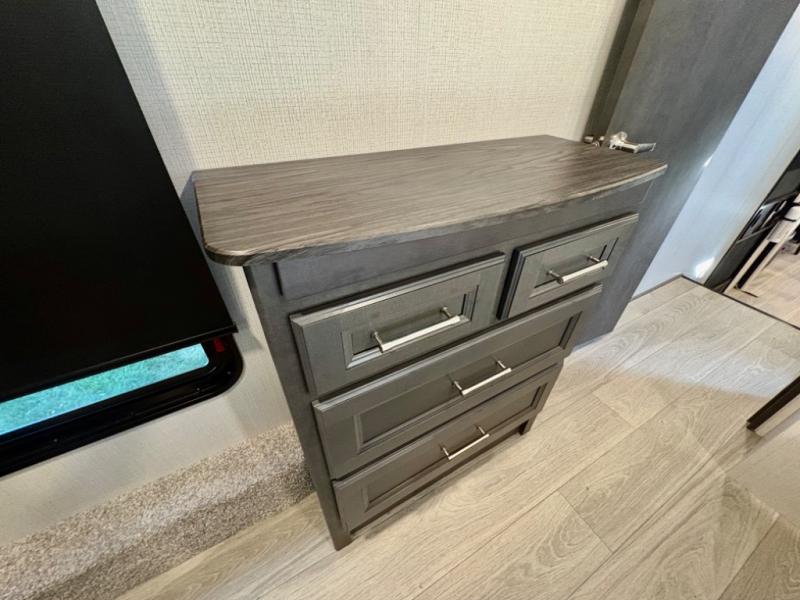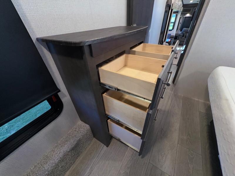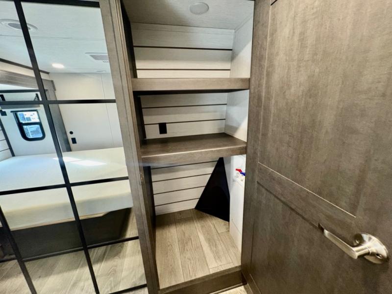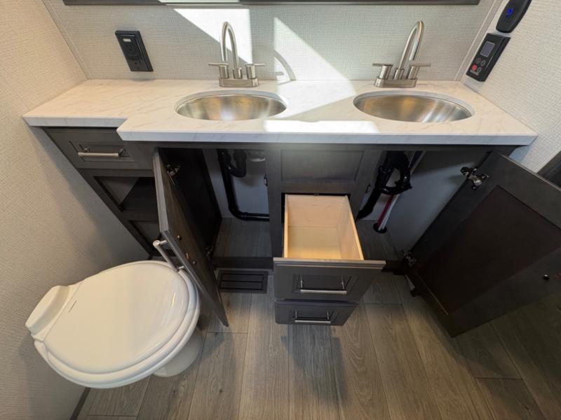 The dual-sink vanity in the full bathroom on this Cougar fifth wheel is what will make your morning routine feel just the same on the road as it does at home! You'll also sleep just as well on the queen-size bed in the front private bedroom, and there is under-bed storage, a full-height wardrobe, and a dresser with hidden storage for all of your personal belongings. As you spend time in the main living area, you'll appreciate having extra space thanks to the set of opposing slides, and the kitchen island will be easy to work around. You'll be able to relax on the tri-fold sleeper sofa and theater seating while you watch the LED HDTV with an pivoting entertainment door and hidden pantry. There is also a booth dinette with storage drawers, convenient shoe storage right as you enter the unit, and an exterior unobstructed pass-thru storage so nothing gets left behind.