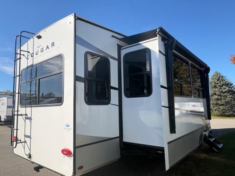 Spend more time having fun and less time worrying about your RV with the Keystone Cougar fifth wheel! These units have all that you will need for excellent vacations. The interior comes with 5/8" one-piece DynaSpan® flooring, tall slide outs for added comfort and head room, night roller shades throughout, and residential, raised-panel hardwood cabinet doors and drawers. You will also enjoy decorative crown molding, a 5,500 BTU electric fireplace with thermostat control and remote, and a Max Air exhaust fan with rain sensor. The exterior is also fully outfitted with a convenience center, friction-hinge entry door, electric four-point auto leveling system, and Lippert SolidStep® on the main entry. Each model is available with the optional Hero Edition. By choosing this edition, you can help support our nation's heros and their families by contributing to the Wounded Warrior Project. This optional package features an industry exclusive full-body paint matte finish, frameless windows, a glass entry door, blackout rims, and green LED exterior accent lighting; see dealer for more details!